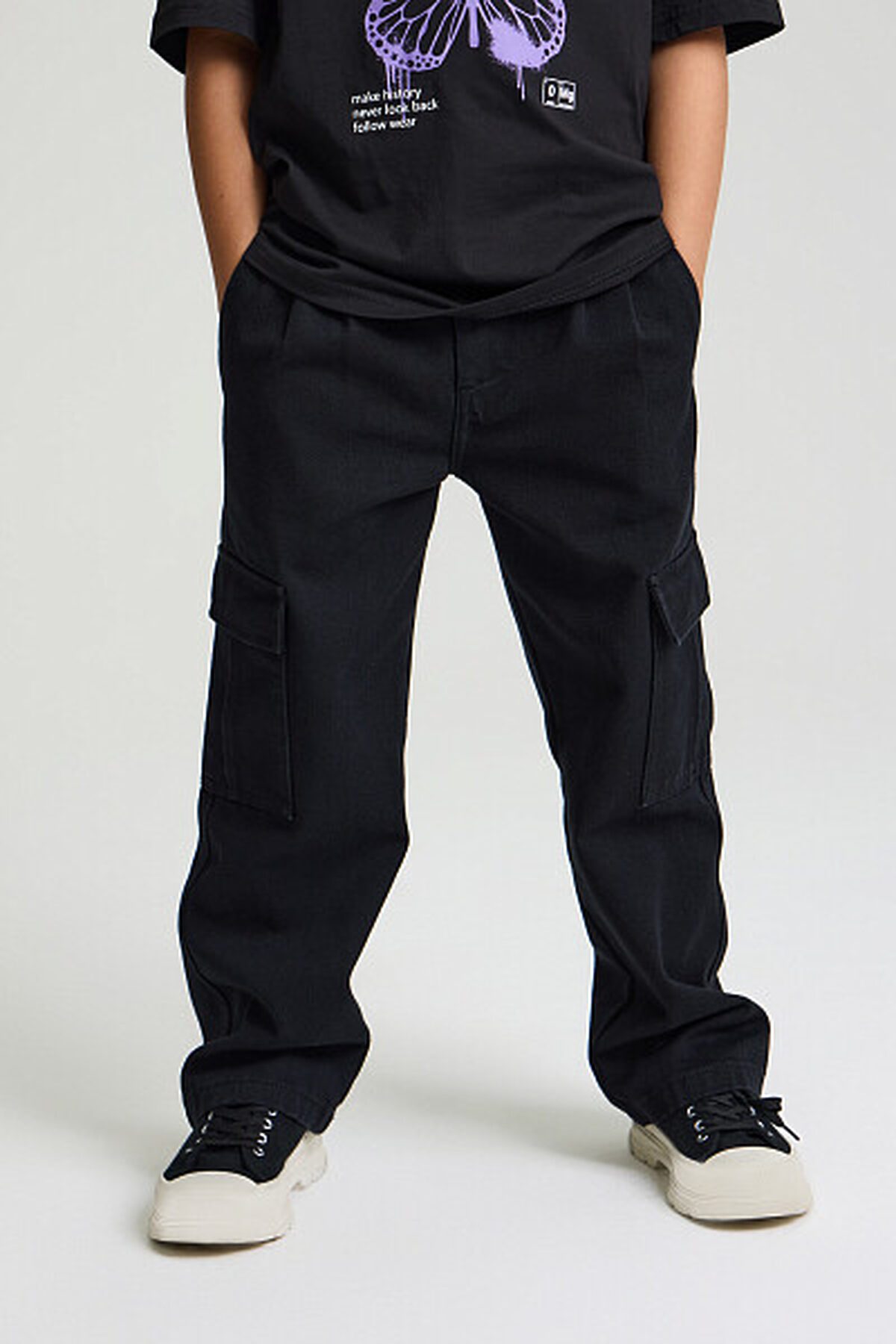 Объемные джинсы-карго с накладными карманами по бокам брючин которые позволяют хранить необходимые мелочи, а качественный деним делает джинсы прочными и долговечными. Резинка в районе талии обеспечит комфортную посадку. Также джинсы оформлены карманами спереди и сзади. С данной моделью легко составить образы в стиле хип-хоп или гранж. Представлены в черном цвете. Размерный ряд от 128 см до 176см.