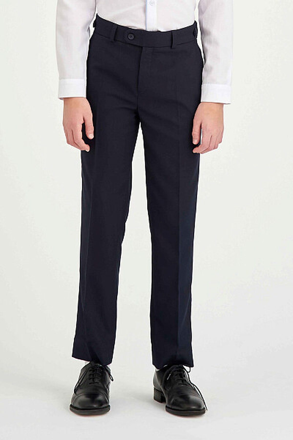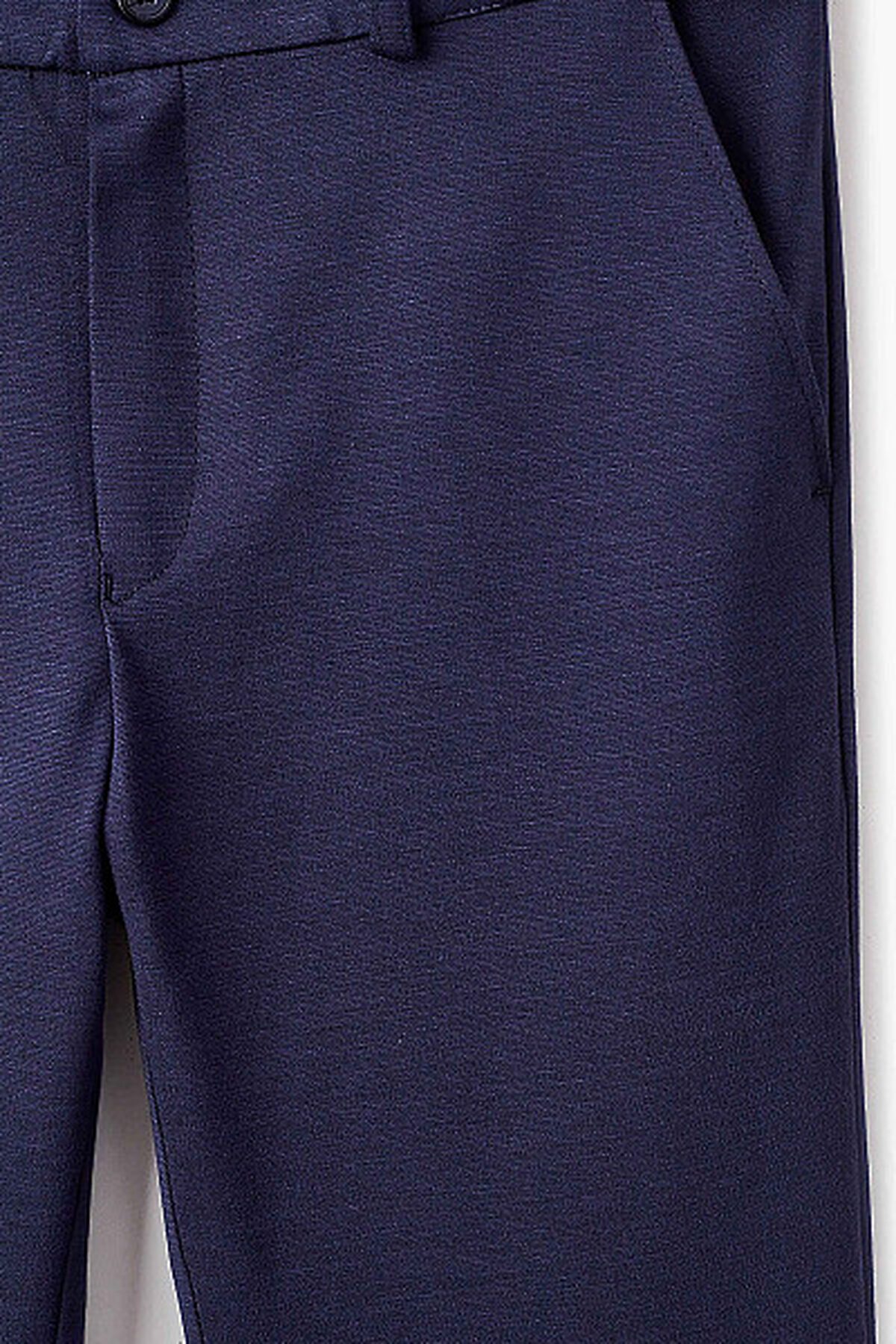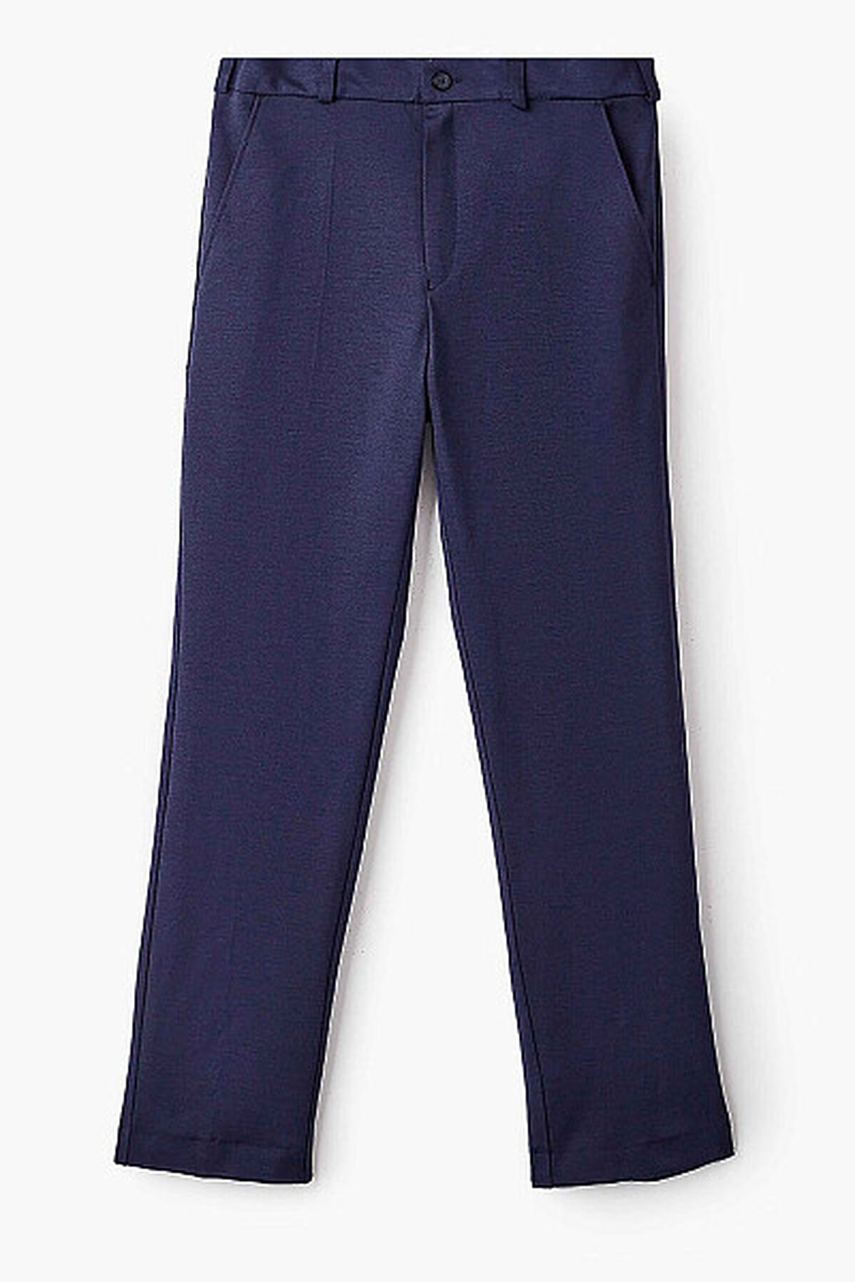 Брюки зауженные из трикотажа джерси для мальчика. Пояс с еврорезинкой сзади. На передней части брюк боковые карманы, горизонтальные защипы и застёжка - гульфик на молнии. На правой задней половинке брюк - карман с узкой листочкой. Отличный вариант на каждый день.