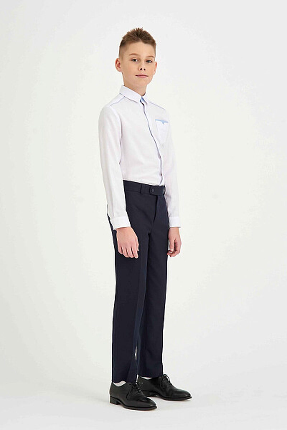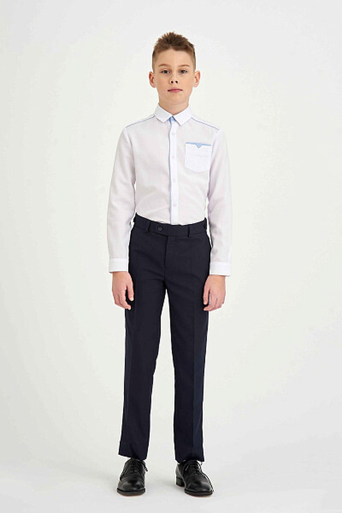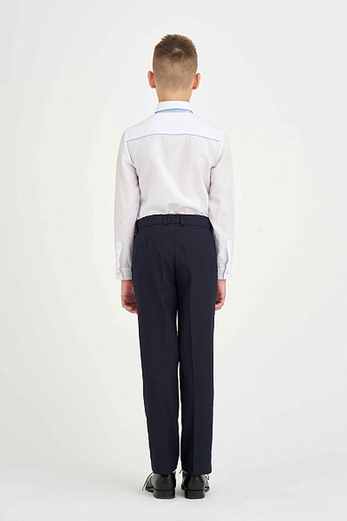 Брюки зауженные из трикотажа джерси для мальчика. Пояс с еврорезинкой сзади. На передней части брюк боковые карманы, горизонтальные защипы и застёжка - гульфик на молнии. На правой задней половинке брюк - карман с узкой листочкой. Отличный вариант на каждый день.