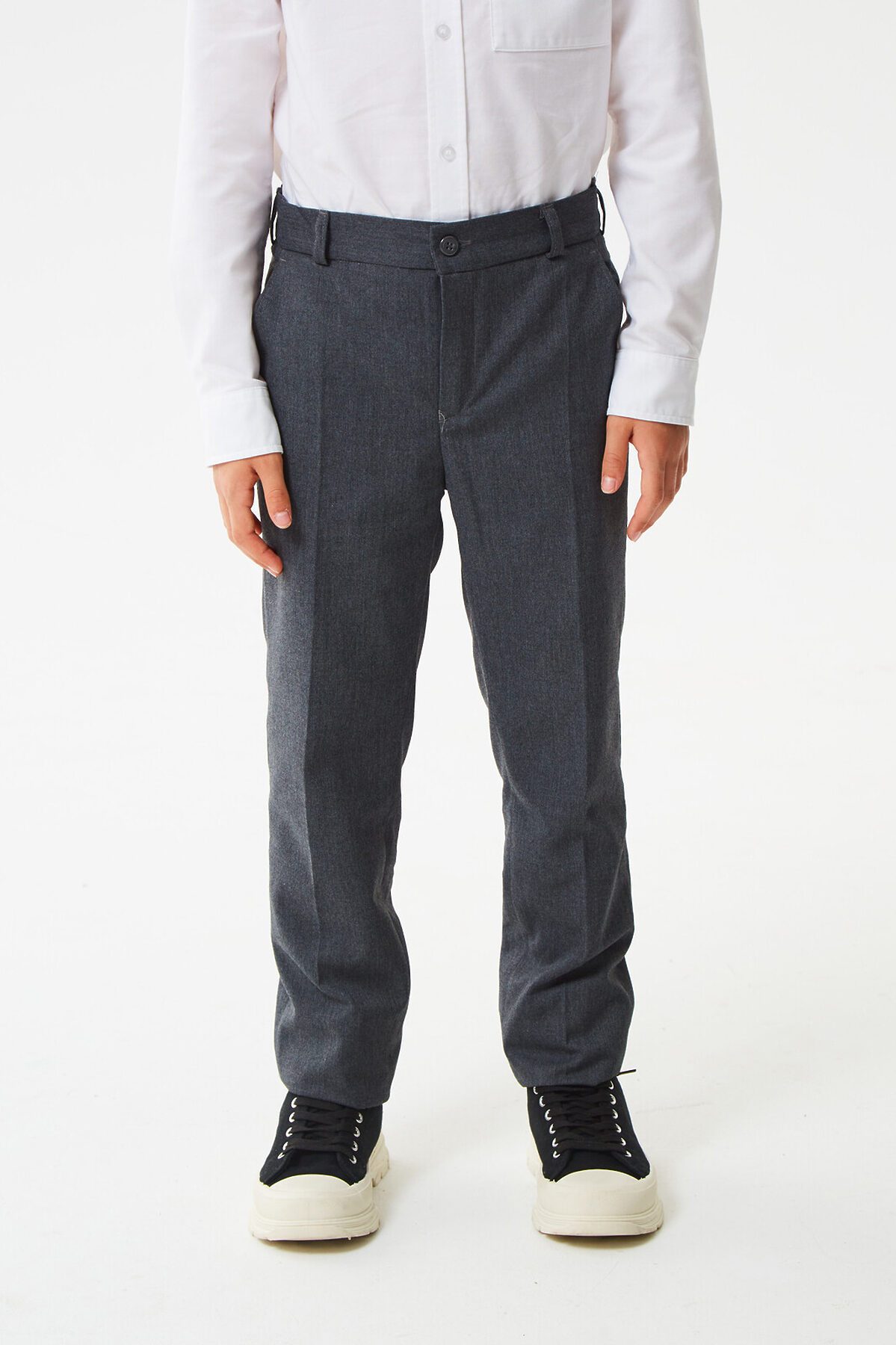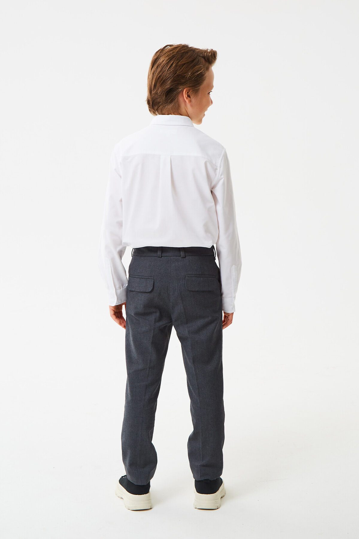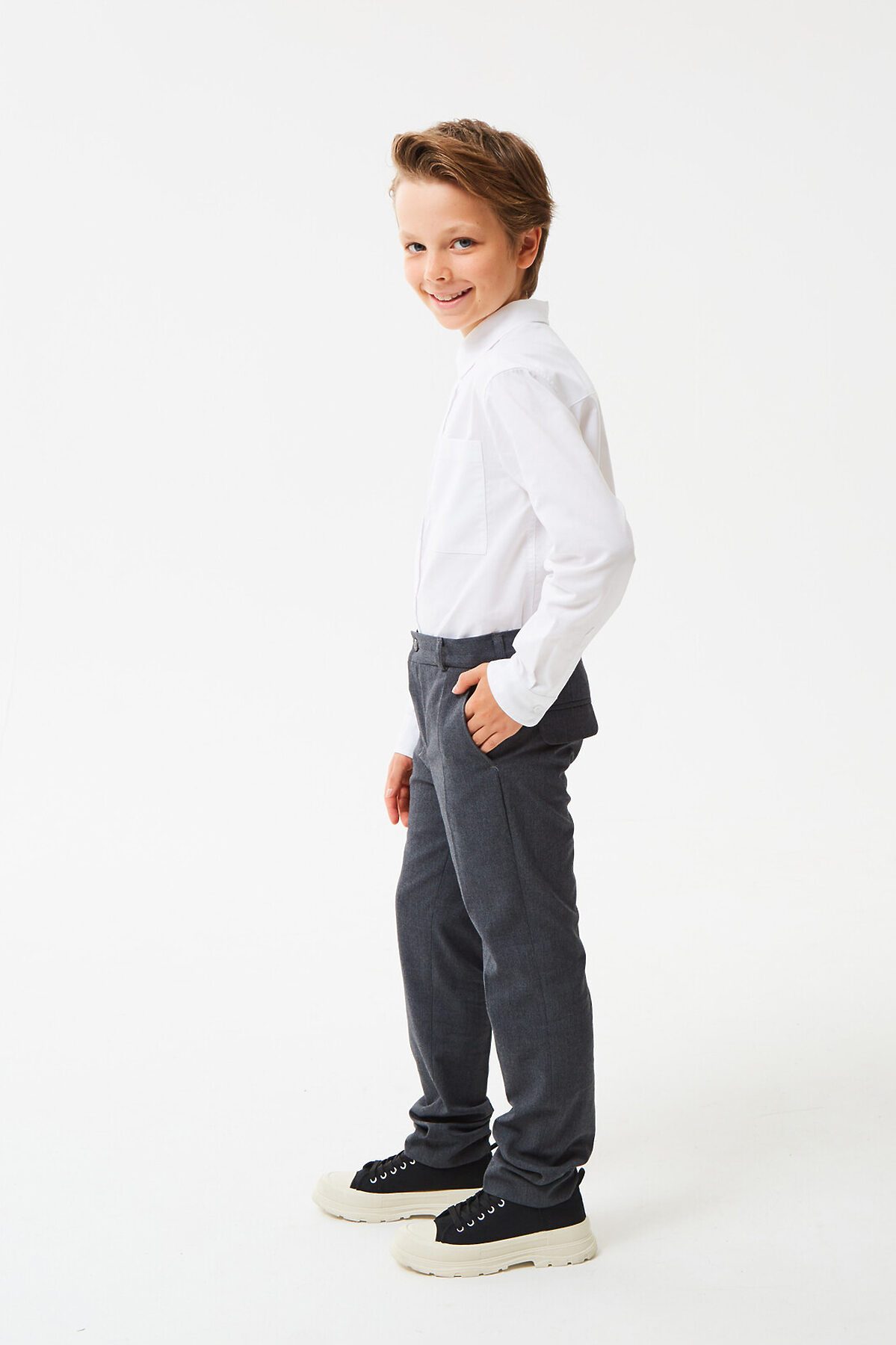 Классические брюки для мальчика из износостойкой и устойчивой к смятию костюмной поливискозы немного зауженные к низу. На передней части брюк боковые карманы, заглаженные стрелки и застёжка - гульфик на молнии. На правой задней половинке брюк - карман с клапаном, на втачном поясе с регулировкой и шлёвками. Отличный вариант на каждый день.