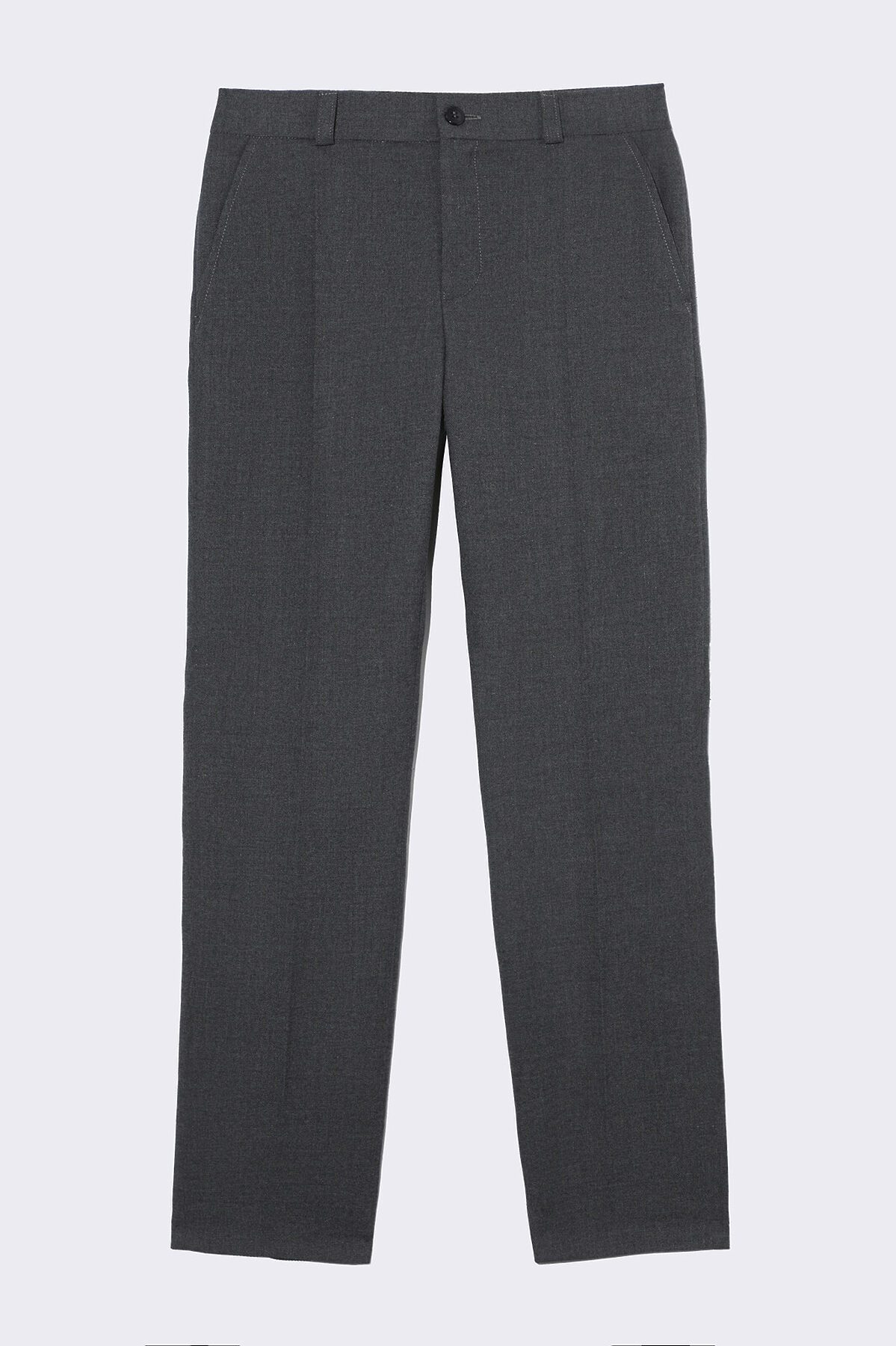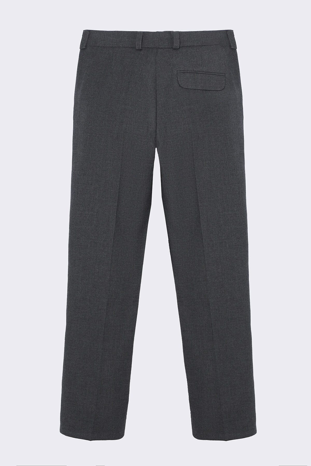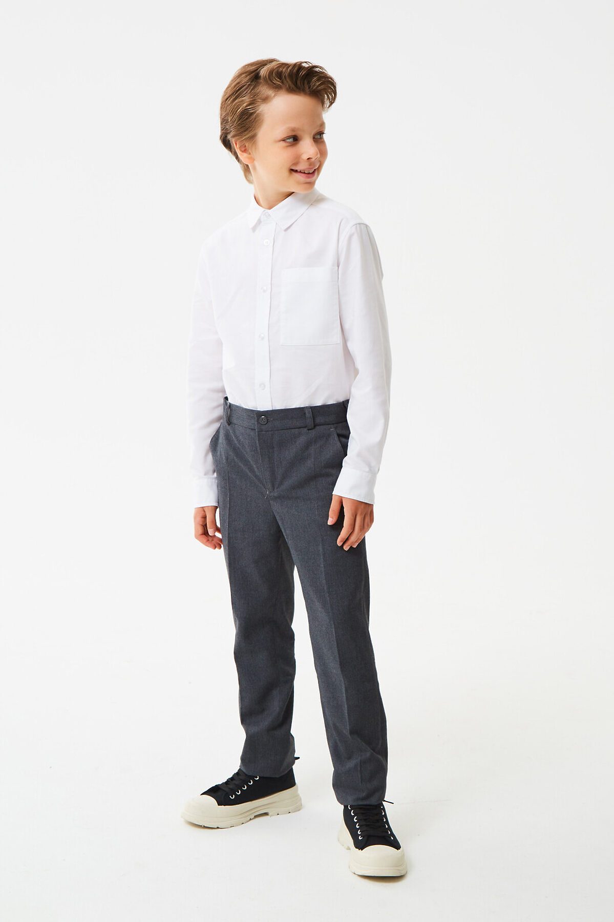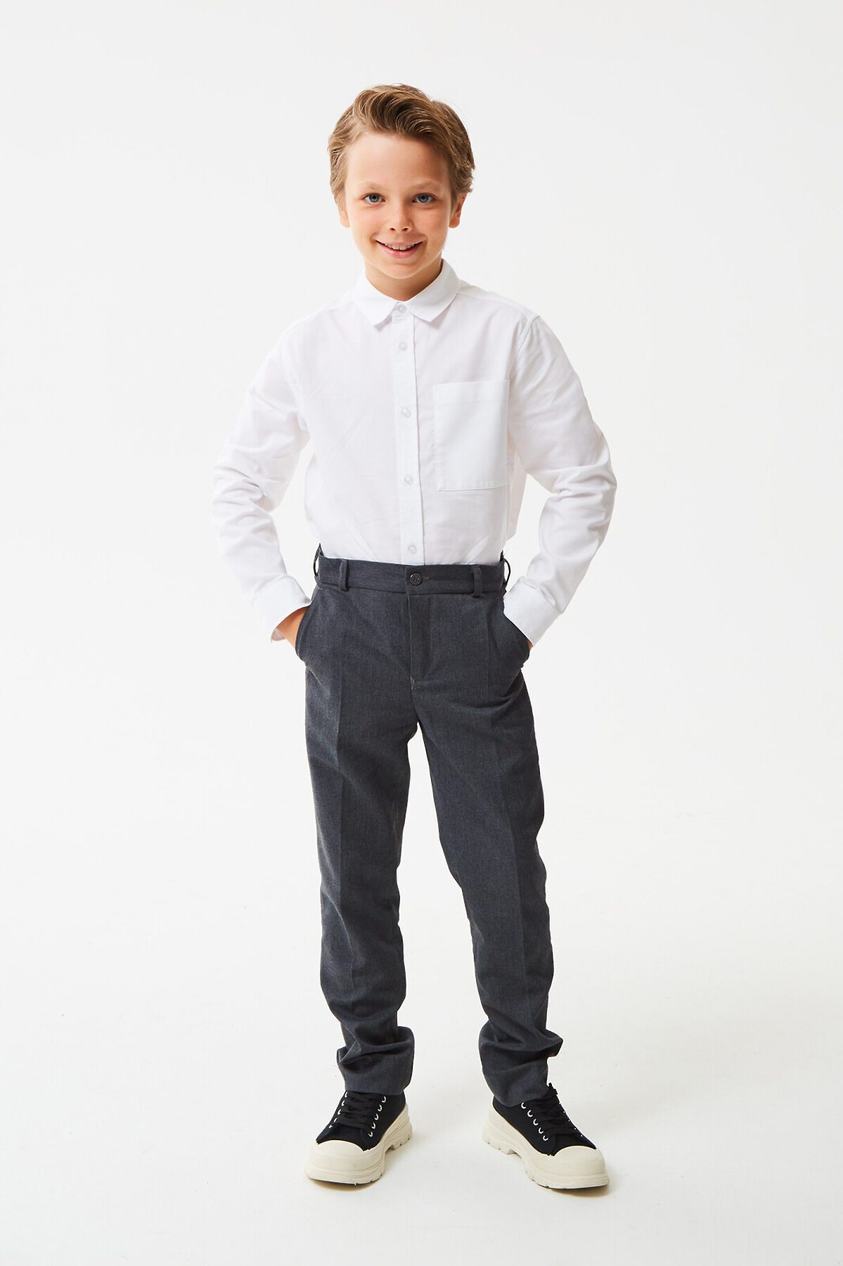 Классические брюки для мальчика из износостойкой и устойчивой к смятию костюмной поливискозы немного зауженные к низу. На передней части брюк боковые карманы, заглаженные стрелки и застёжка - гульфик на молнии. На правой задней половинке брюк - карман с клапаном, на втачном поясе с регулировкой и шлёвками. Отличный вариант на каждый день.
