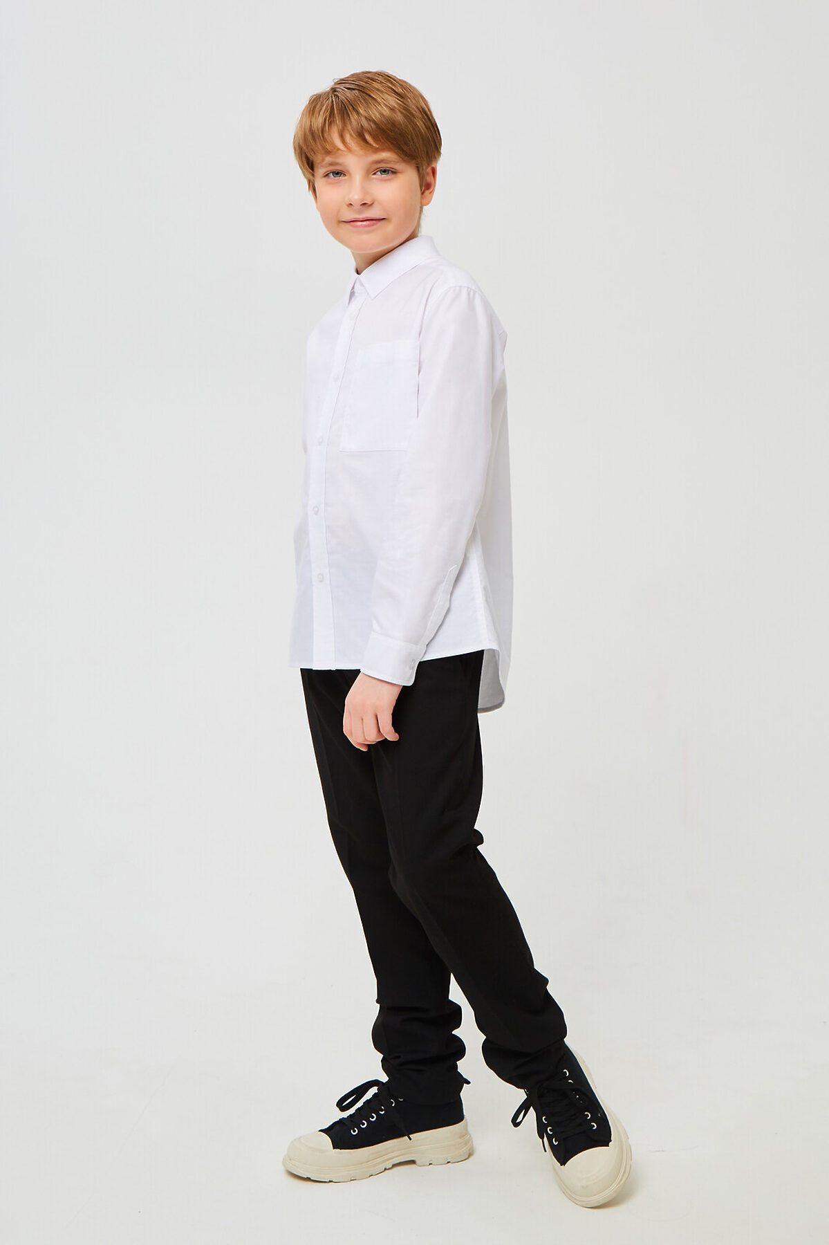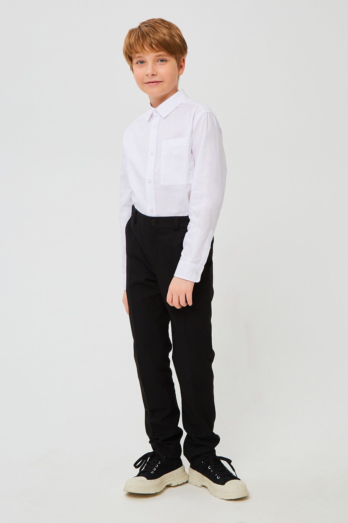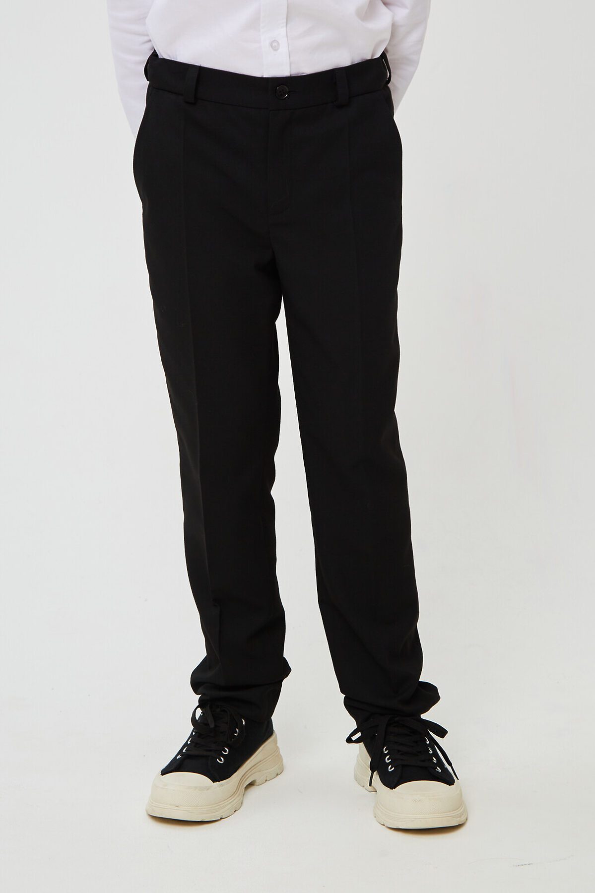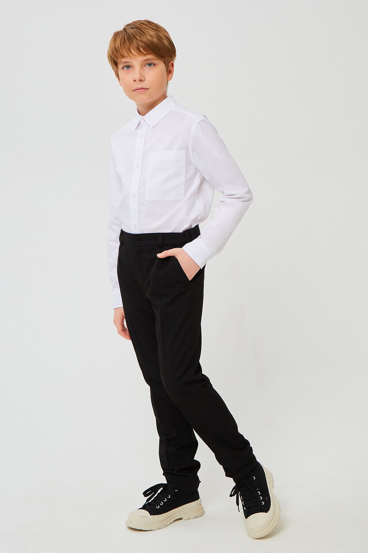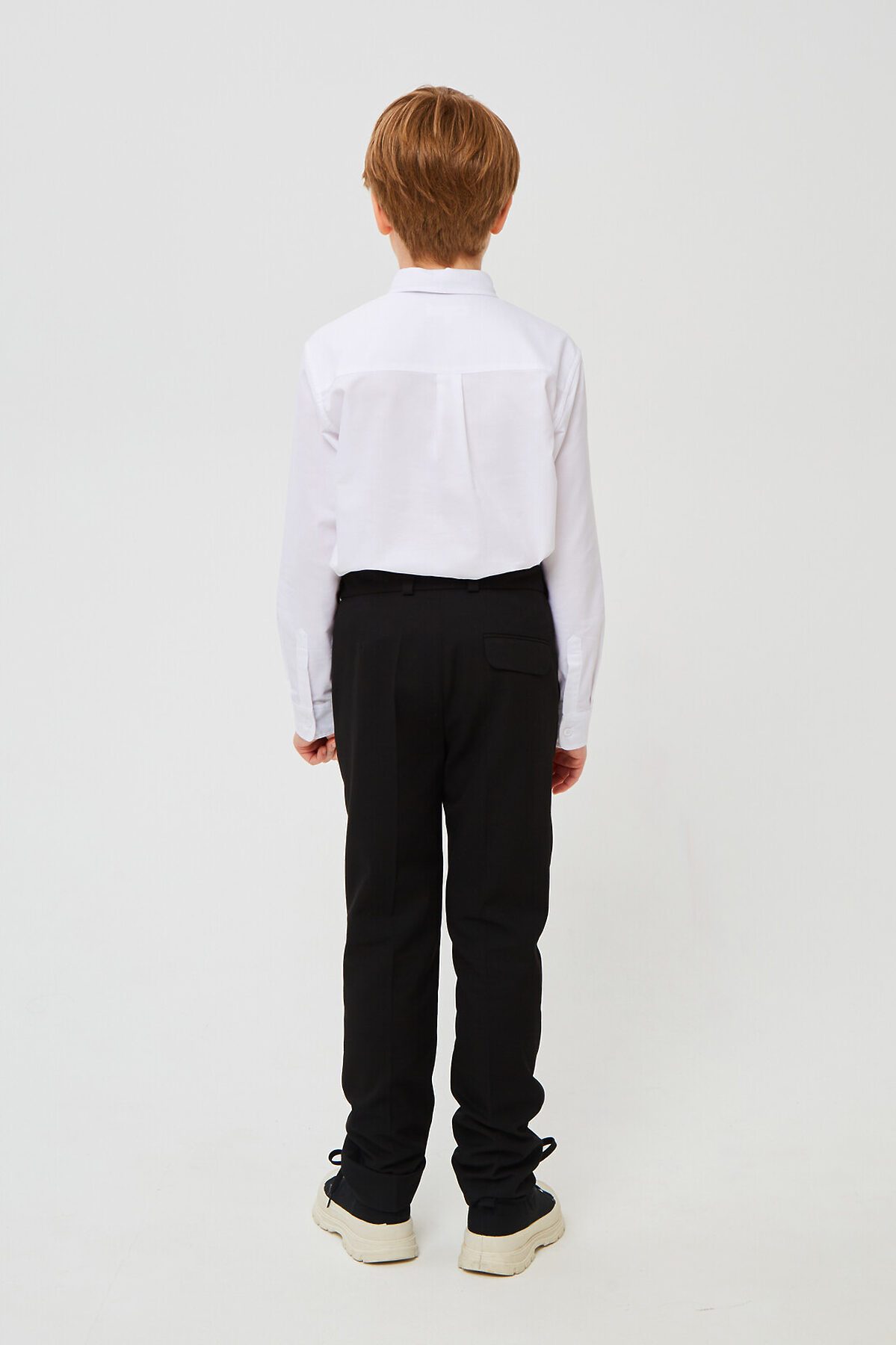 Классические брюки для мальчика из износостойкой и устойчивой к смятию костюмной поливискозы немного зауженные к низу. На передней части брюк боковые карманы, заглаженные стрелки и застёжка - гульфик на молнии. На правой задней половинке брюк - карман с клапаном, на втачном поясе с регулировкой и шлёвками. Отличный вариант на каждый день.