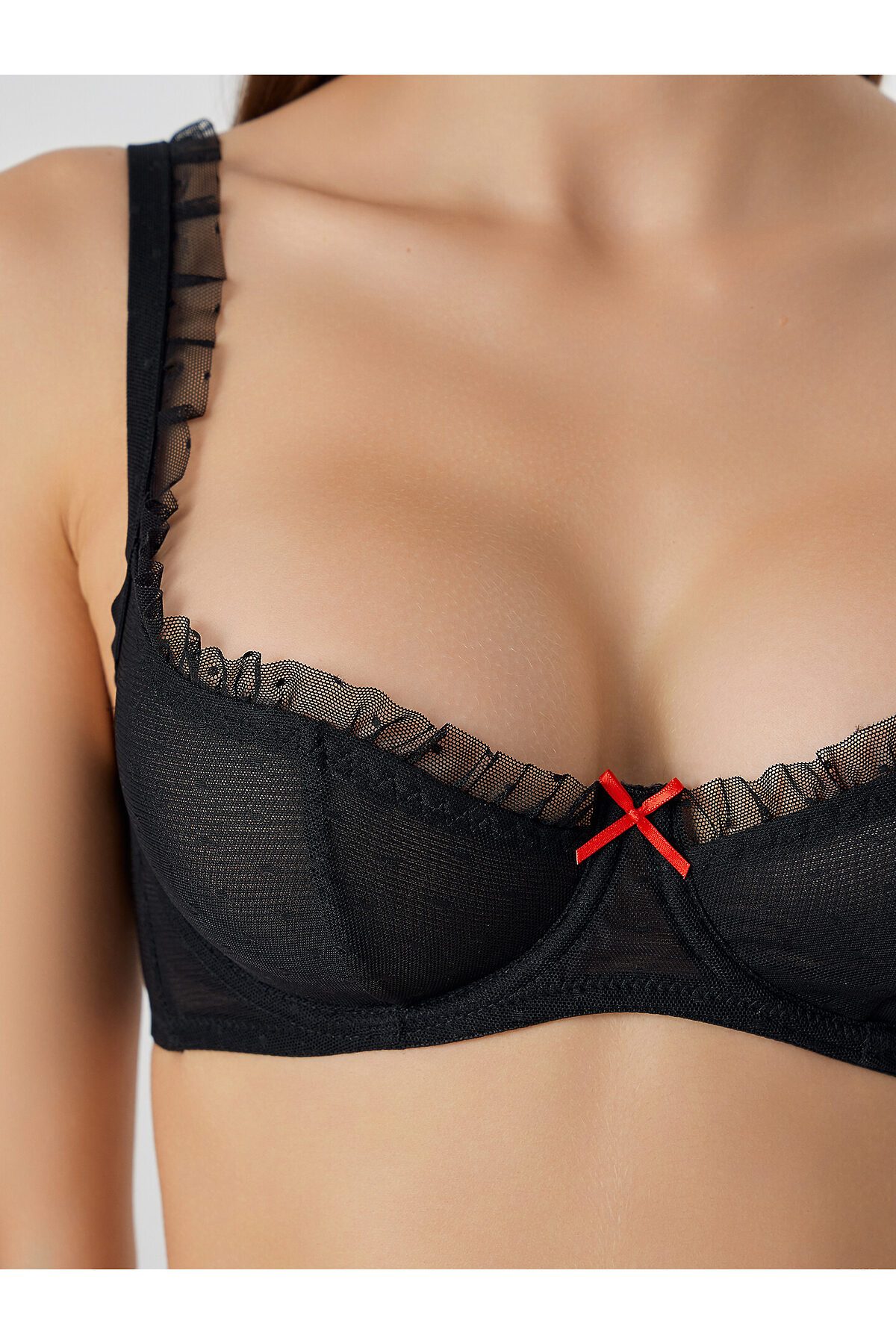 Бюстгальтер женский с мягкими чашками, на стане, на 2и 50 типах каркаса, выполнен из эластичной сетки. Чашки с двойным членением и на подкладке из сетки. По верхнему срезу чашки и на участке бретели выполнена рюша из сетки с сырым краем и со сборкой по срезу притачивания. По шву притачивания рюши на участке чашки стоит эл тесьма 8 мм (жилка тканая Wt4-8, девсел 13460W). Верхний срез стана, пройма чашки и рюша окантованы бейкой из сетки с эластичной тесьмой 10 мм (жесткая без/зуба WTWE1-10, девсел 487W) внутри. Нижний срез стана обработан в два приема эл тесьмой 10 мм (жесткая без/зуба WTWE1-10, девсел 487W). Ластовица и деталь стана на подкладке из монокапрона. Бочки отрезные, в бочках пластины. Бретель регулируемая 10мм и 15мм (SWE3, девсел 1979W) по размерам. Пластиковые кольца-регуляторы 10 мм и 15 мм по размерам. Застежка крючки-петли по размерам: двойная 38 мм и тройная 57 мм. Бантик по центру по верхнему срезу ластовицы.