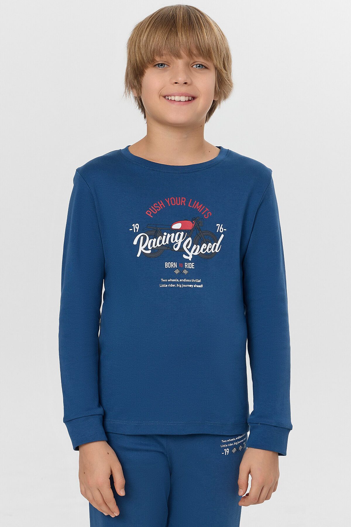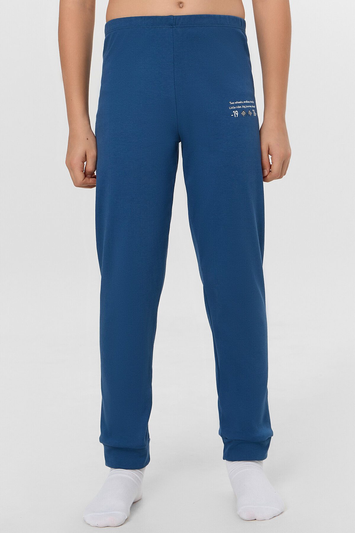 Комплект для мальчиков из джемпера и брюк. Джемпер свободного силуэта. Перед и спинка цельнокроеные. Горловина круглой формы с обтачкой из основного полотна. Рукава втачные, низ рукавов с притачными манжетами. Низ джемпера обработан швом в подгибку. Брюки прямые, с притачными манжетами. Пояс цельнокроеный, с втаченной эластичной тесьмой.