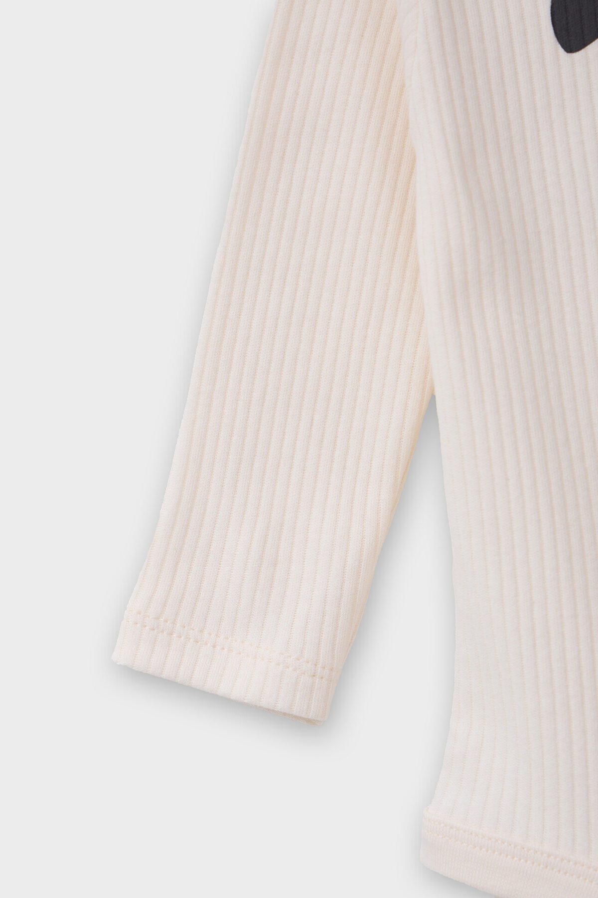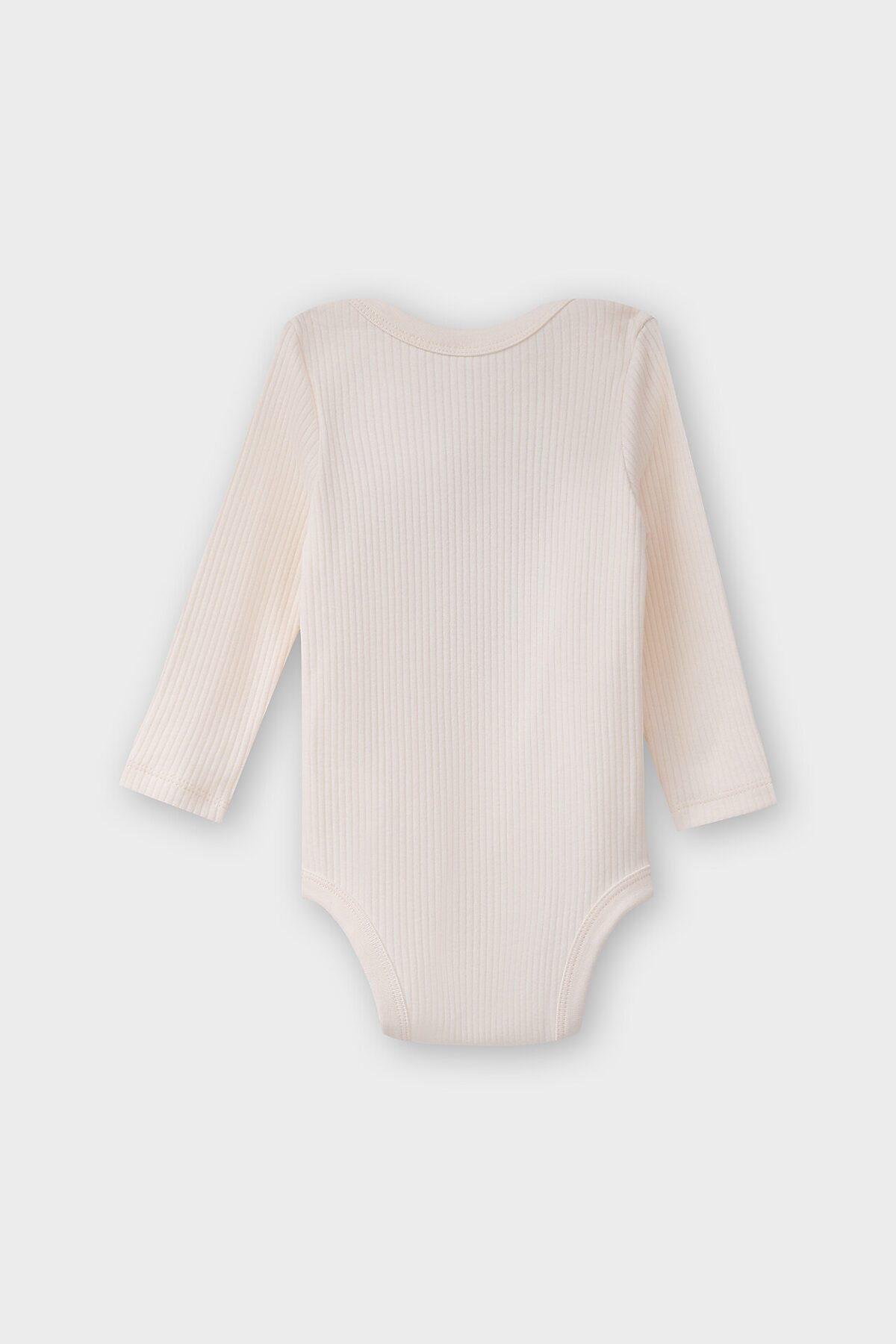 Комплект состоит из боди и ползунков. Боди выполнено из интерлока в рубчик. Спинка и перед цельнокроенные. Спинка с переходящей кокеткой и цельнокроенной ластовицей. Горловина круглая, окантована бейкой из птрикотажной рибаны 1*1 R-59, R11-049.01.230, 97% хлопок; 3% эластан, 230 гр, 165 см. Припуски верхних и нижних срезов переда и спинки окантованы бейкой из трикотажной рибаны 1*1 R-59, R11-049.01.230, 97% хлопок; 3% эластан, 230 гр, 165 см. Рукава длинные, втачные, одношовные. Низ рукавов обработан на 2х игольной плоскошовной машине швом в подгибку. Нижние края изделия по середине фиксируются на книпперы 9 мм- 3 шт. Ползунки детские из интерлока в рубчик. Пояс цельнокроенный, с эл.тесьмой внутри (внутрення резина 20RV), ширина 20 мм. Низ изделия обработан на 2х игольной плоскошовной машине швом в подгибку.