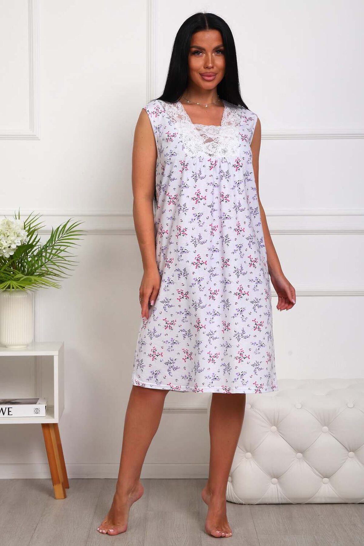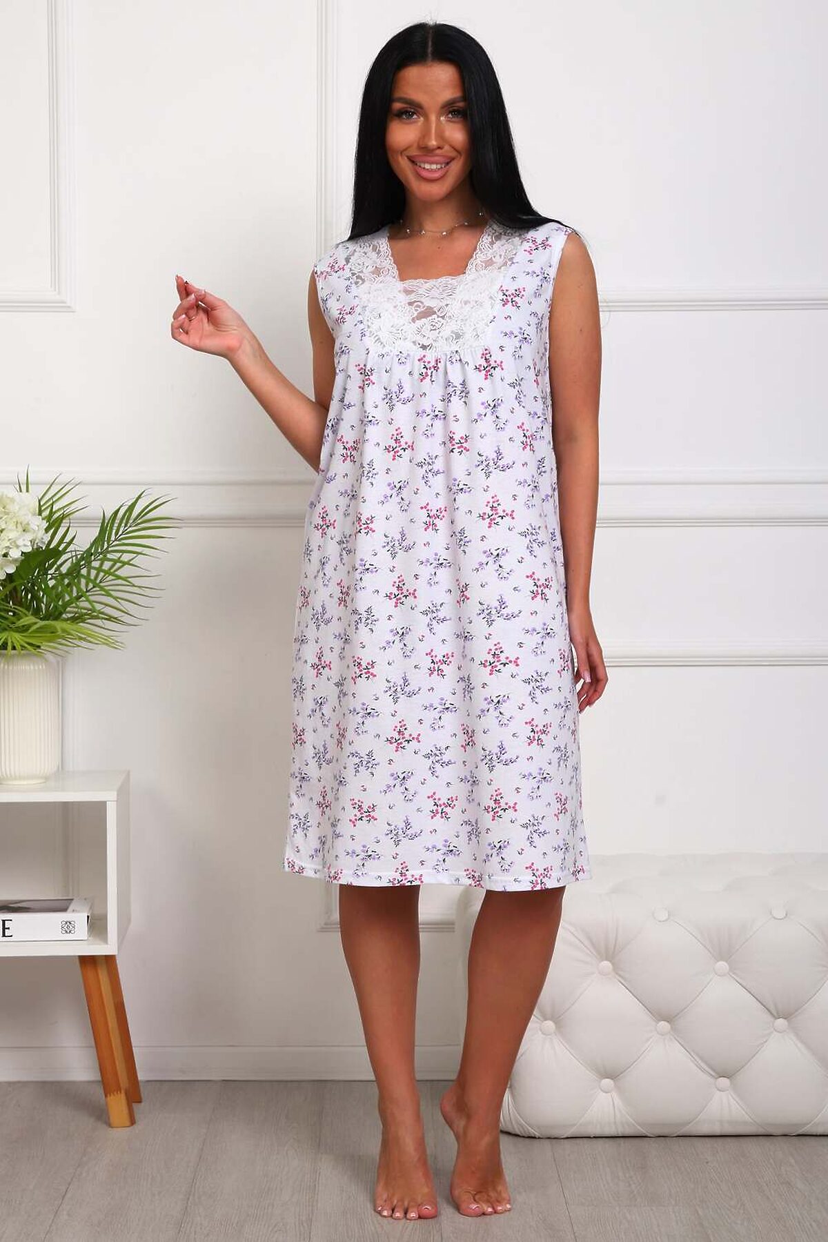 Сорочка женская из натурального набивного полотна. Хлопок 100%. Силуэт прямой. Длинна чуть ниже колена. Горловина фигурной формы, отделана кружевом. По линии груди легкая сборка. По спинке рельефы. Без рукава. Пройма и горловина спинки обработаны окантовкой. Низ изделия прямой.