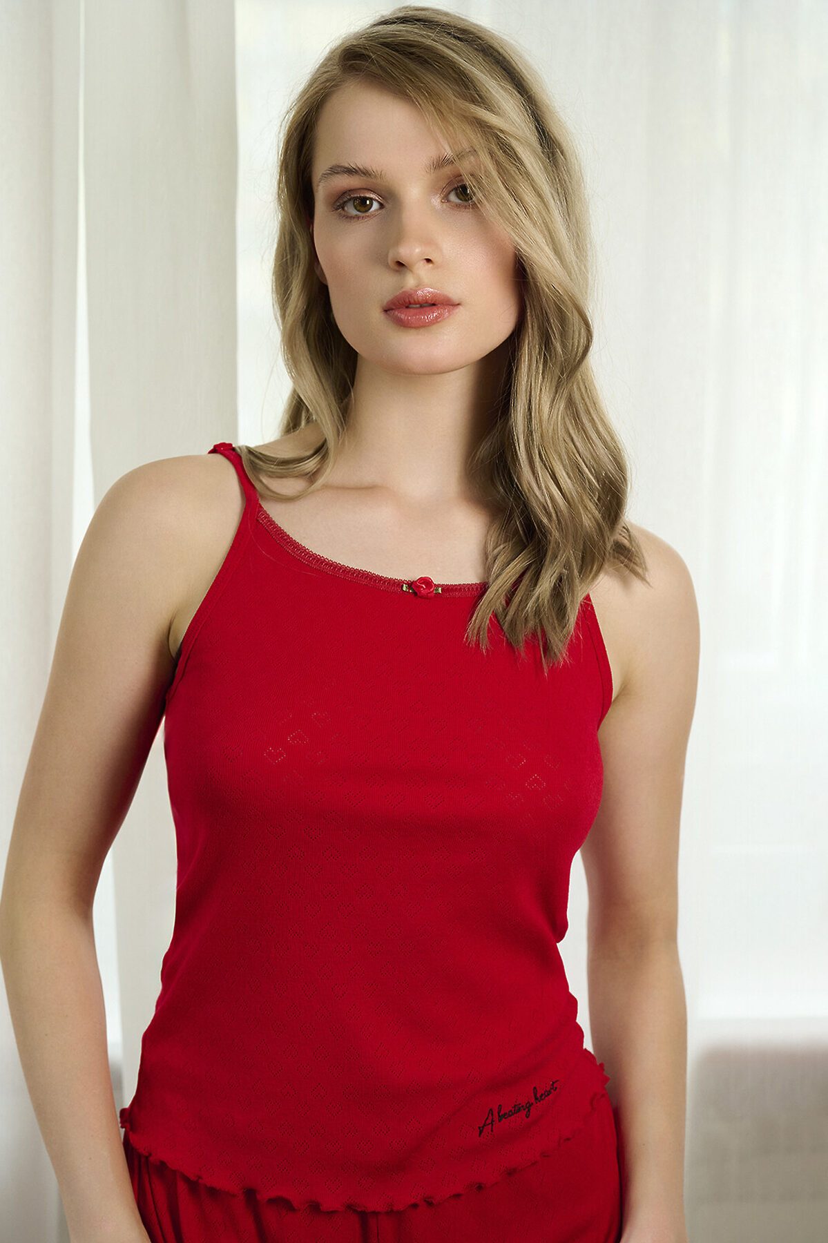 Пижама женская изготовлена из полиэстера с добавлением хлопка и вискозы. В комплекте майка с шортами. Майка на тонких регулируемых бретелях имеет декоративный элемент в зоне декольте. Шорты с аналогичным декоративным элементом держатся на талии тонкой эластичной резинкой. Пижама выполнена в красном цвете, напоминающем спелую клубнику. Комплект из майки с шортами идеально подходит для домашнего отдыха и сна, обеспечивая комфорт и приятные тактильные ощущения. Параметры модели на фото: 83-60-89. Рост модели на фото: 173 см.