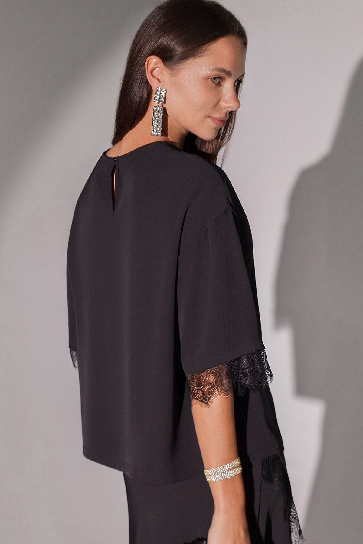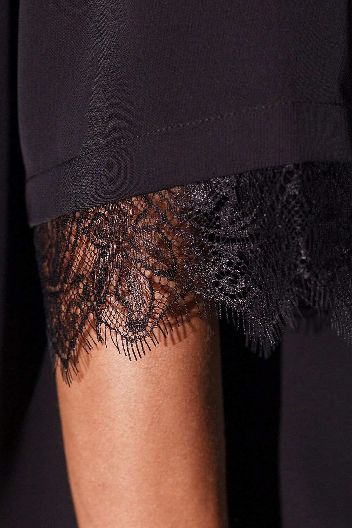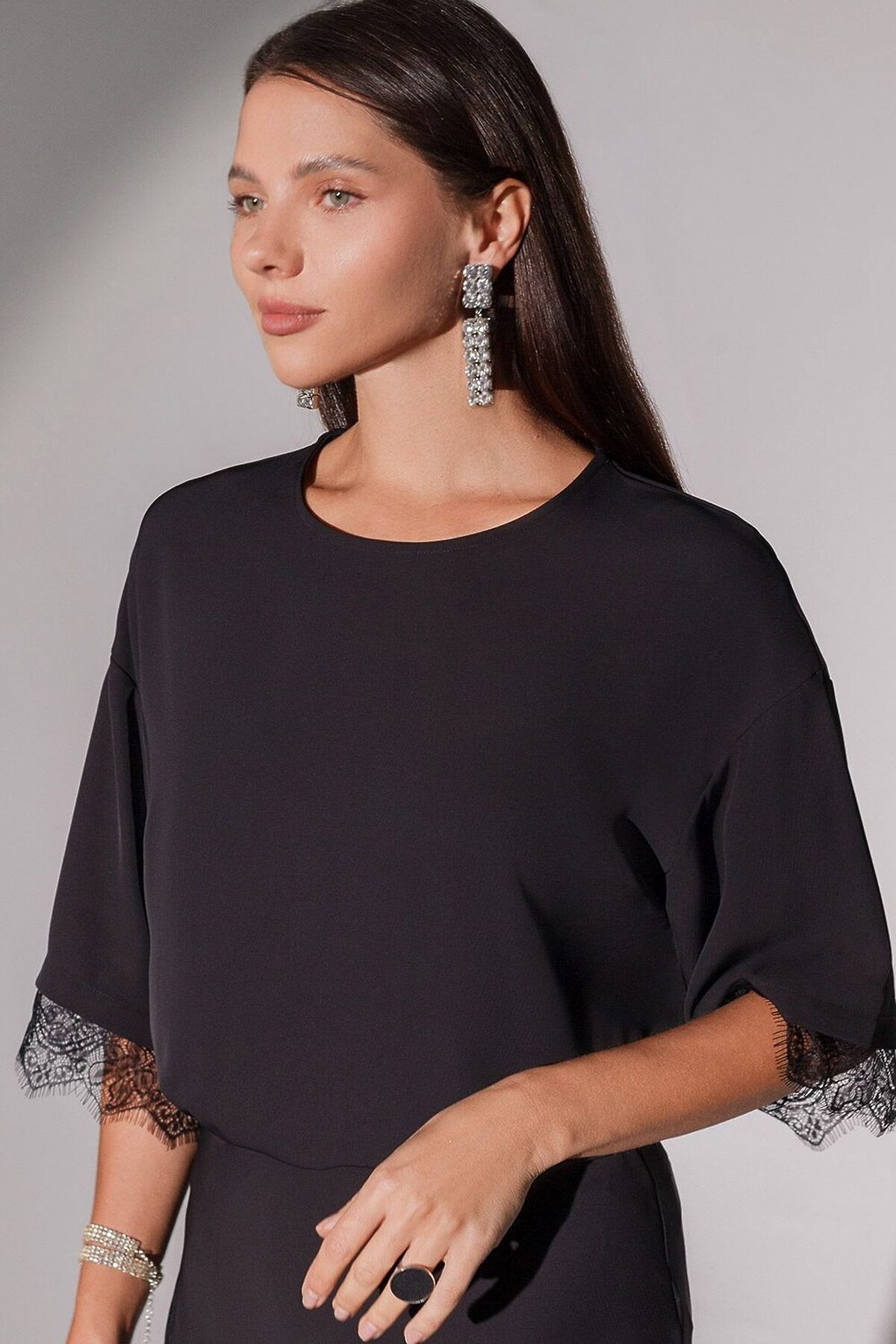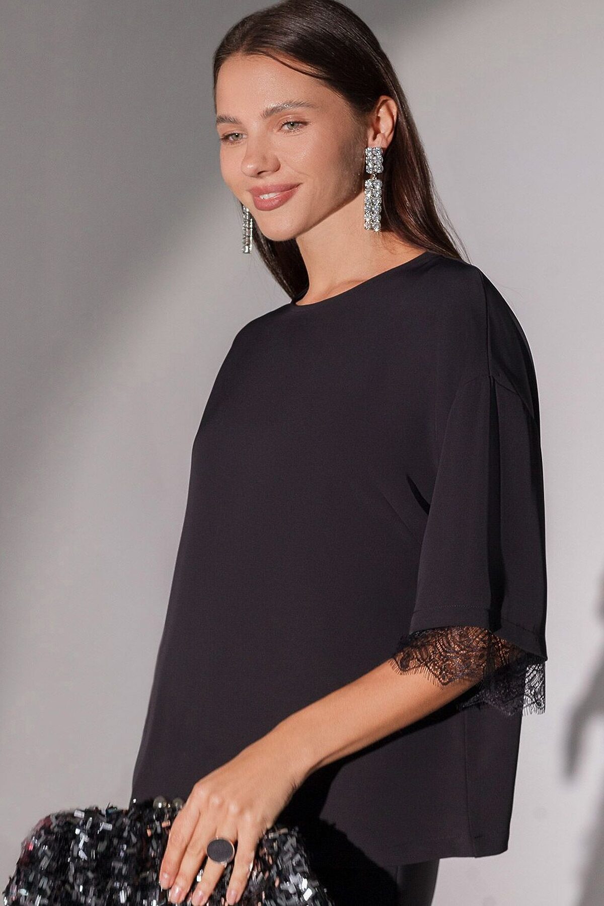 Свободная блузка черного цвета из креп-шифона отличается изящным кроем и особым вниманием к деталям. Блузка с круглым вырезом и спущенной линией плеча создает элегантный образ, идеально подходящий для делового дресс-кода или праздничного мероприятия. Натуральная ткань обеспечивает приятное и комфортное ощущение на теле, позволяя коже дышать в течение всего дня, сохраняет форму и презентабельный вид даже после длительного ношения. Широкие рукава свободно струятся, подчеркивая нежную текстуру материала и придавая образу легкость. Блузка идеально подойдет на большие размеры, в ней вы будете чувствовать себя уверенно. Особый акцент сделан на кружеве на рукавах, которое добавляет стильной блузке изящности и подходит для различных случаев. Блузка оверсайз отлично впишется в гардероб для полных женщин благодаря продуманному фасону и универсальному дизайну. Прямой фасон блузки делают ее универсальной - легко сочетать с классическими брюками или юбкой, а круглый вырез и свободные рукава с изящным кружевом подчеркив