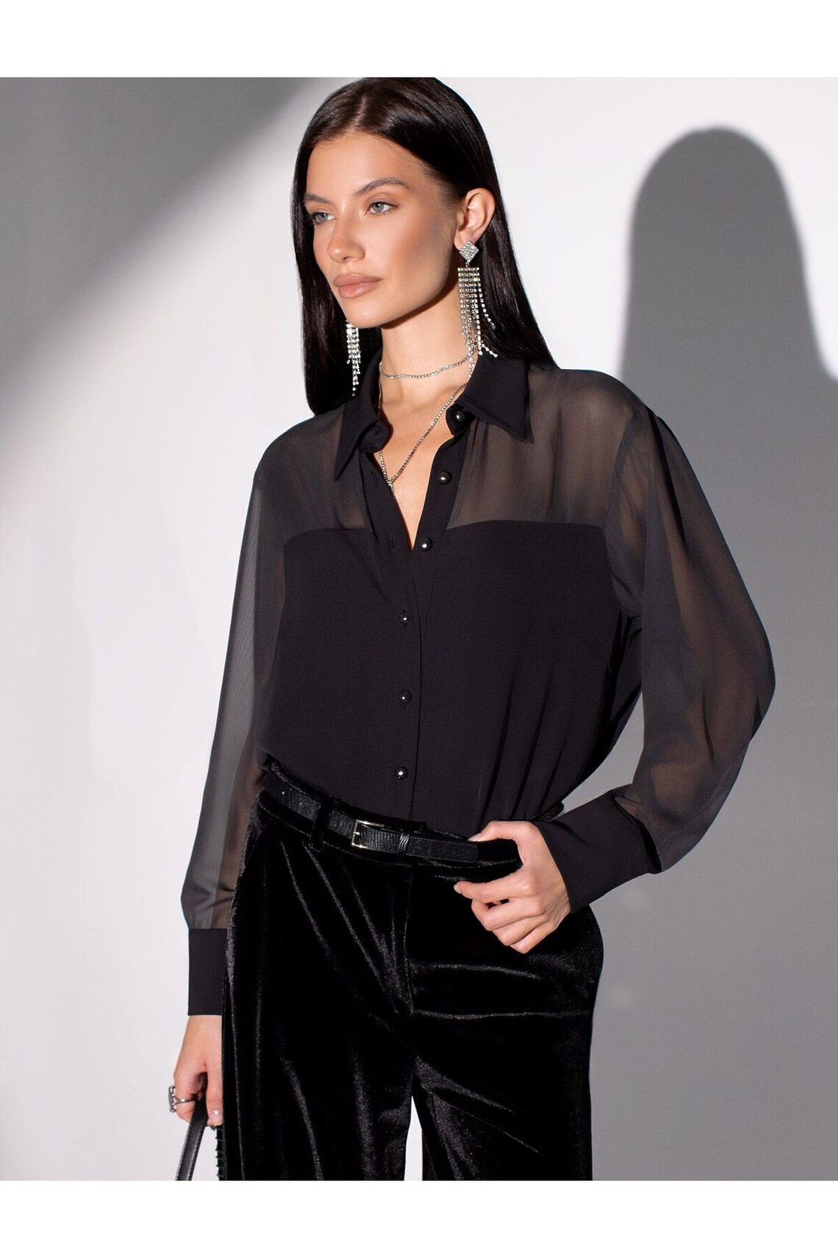 Элегантная блузка черного цвета создана для женщин, которые ценят стиль и комфорт каждый день. Полупрозрачный шифон в верхней части блузки придает образу легкость и утонченность, подчеркивая индивидуальность в любой ситуации. Такая нарядная блузка моментально преобразит повседневный лук, делая его более выразительным и женственным. Плотная ткань блузки красиво струится по фигуре, подчеркивая женственность. Оригинальный крой и продуманная отделка позволяют сочетать блузку с брюками, юбками или джинсами — вы всегда будете выглядеть свежо и современно. Текстура ткани обеспечивает максимальное удобство, а полупрозрачная структура добавляет загадочности без излишней откровенности. Стильная модель подходит как для деловых встреч, так и для прогулок по городу или вечерних мероприятий. Благодаря универсальности фасона легко создаются новые комбинации в зависимости от настроения и случая.
