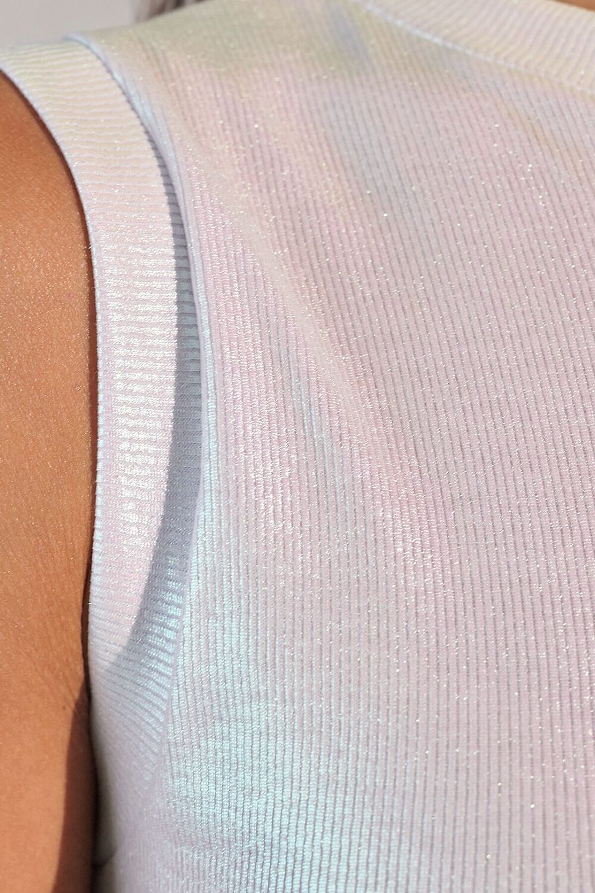 Эффектный топ перламутрового цвета с закрытым декольте идеально подходит для офиса, вечерних мероприятий и повседневной носки. Качественный материал содержит натуральный хлопок, благодаря чему ткань мягкая, дышащая и приятная на ощупь. Добавление эластана обеспечивает эластичность и позволяет изделию хорошо садиться на любую фигуру, в том числе и большие размеры. Ткань в мелкий рубчик вытягивает силуэт. Формоустойчивость материала сохраняет аккуратный внешний облик даже после многочисленных стирок. Трендовый матовый металлизированный эффект создает сияющий блеск без излишней яркости — это делает топ нарядным и красивым как для праздничного события, так и для повседневной носки в комплекте с деловым костюмом или джинсами. Широкие лямки обеспечивают дополнительный комфорт в течение всего дня. Круглый ворот подчеркивает линию шеи, добавляя образу изысканности.