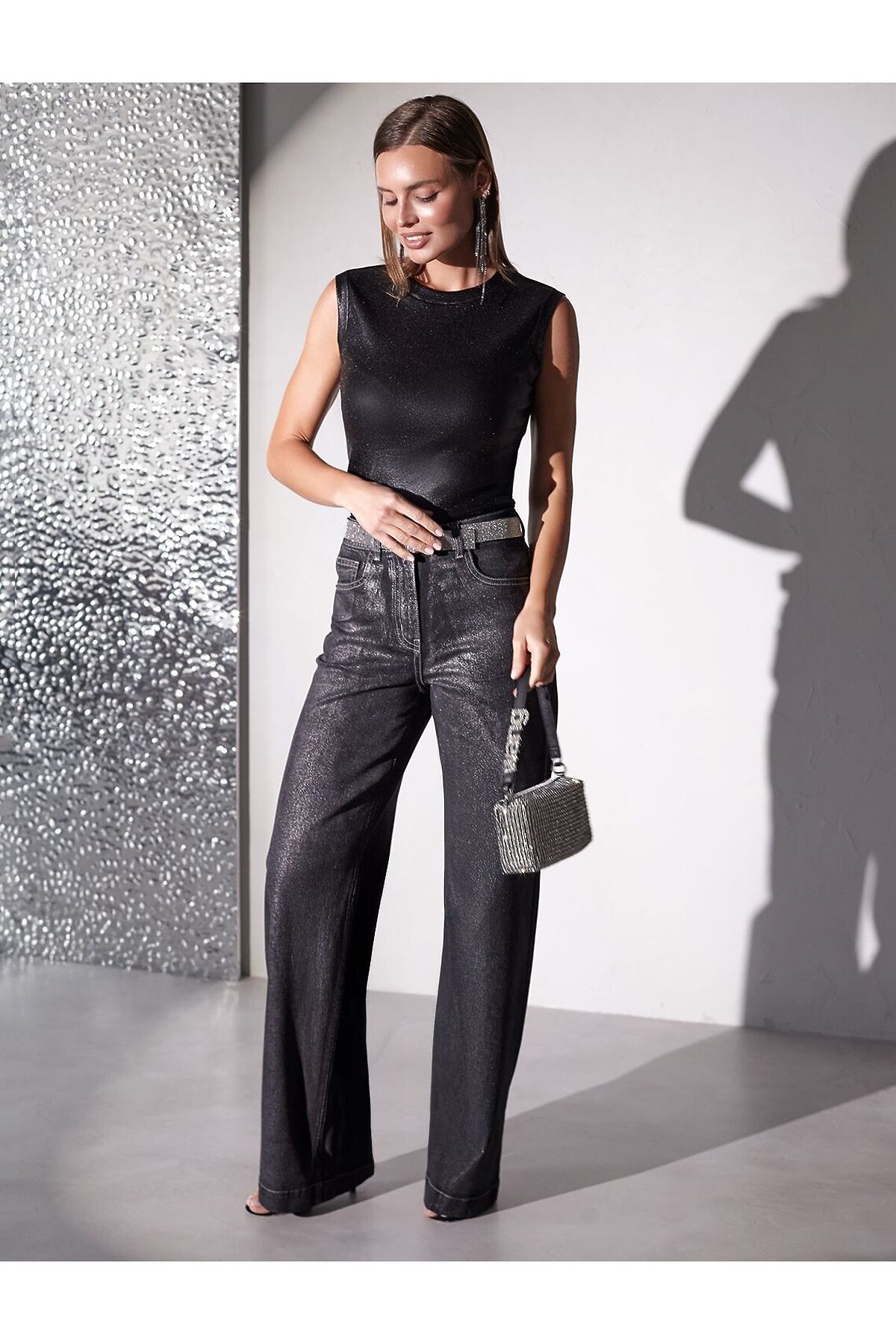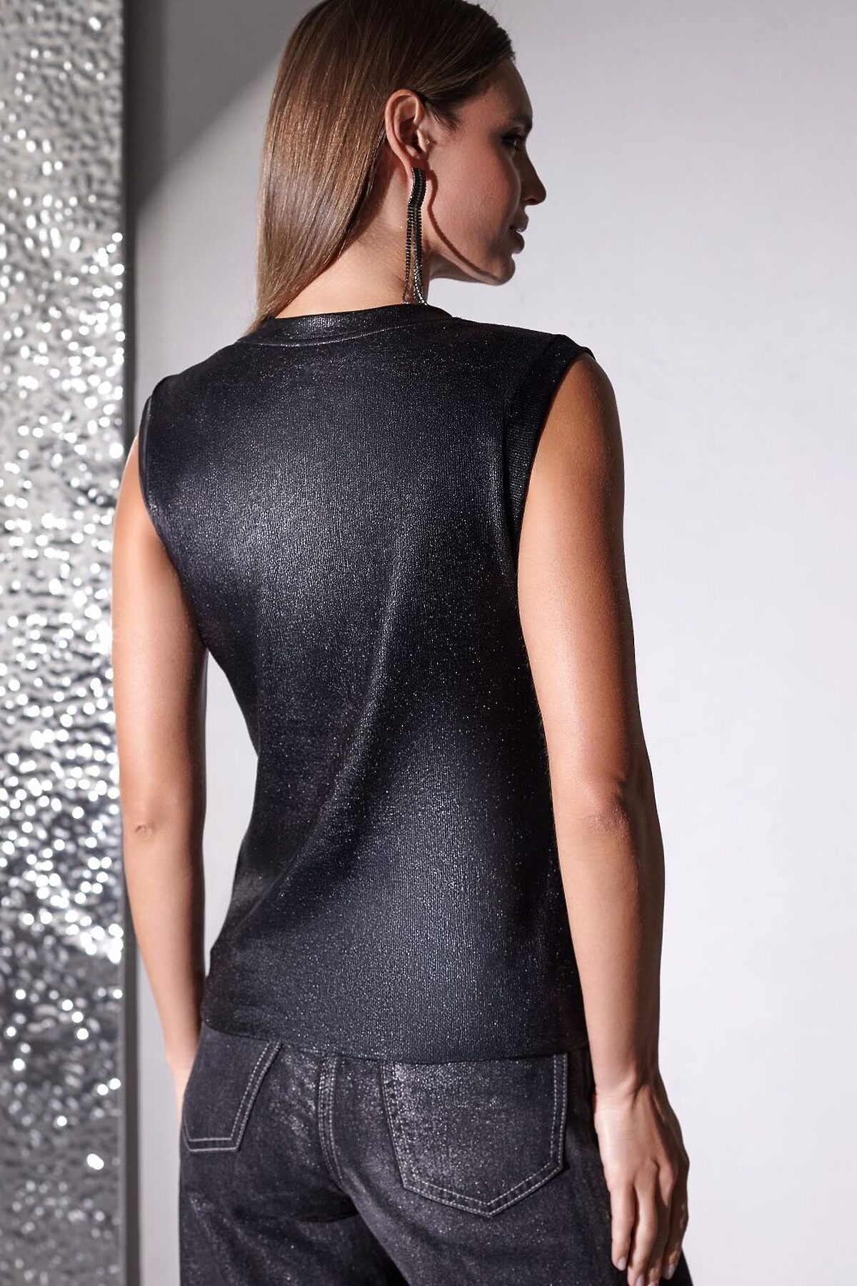 Эффектный топ черного цвета с закрытым декольте идеально подходит для офиса, вечерних мероприятий и повседневной носки. Качественный материал содержит натуральный хлопок, благодаря чему ткань мягкая, дышащая и приятная на ощупь. Добавление эластана обеспечивает эластичность и позволяет изделию хорошо садиться на любую фигуру, в том числе и большие размеры. Ткань в мелкий рубчик вытягивает силуэт. Формоустойчивость материала сохраняет аккуратный внешний облик даже после многочисленных стирок. Трендовый матовый металлизированный эффект создает сияющий блеск без излишней яркости — это делает топ нарядным и красивым как для праздничного события, так и для повседневной носки в комплекте с деловым костюмом или джинсами. Широкие лямки обеспечивают дополнительный комфорт в течение всего дня. Круглый ворот подчеркивает линию шеи, добавляя образу изысканности.