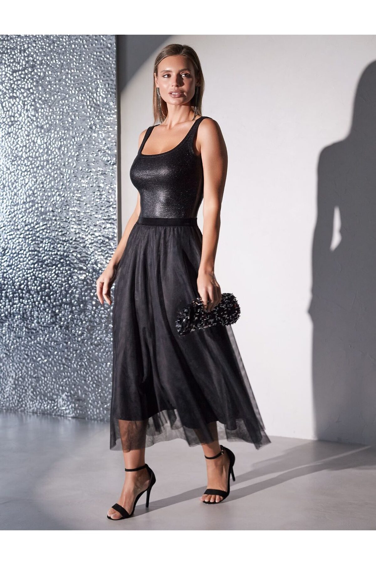 Эффектный топ черного цвета с широкими лямками — идеальный выбор для создания стильного образа на каждый день или вечерний выход. Ткань в мелкий рубчик визуально вытягивает силуэт, правильный крой подходит на любую фигуру, комфортно садится на большие размеры, не сковывая движений. Изысканный матовый блеск металлик добавляет современный акцент даже самому простому образу. Ткань мягкая и приятная к телу, что особенно важно для ежедневной носки. Крой выполнен таким образом, чтобы подчеркнуть достоинства фигуры: широкие лямки делают линию декольте и шею более изящной и женственной. Матовая поверхность создает блистающий эффект без лишнего глянца, позволяя гармонично сочетать топ как с деловыми комплектами, так и с более расслабленными вариантами одежды или в комплекте с вечерним нарядом.. Этот вариант повседневного топа станет практичным решением для женщин и девушек, кто ценит комфорт и стиль одновременно в любой ситуации.