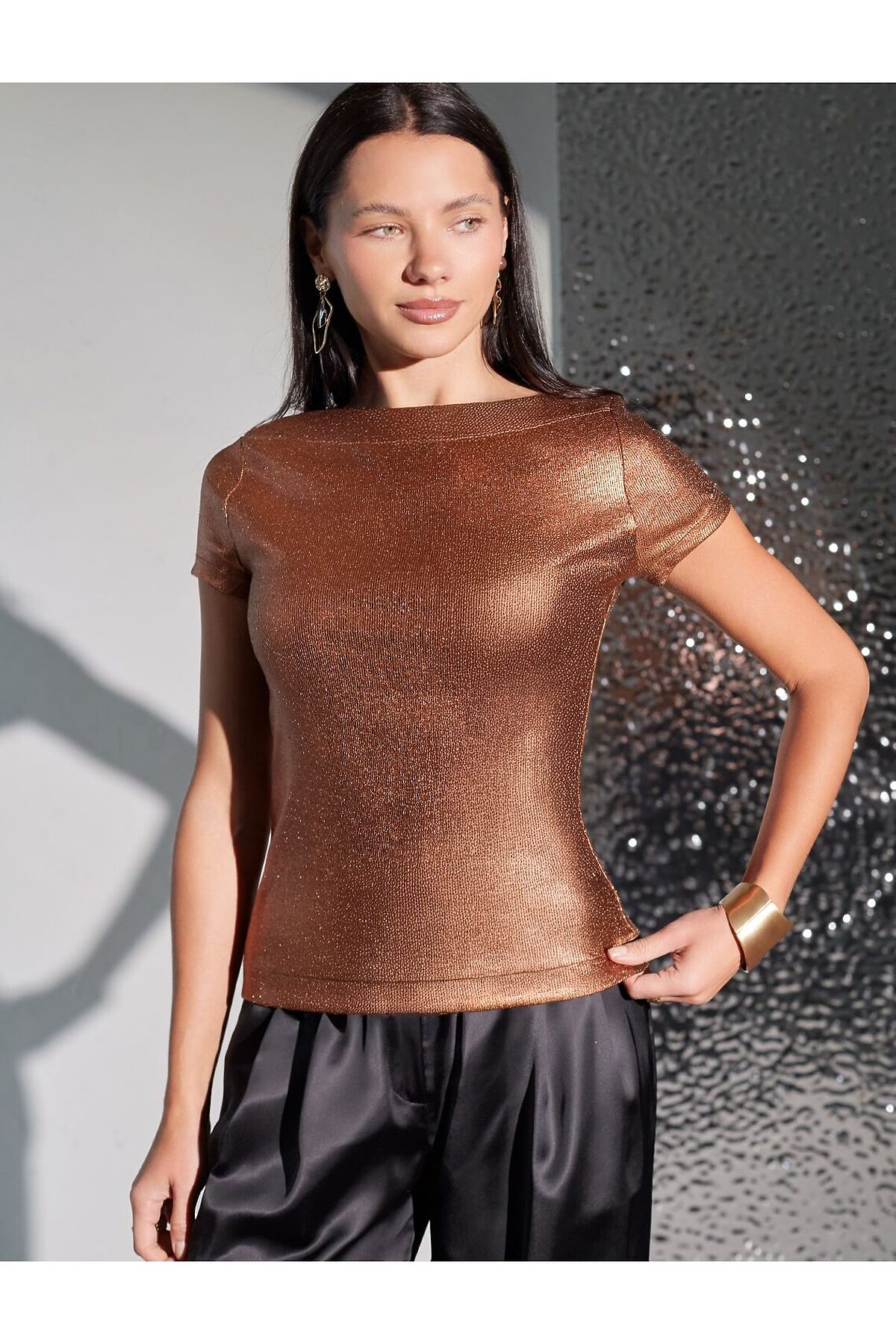 Стильная футболка кофейного цвета с вырезом лодочка выполнена из премиального хлопка с добавлением эластана. Эффектное матовое покрытие металлик придает футболке изысканный блеск. Вырез лодочка добавляет элегантности и женственности образу. Мелкий рубчик визуально вытягивает силуэт, за счет эластана в составе материал прекрасно тянется и садится на любую фигуру, в том числе большие размеры. Ткань износостойкая, сохраняет свой превоначальный вид даже после многочисленных стирок, отличается мягкостью и приятными тактильными ощущениями, такой материал не раздражает кожу, дарит ощущение уюта даже при длительном ношении, а воздухопроницаемость позволяет коже свободно дышать. Повседневная футболка универсальна: она сочетается с джинсами, юбками или строгими брюками — легко создать как деловой образ для офиса, так и наряд для вечеринки или ужина вне дома. Матовое покрытие создает благородный блеск без лишней яркости, благодаря чему футболка смотрится свежо и актуально.