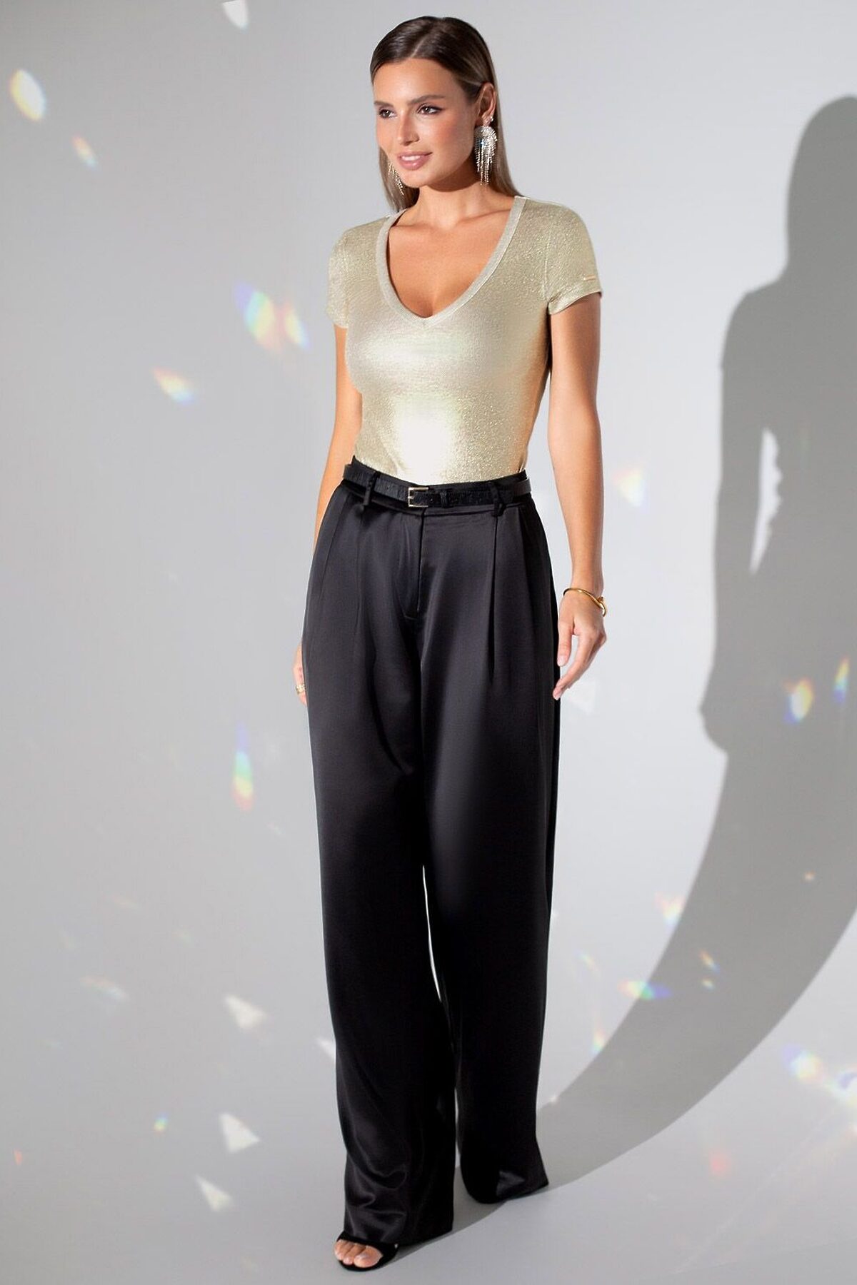Стильная футболка золотистого цвета с V вырезом выполнена из премиального хлопка с добавлением эластана. Эффектное матовое покрытие металлик придает футболке изысканный блеск. Чуть удлиненные рукава и глубокий вырез, открывающий область декольте, добавляют женственность и элегантность образу. Мелкий рубчик визуально вытягивает силуэт, за счет эластана в составе материал прекрасно тянется и садится на любую фигуру, в том числе большие размеры. Ткань износостойкая, сохраняет свой превоначальный вид даже после многочисленных стирок, отличается мягкостью и приятными тактильными ощущениями, такой материал не раздражает кожу, дарит ощущение уюта даже при длительном ношении, а воздухопроницаемость позволяет коже свободно дышать. Повседневная футболка универсальна: она сочетается с джинсами, юбками или строгими брюками — легко создать как деловой образ для офиса, так и наряд для вечеринки или ужина вне дома. Матовое покрытие создает благородный блеск без лишней яркости, благодаря чему футболка смотрится свежо и