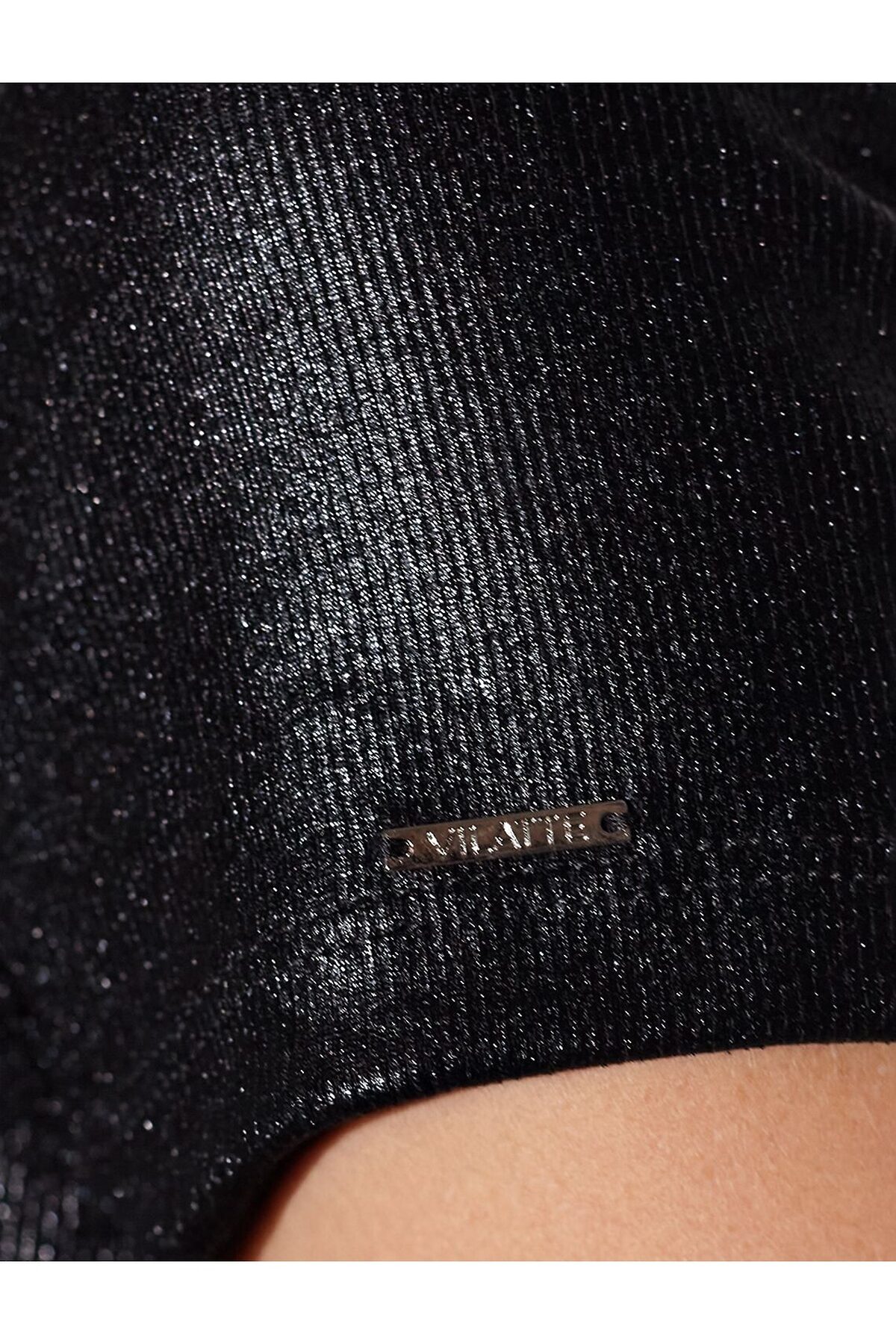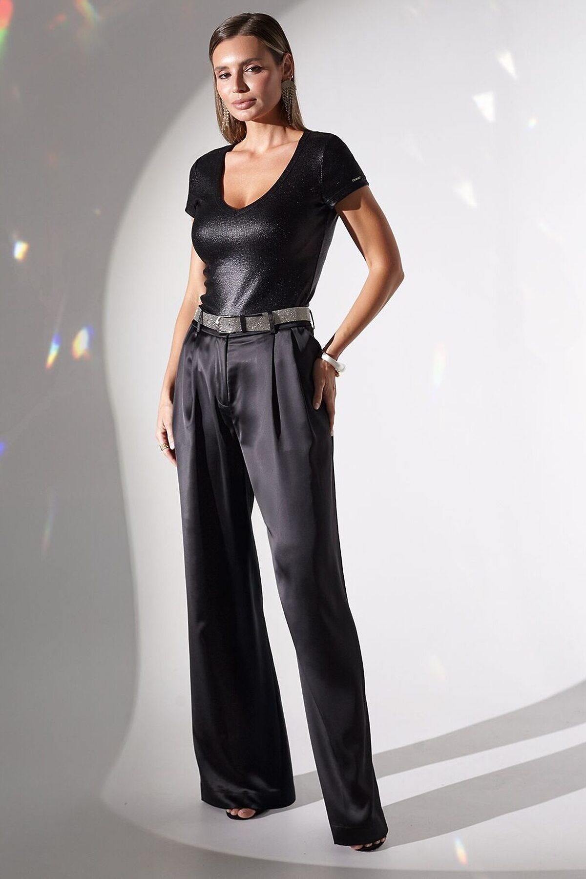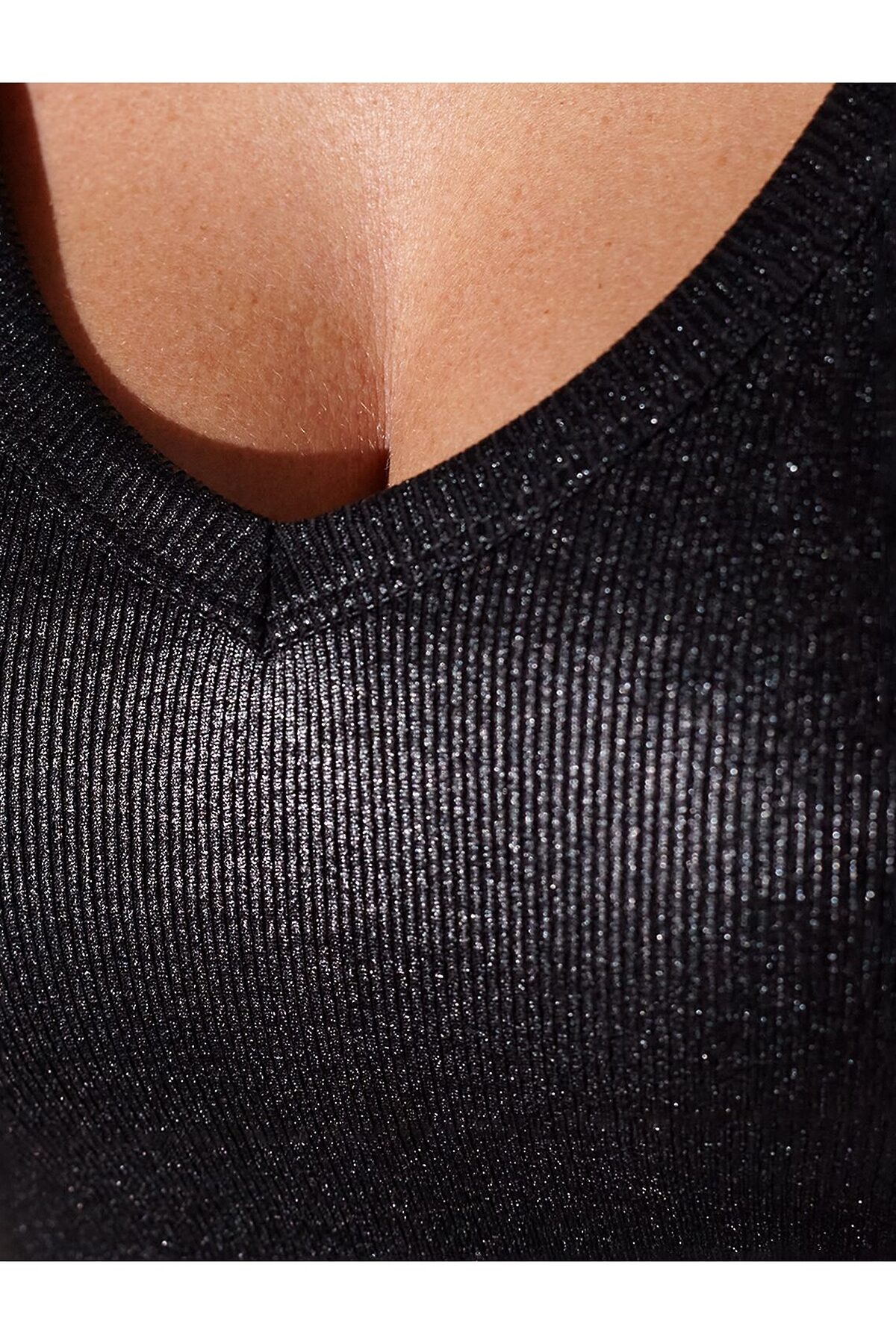 Стильная футболка черного цвета с V вырезом выполнена из премиального хлопка с добавлением эластана. Эффектное матовое покрытие металлик придает футболке изысканный блеск. Чуть удлиненные рукава и глубокий вырез, открывающий область декольте, добавляют женственность и элегантность образу. Мелкий рубчик визуально вытягивает силуэт, за счет эластана в составе материал прекрасно тянется и садится на любую фигуру, в том числе большие размеры. Ткань износостойкая, сохраняет свой превоначальный вид даже после многочисленных стирок, отличается мягкостью и приятными тактильными ощущениями, такой материал не раздражает кожу, дарит ощущение уюта даже при длительном ношении, а воздухопроницаемость позволяет коже свободно дышать. Повседневная футболка универсальна: она сочетается с джинсами, юбками или строгими брюками — легко создать как деловой образ для офиса, так и наряд для вечеринки или ужина вне дома. Матовое покрытие создает благородный блеск без лишней яркости, благодаря чему футболка смотрится свежо и акту