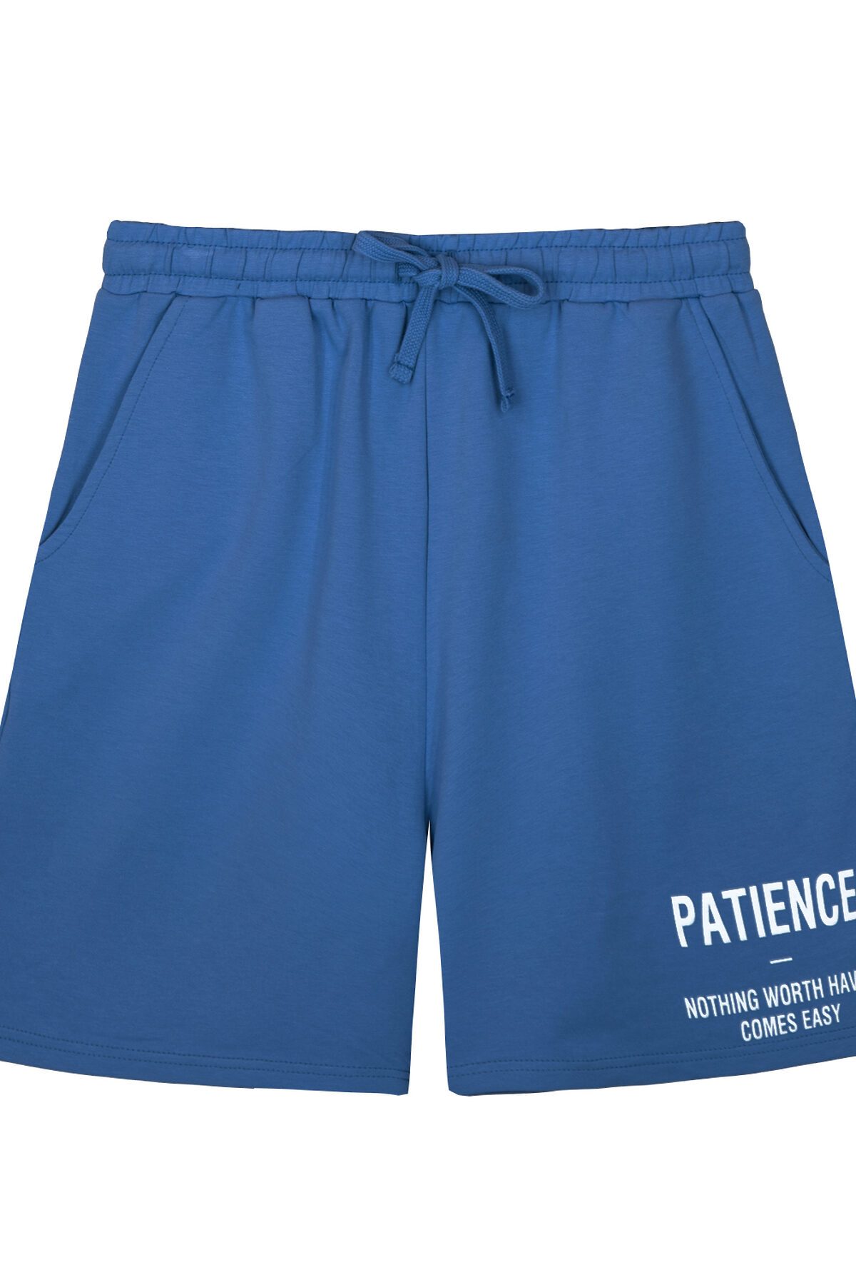 Шорты женские прямого силуэта. Отрезной пояс из основного полотна, с эластичной тесьмой закрепленной в шов. По поясу шорт вставлен плоский утягивающий шнурок, в цвет пояса. На передней половинке шорт выполнены карманы с отрезным бочком. Низ изделия обработан швом в подгибку. На левой передней половинке шорт принт шелкография. Надпись переводится как Терпение; Ничто тоящее не делается легко. Модель рассчитана на рост 164-170см.