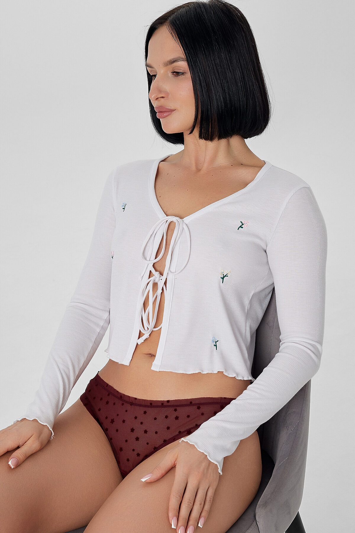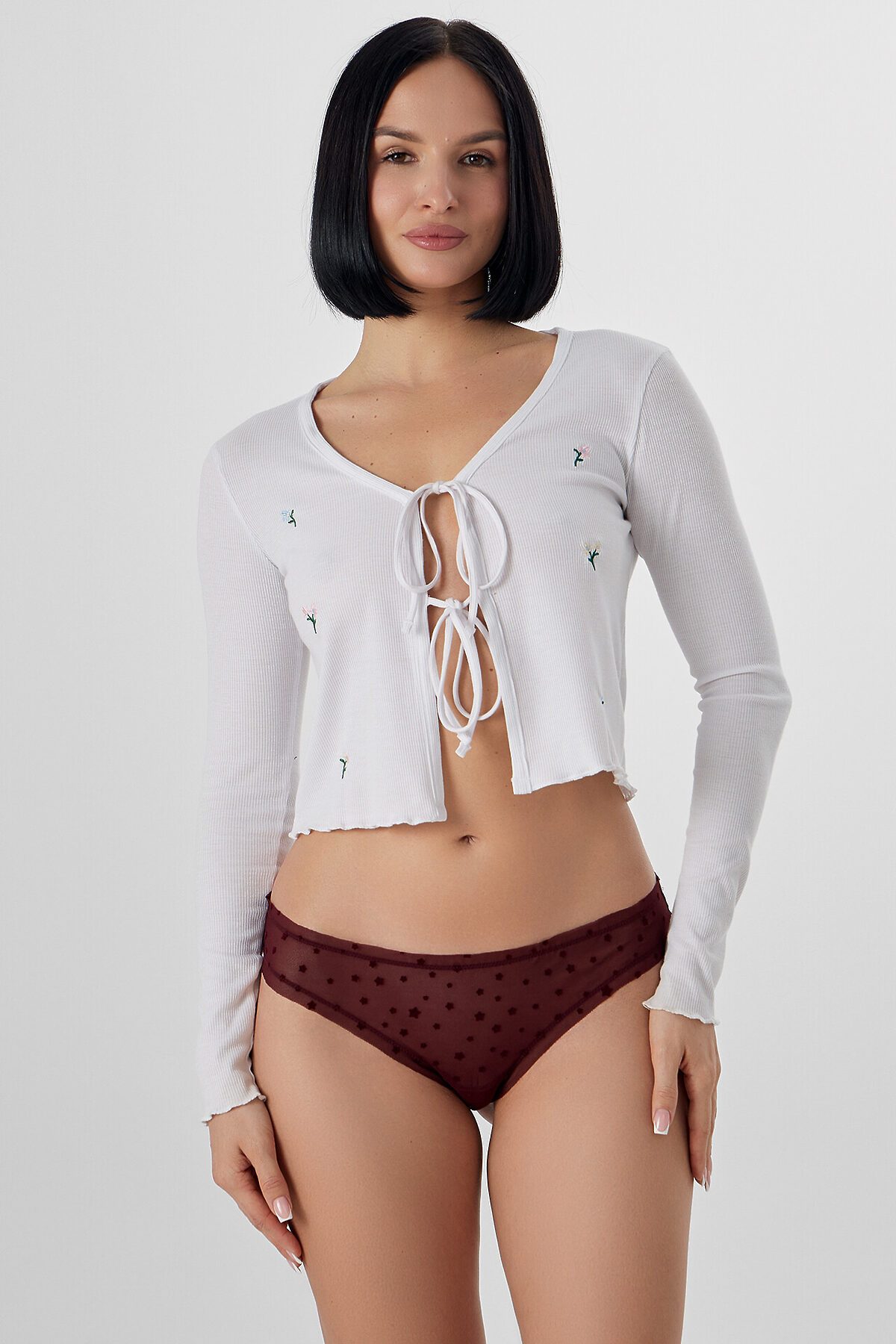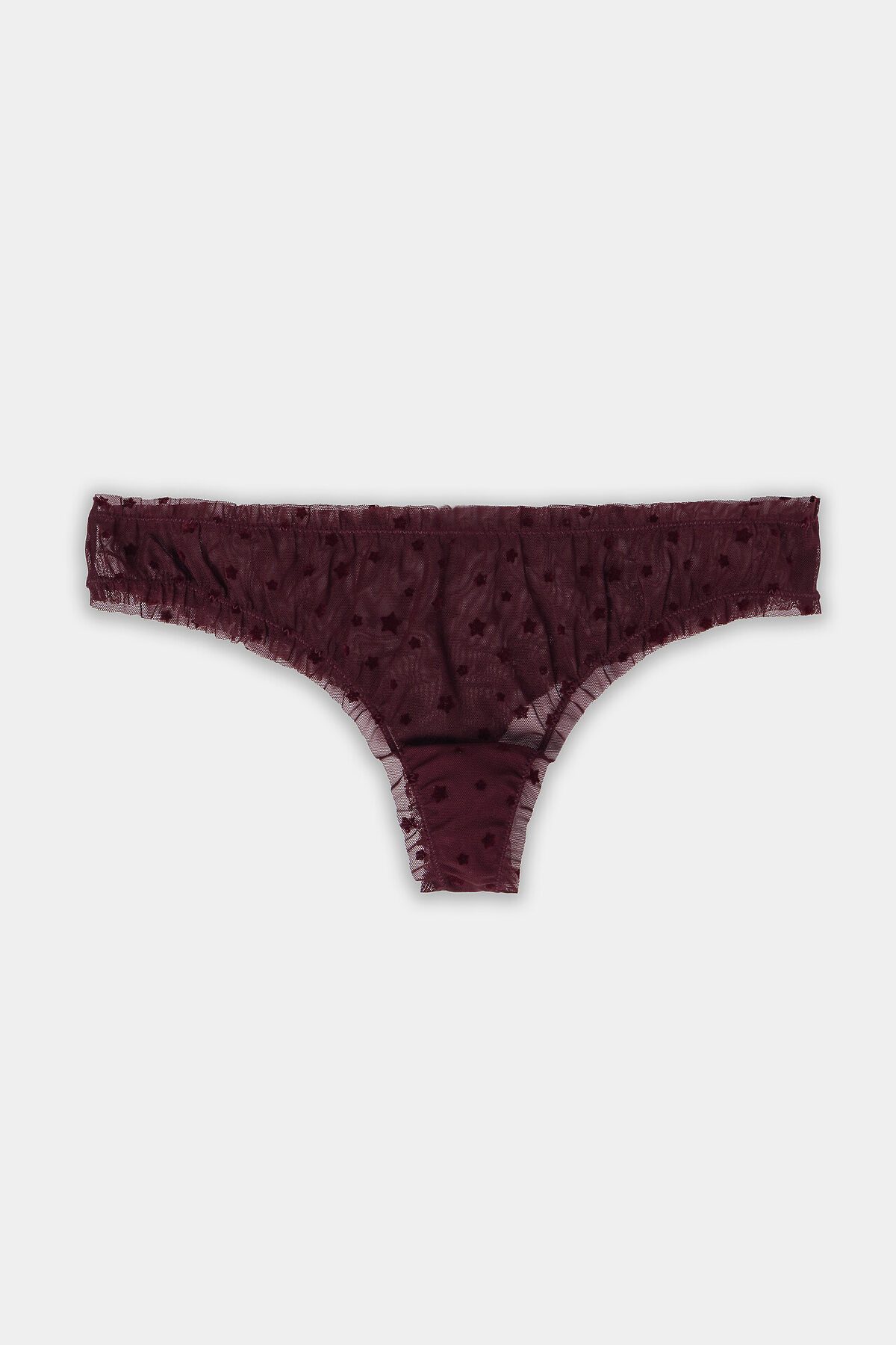 Трусы женские, средняя линия талии, силуэт - бразилиано. Передняя и задние детали выполнены из сетки. Подкладка ластовицы из хлопка, верхний срез подкладки ластовицы отлетной. По верхнему срезу трусов и по ножкам рюша из сборки, под низом жилка.