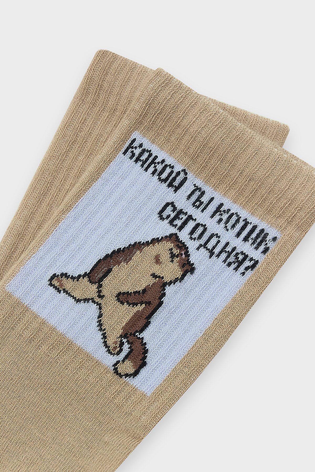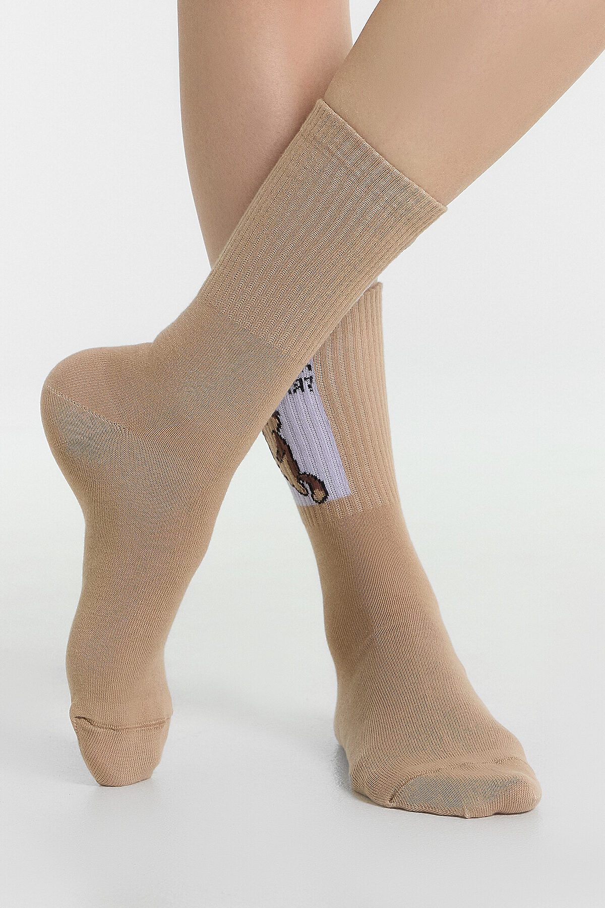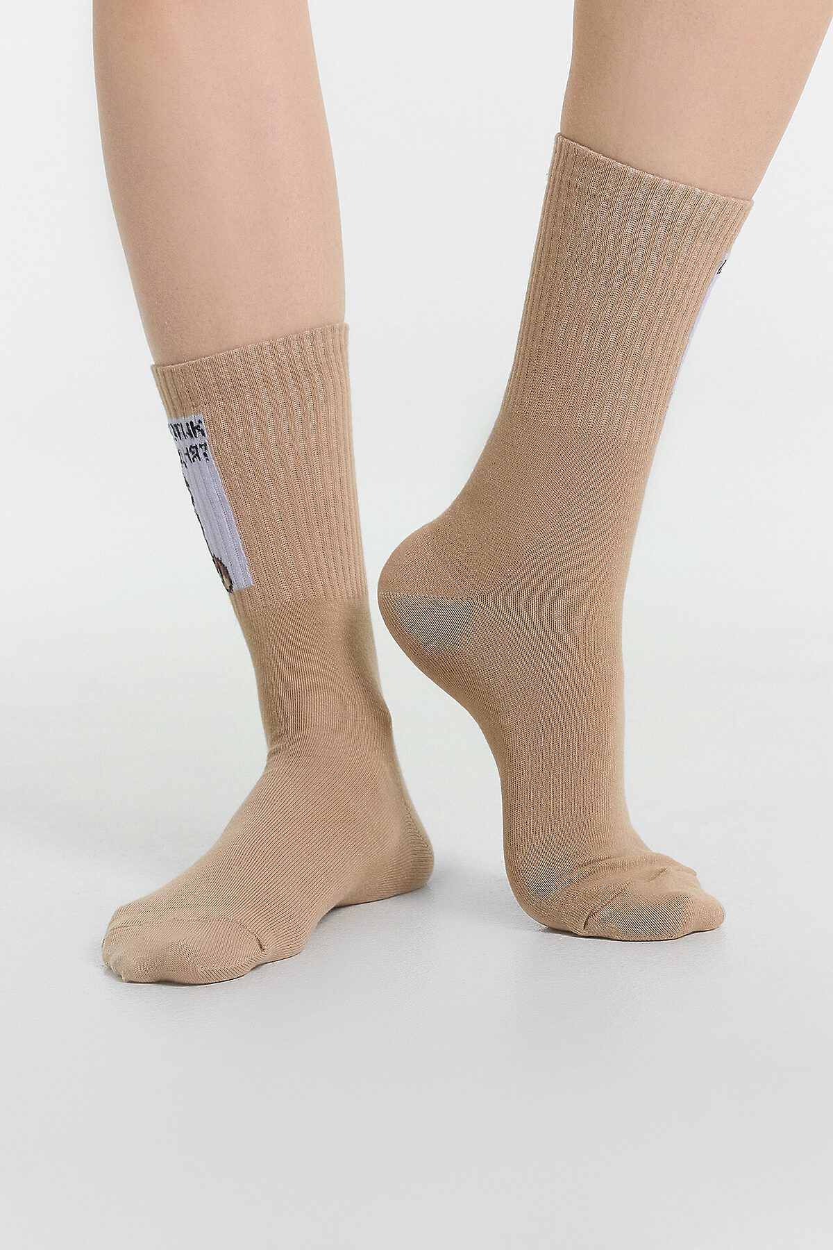 рис.2868 Женский носок с высоким плотным бортом, а также с рисунком в виде надписи и кота.