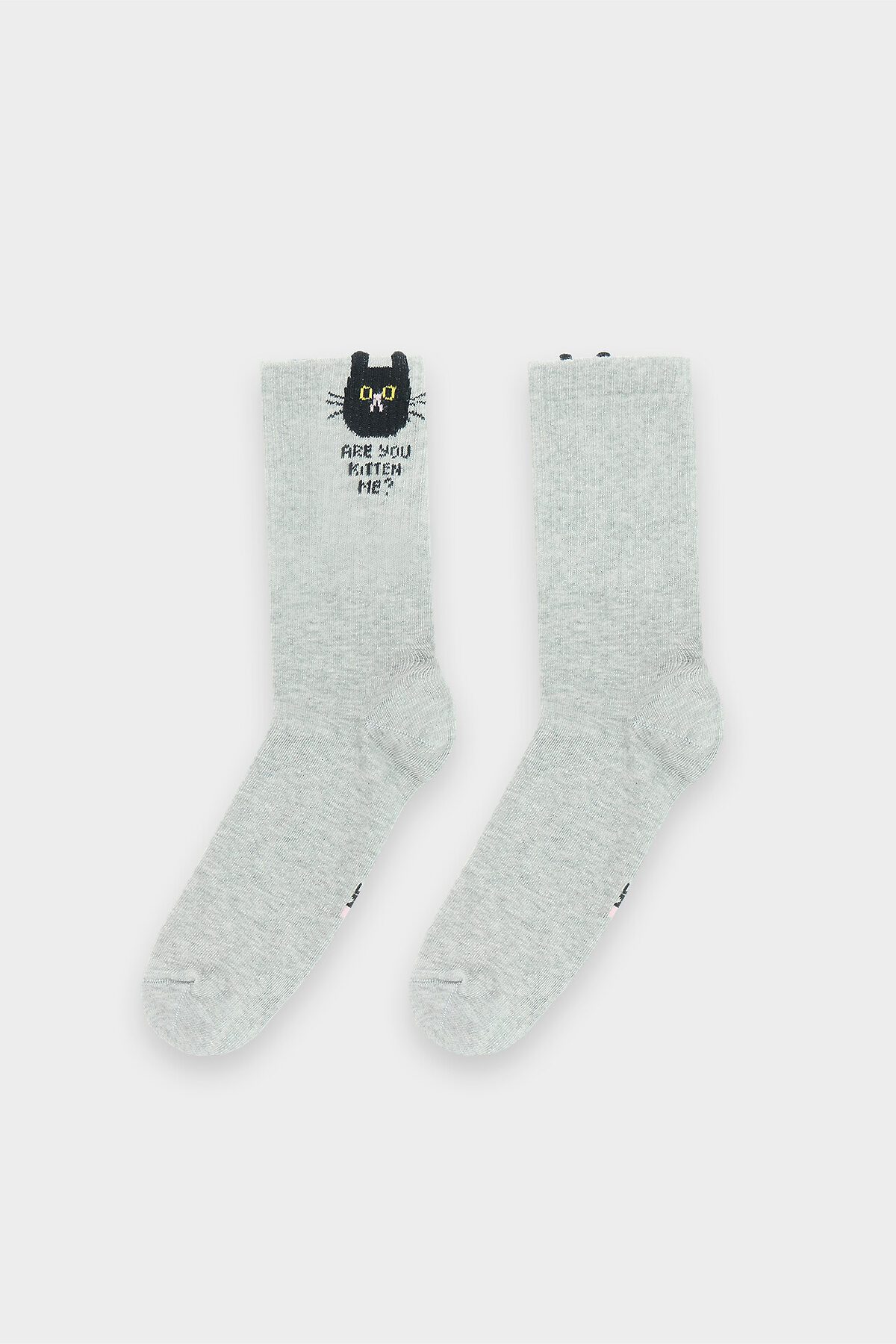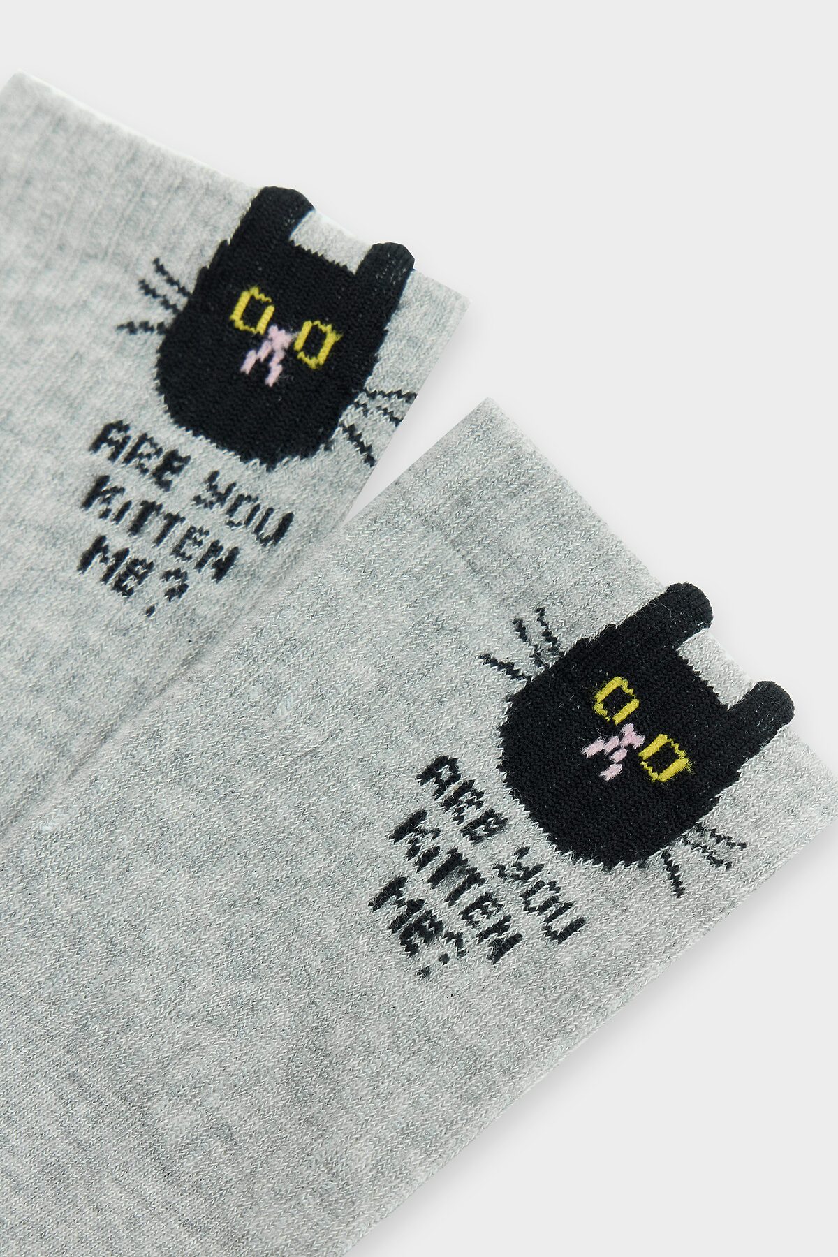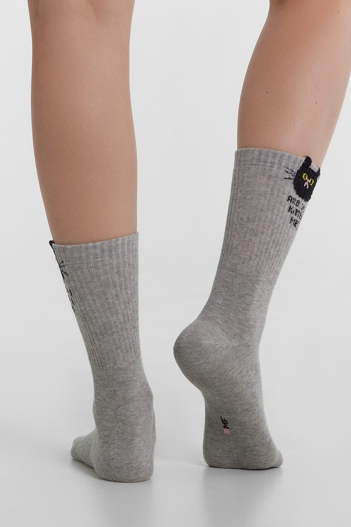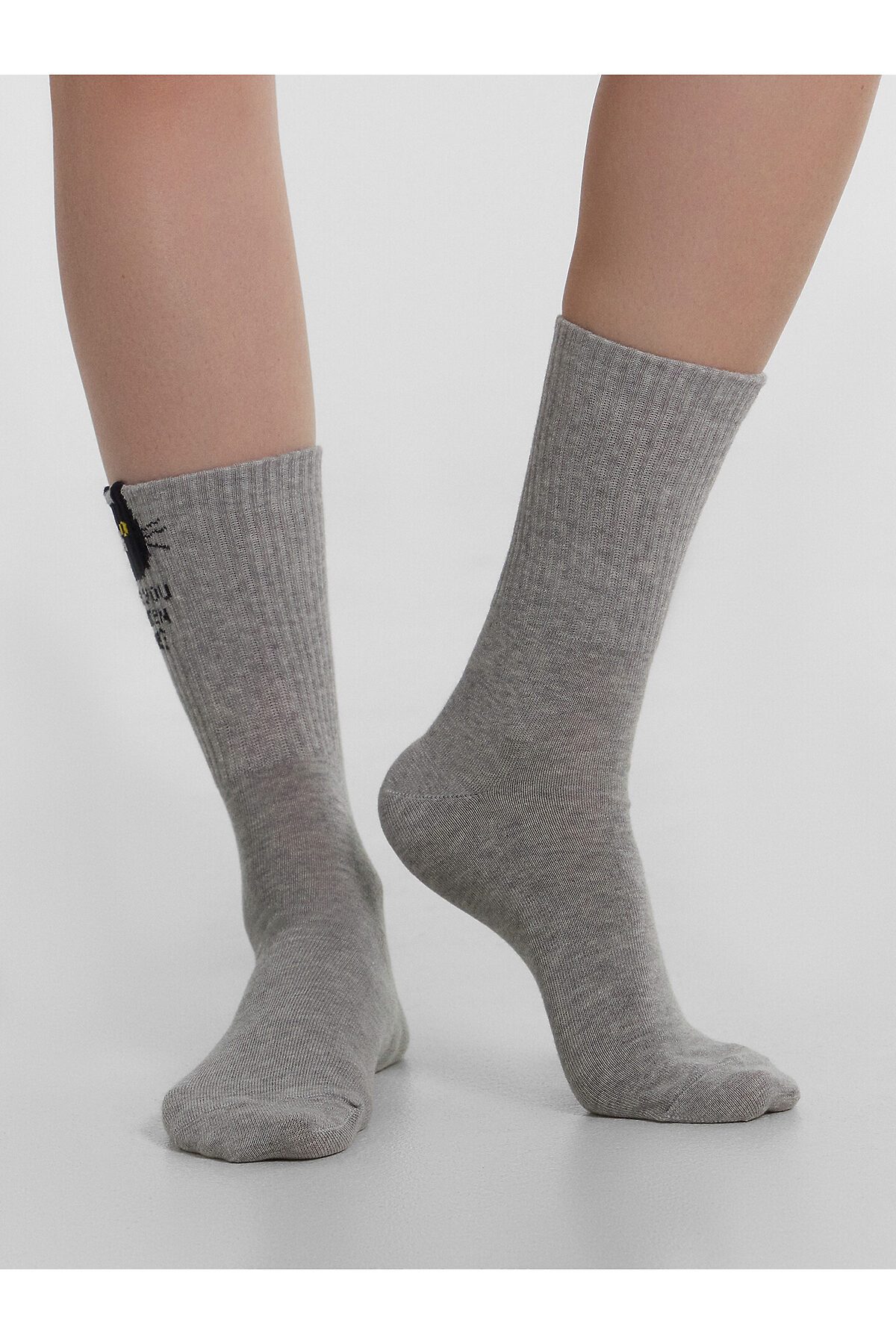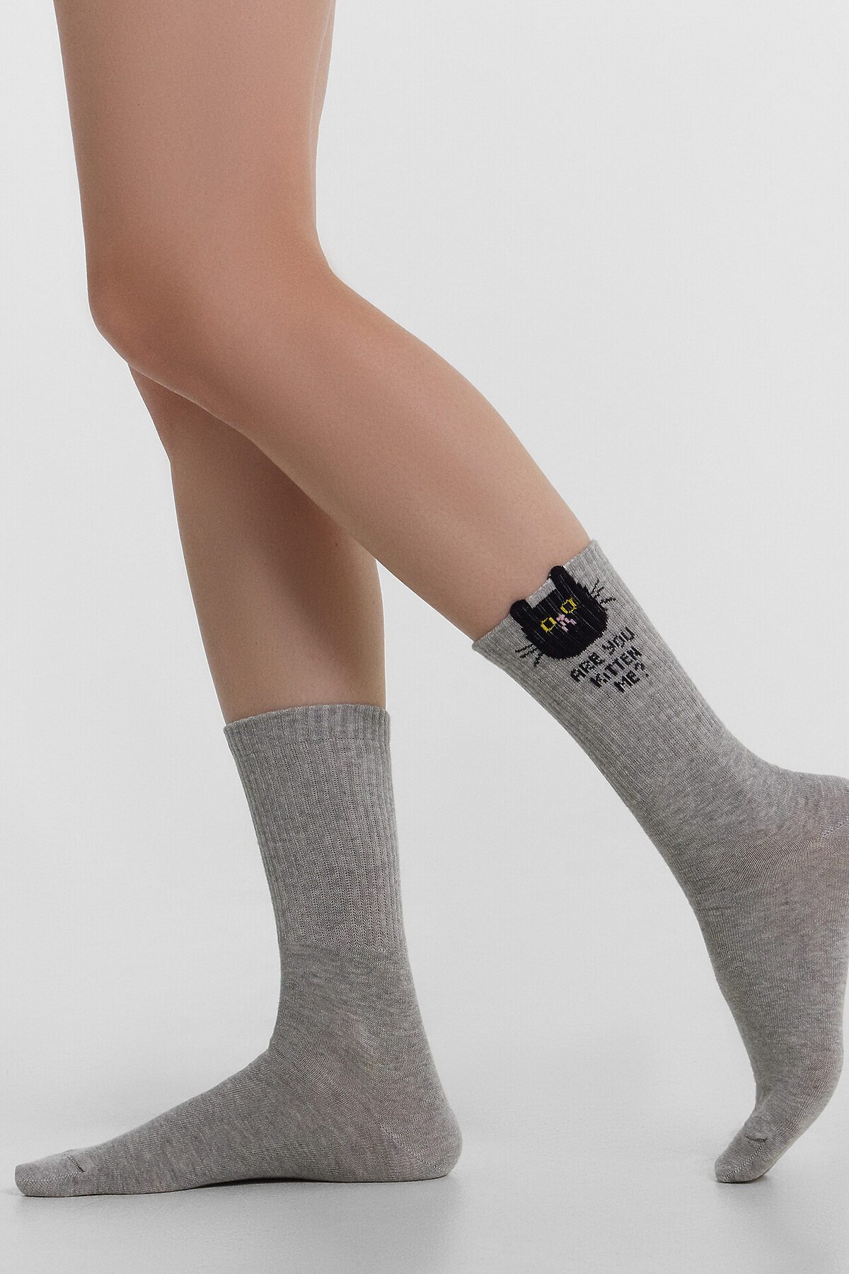 рис.3010 Женский носок с высоким плотным бортом, рисунком в виде котика и надписи.