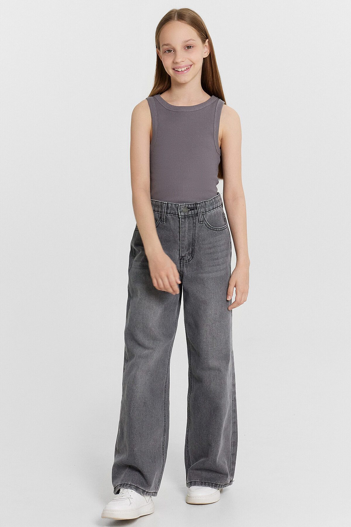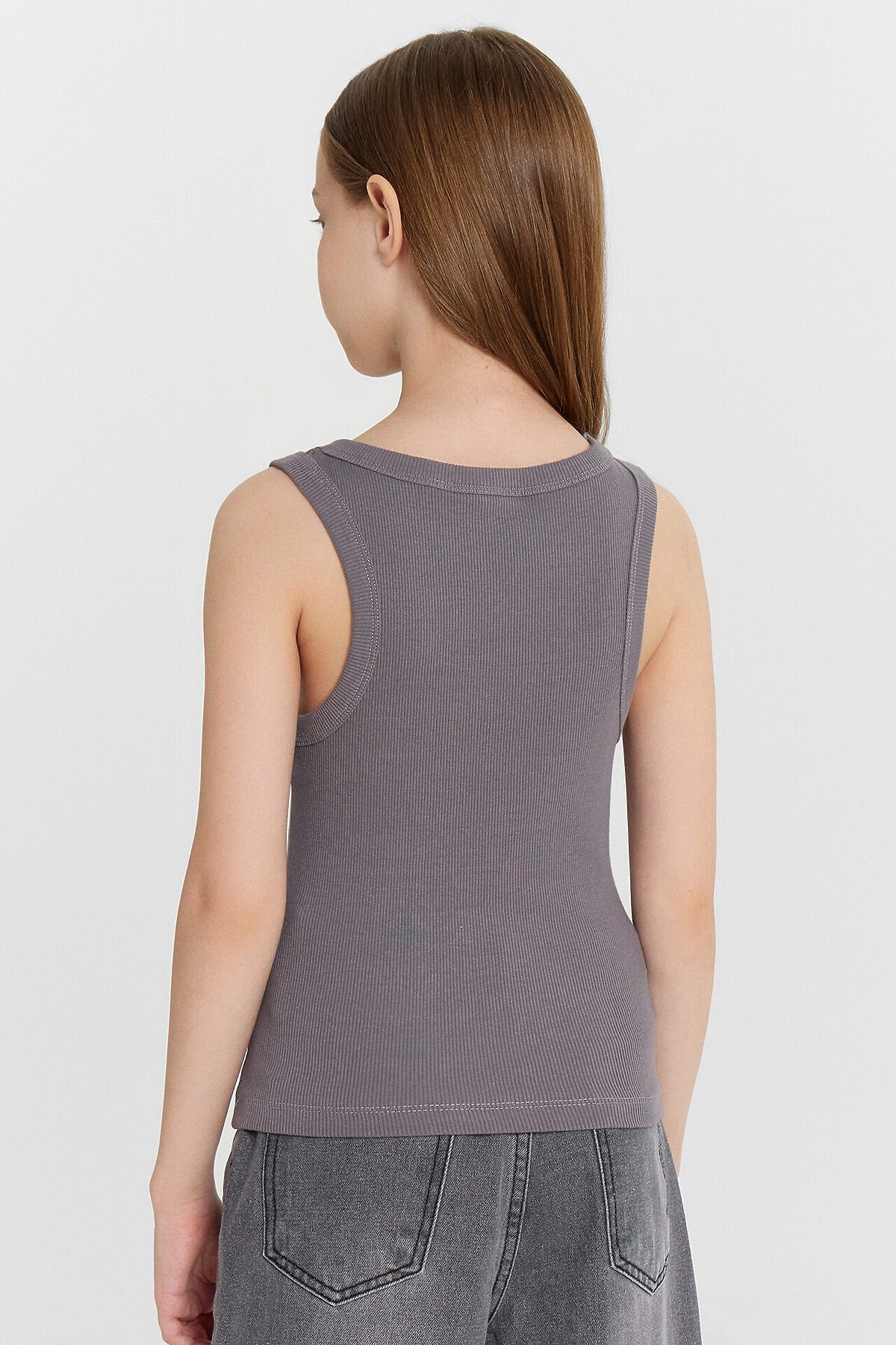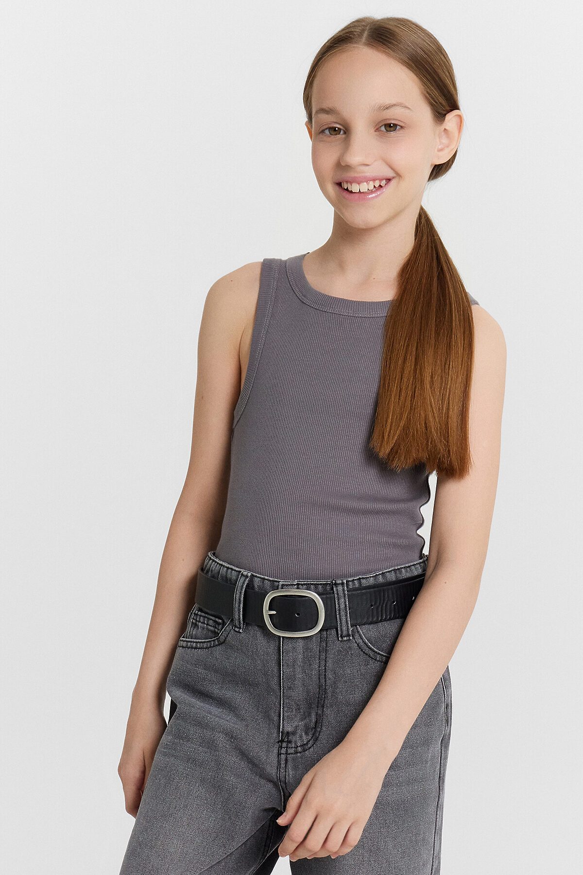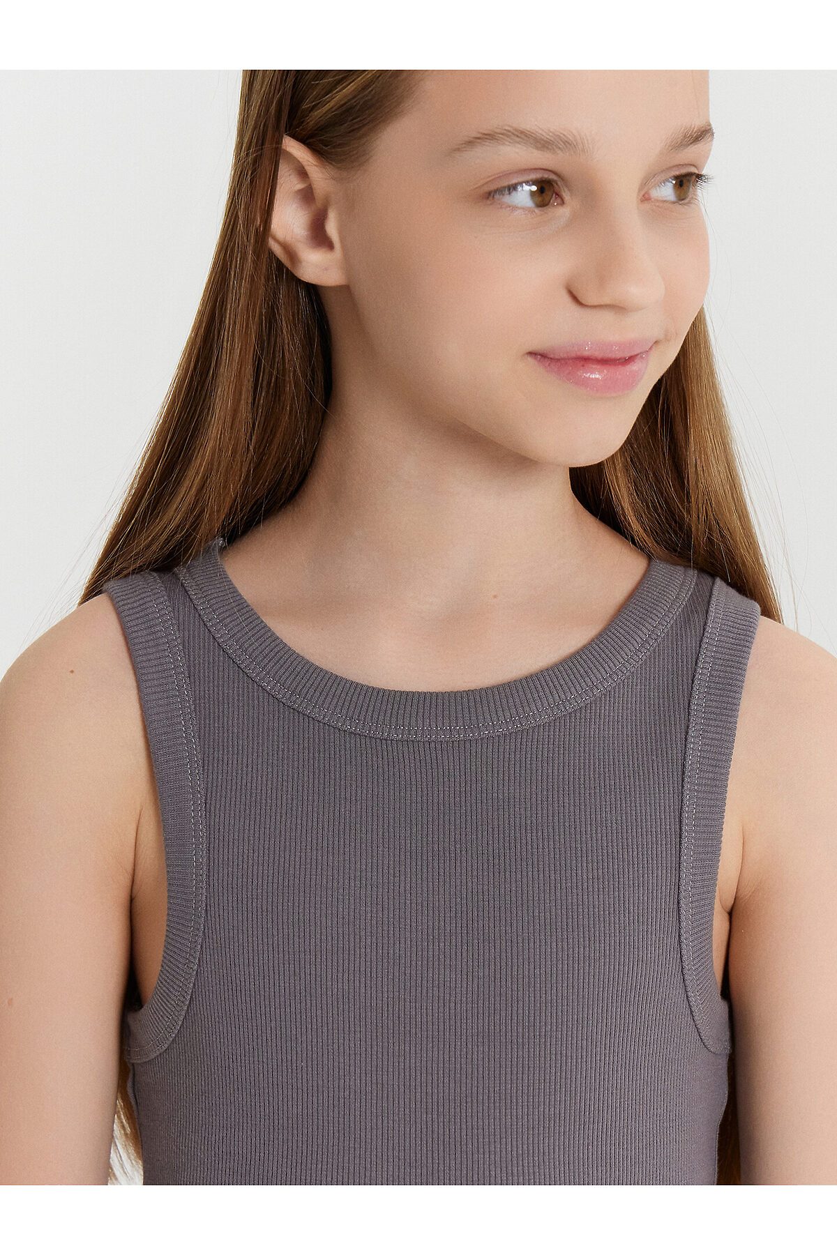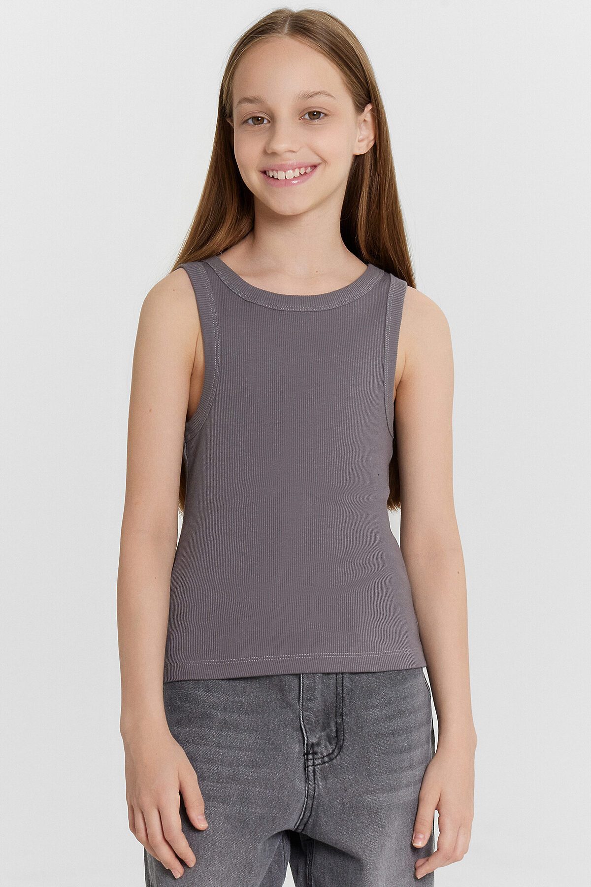 Топ для девочек из рибаны, облегающего силуэта, длиной ниже уровня талии. Перед и спинка цельнокроеные. Горловина круглая. Горловина и проймы окантованы широкой бейкой из основного полотна. Низ изделия обработан швом в подгибку.
