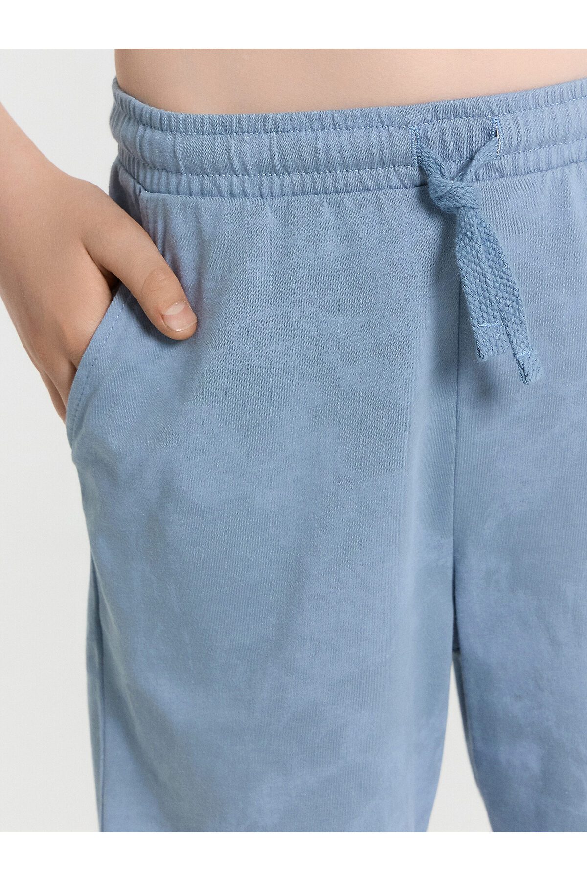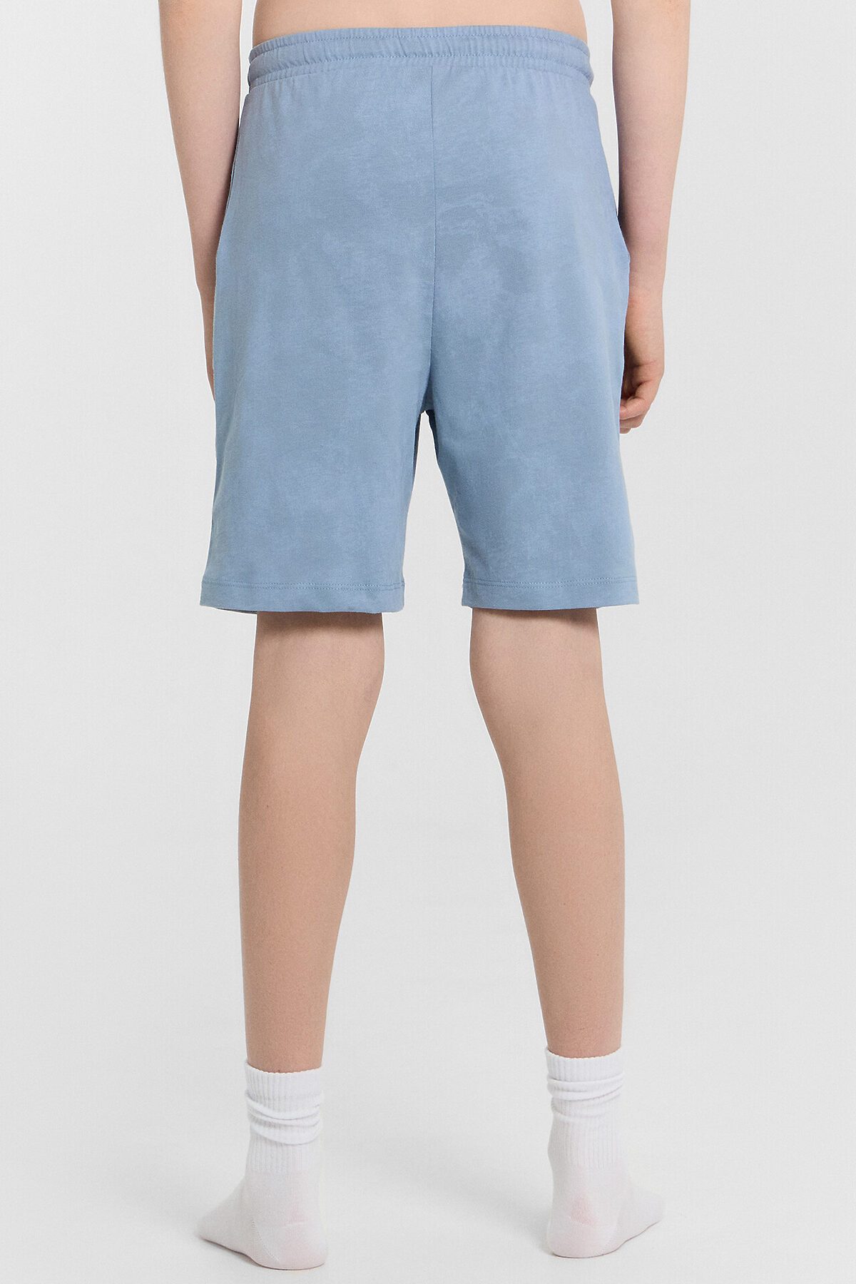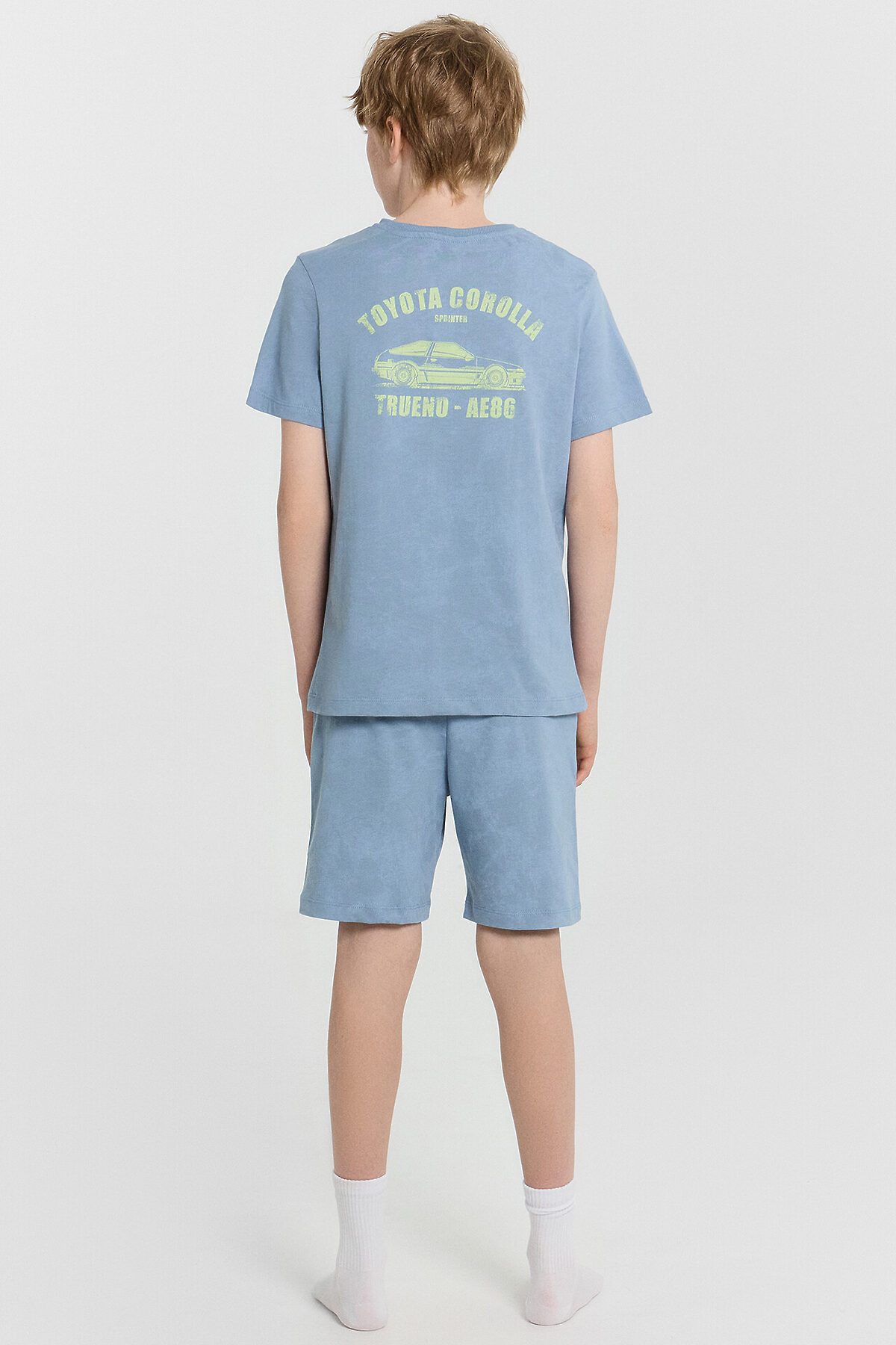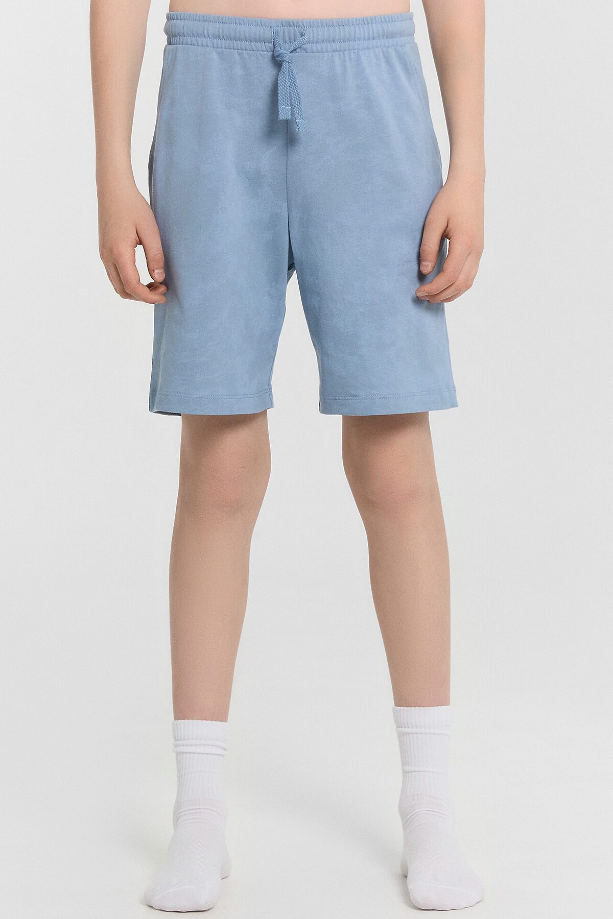 Комплект для мальчиков состоит из футболки верхней и шорт. Футболка верхняя выполнена из трикотажного кулирного полотна. Длиной до середины ягодиц. Силуэт прямой, свободный. Перед и спинка цельнокроенные. Рукава короткие, втачные. Горловина круглой формы. Обработана обтачкой из полотна трикотажного рибана. Шов притачивания обтачки по горловине спинки закрыт бейкой. Низ рукавов и джемпера обработан швом в подгибку. Шорты выполнены из трикотажного кулирного полотна. Шорты длиной до колен. На передних половинках обработаны карманы с отрезным бочком. Верхний край обработан притачным поясом из основного полотна с эластичной резиной внутри. Пояс распошит. По центру пояса пробиты петли, втянут шнур, концы шнура застрочены. Низ шорт обработан швом в подгибку.