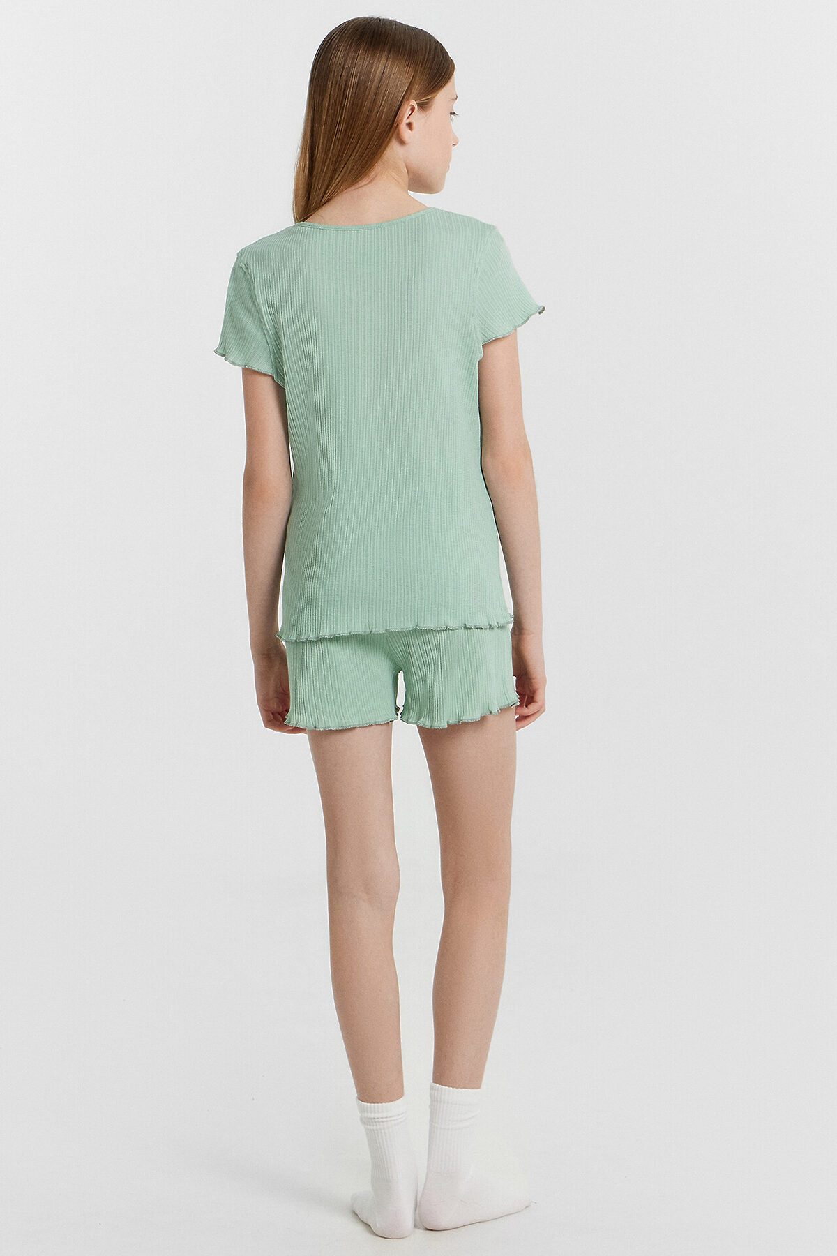 Комплект состоит из футболки и шорт. Футболка прямого силуэта. Перед и спинка цельнокроенные. Горловина круглая окантована бейкой из основного полотна. Низ рукавов и изделия обработаны микрооверлоком. Шорты прямого силуэта. Пояс цельнокроенный с эластичной тесьмой внутри. Низ обработан микрооверлоком.