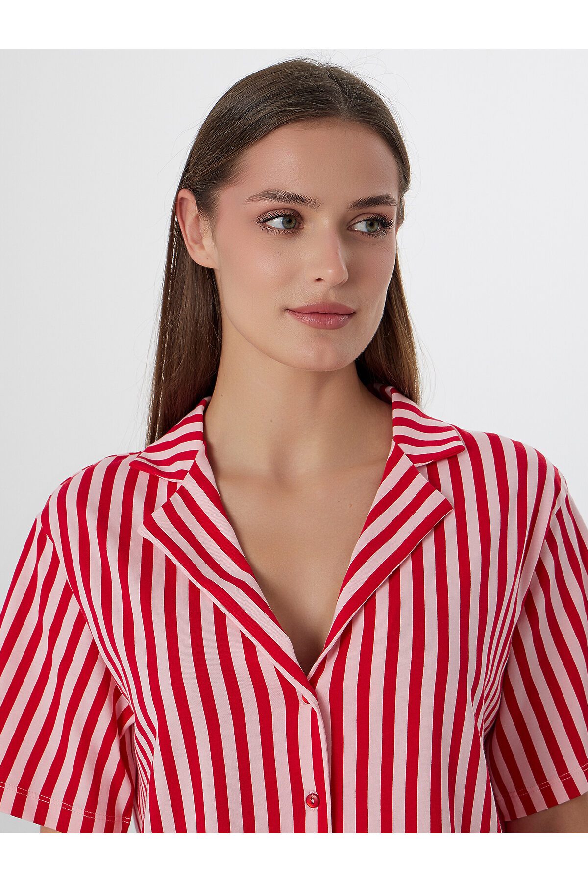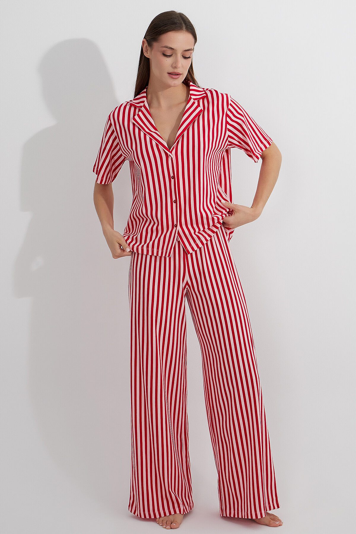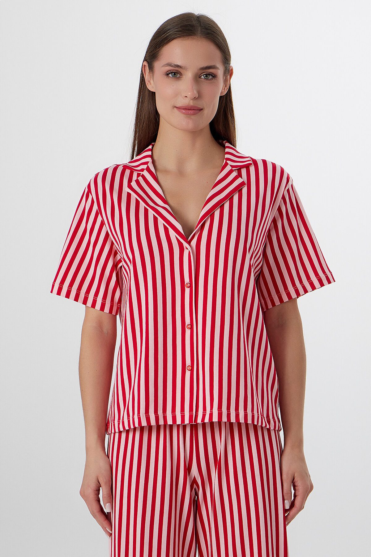 Рубашка с отложным воротником и короткими рукавами создает элегантный расслабленный образ. Центральная застежка на пуговицах и аккуратная обработка всех швов подчеркивают качество исполнения. Брюки с эластичным поясом на кулиске мягко сидят на талии, не стесняя движений.