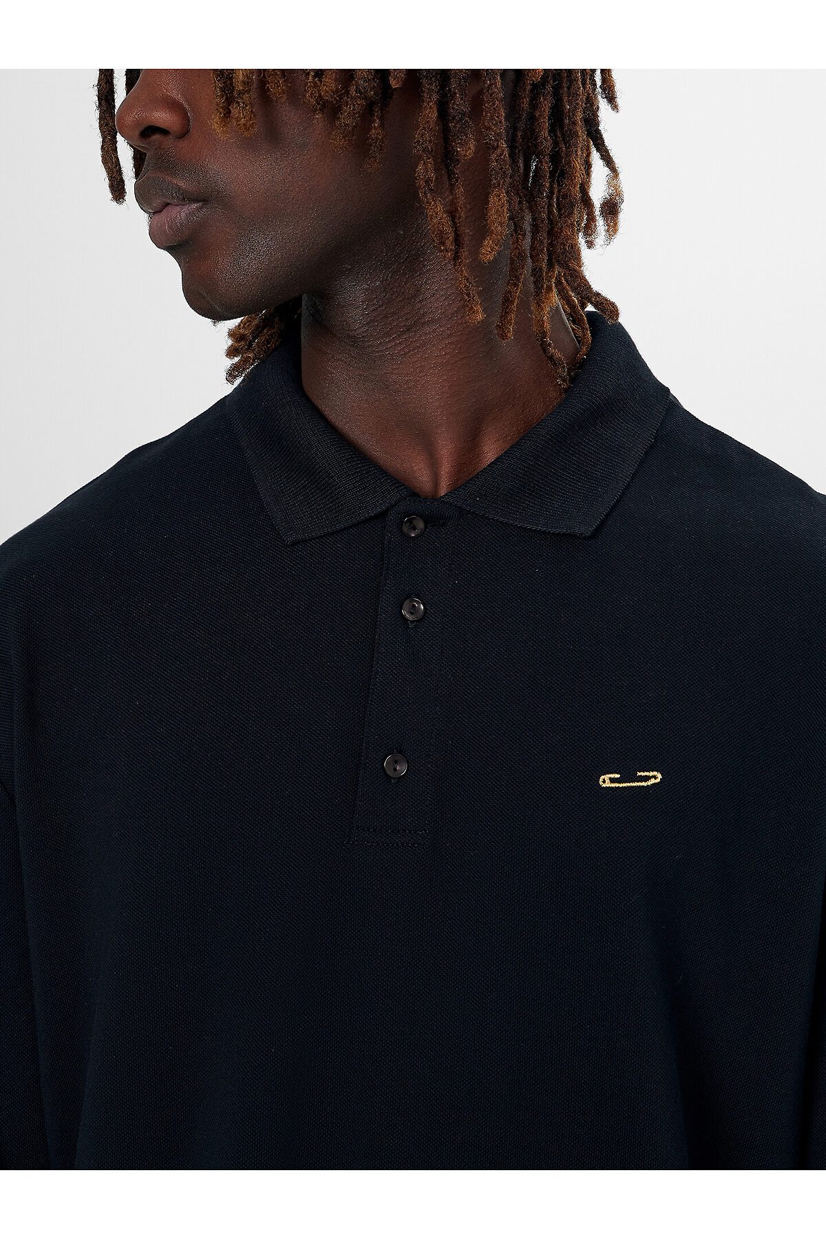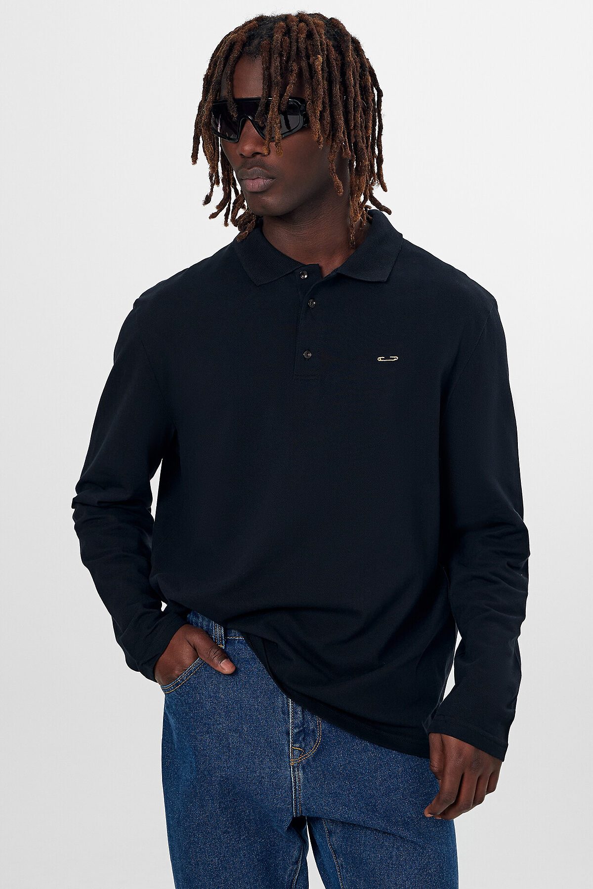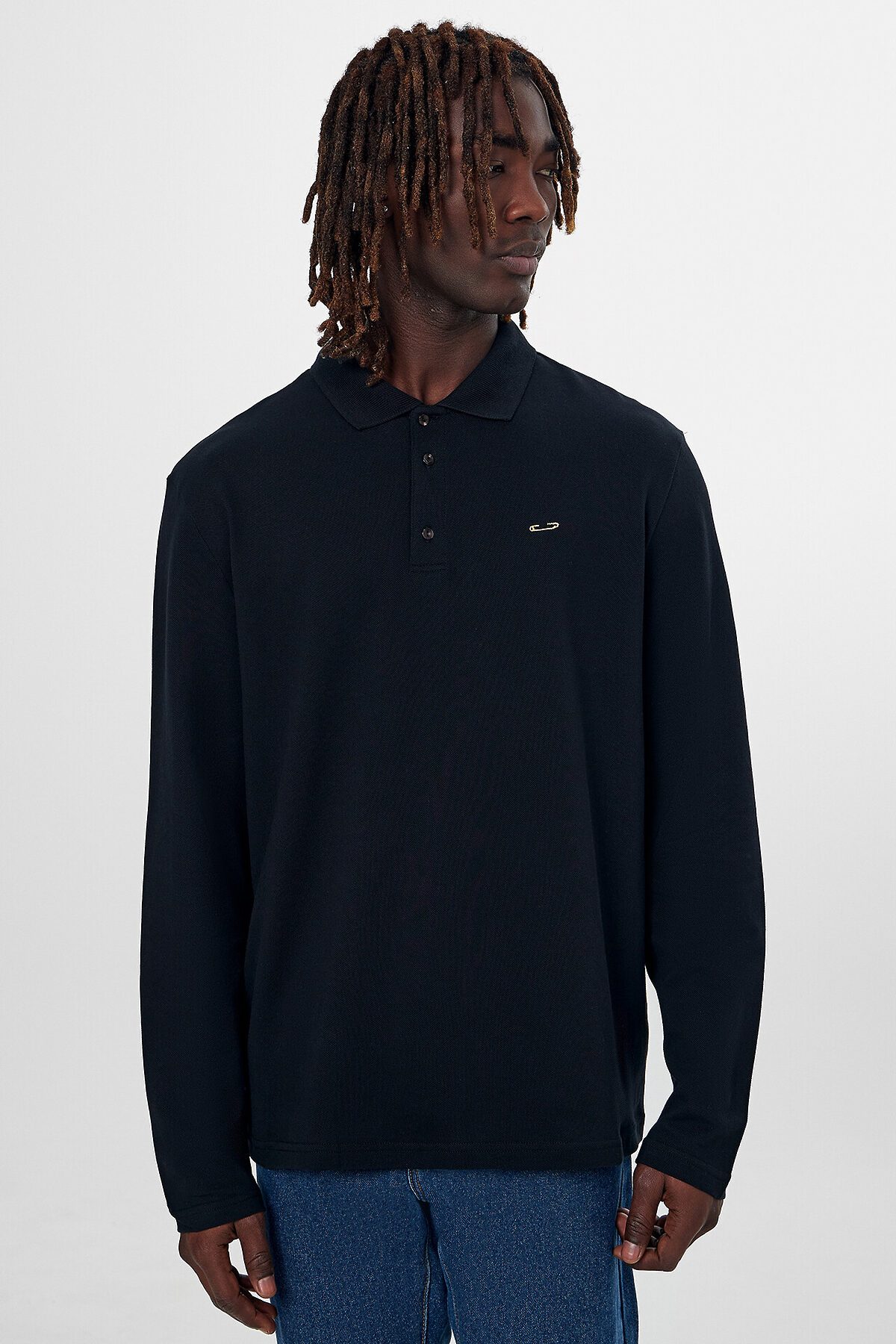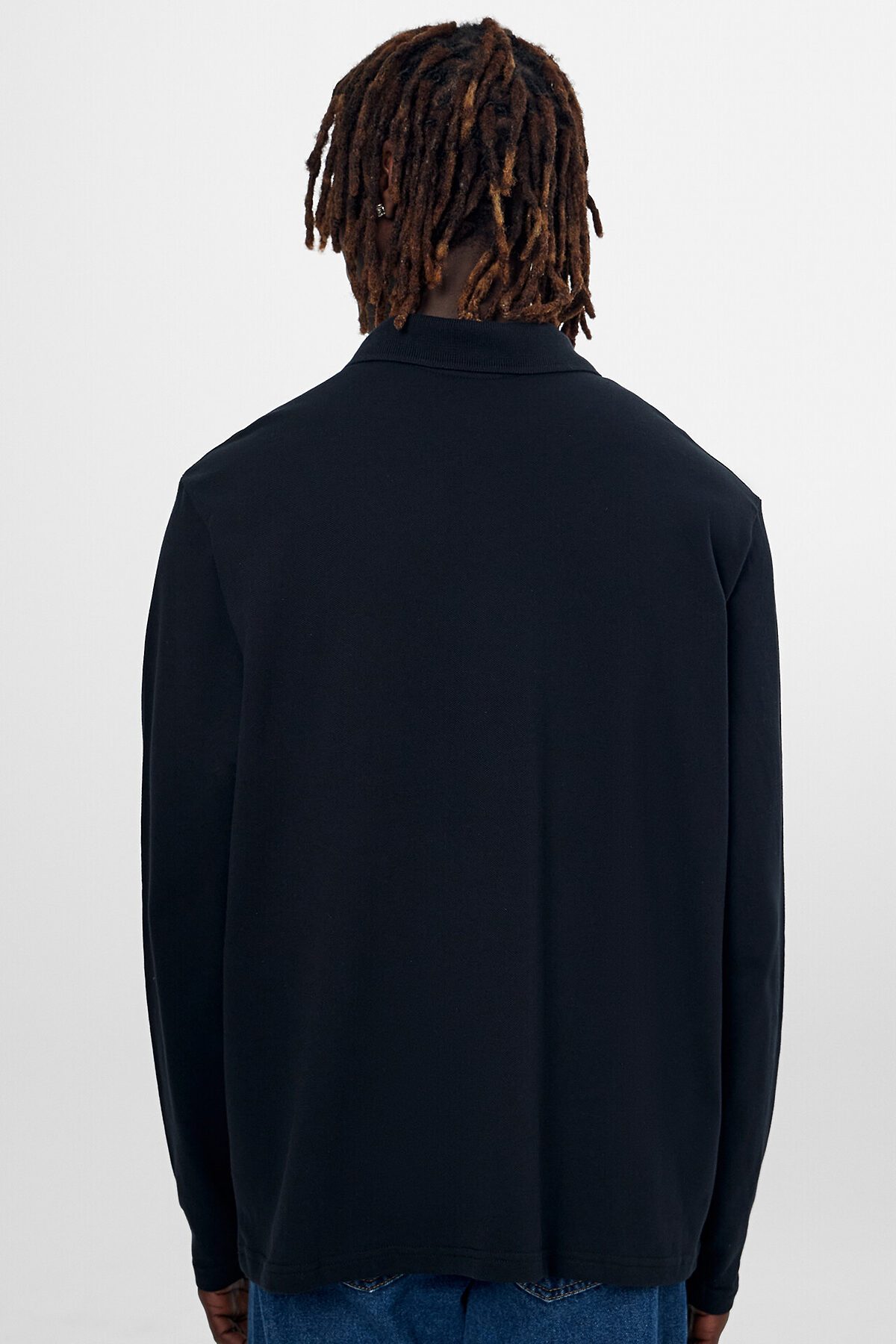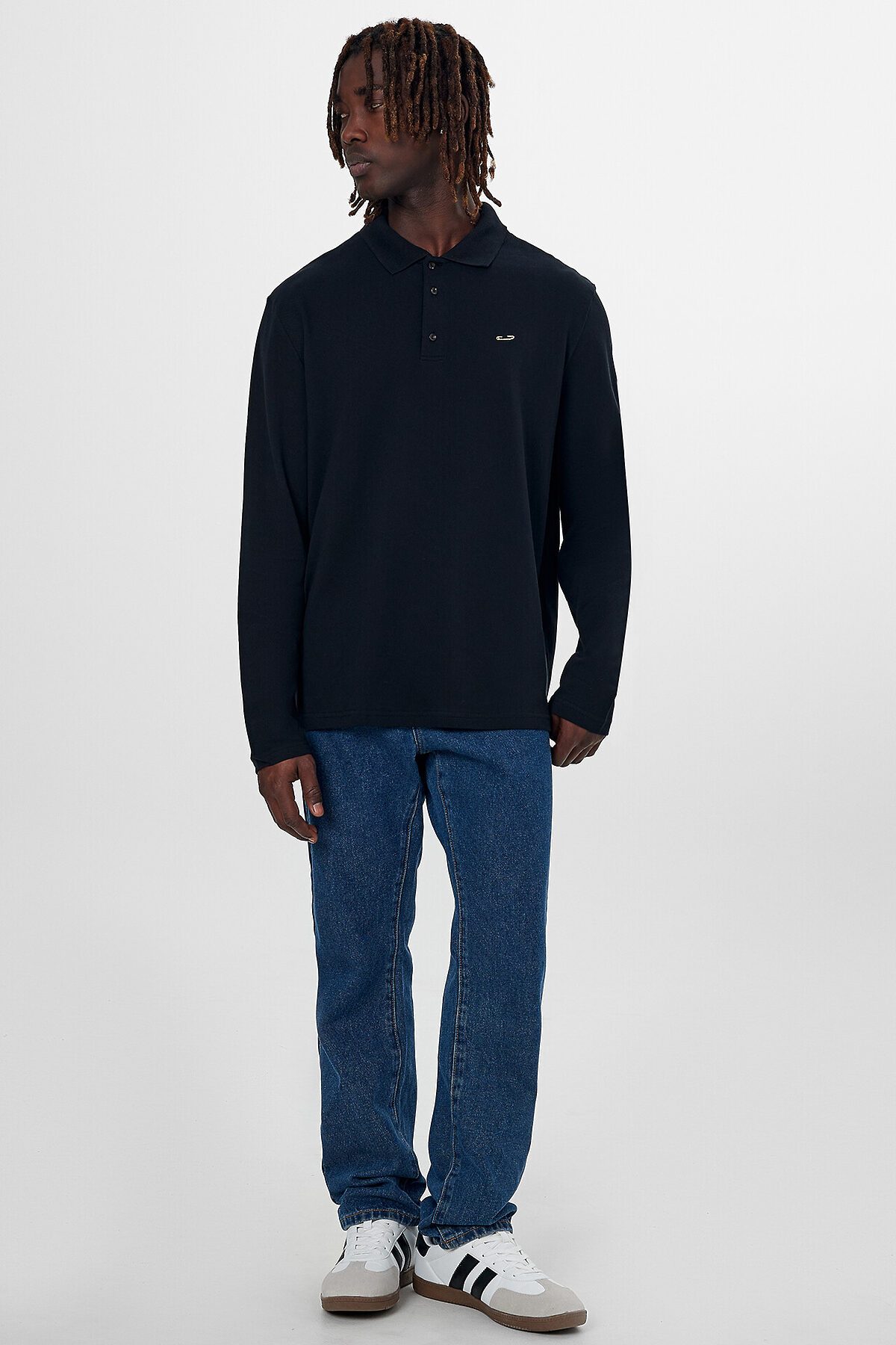Джемпер мужской «поло» изготовлен из трикотажного полотна пике. Джемпер прямого силуэта. Длина до середины бедер. Рукава втачные длинные. Линия плеча слегка спущена. Перед с застежкой "поло". Верхняя планка цельнокроеная. Застежка на 3 петли и пуговицы. Воротник - довяз. Шов втачивания довяза закрыт тесьмой из основного полотна. Низ джемпера и рукавов обработан швом вподгибку. Довяз. DVC-14 (DVC-90/001-5/5). Однотон с участком накладного жаккарда 001/5. 1*1, 9 см, 100% хлопок. Цвет 1 - все детали