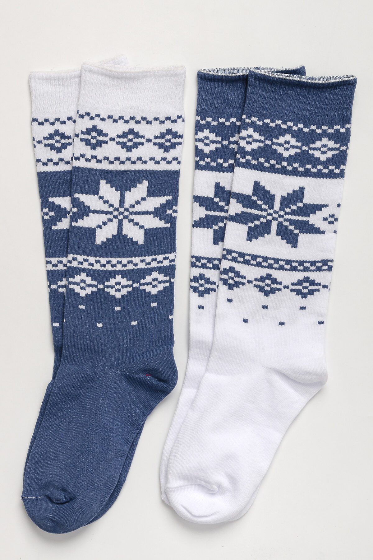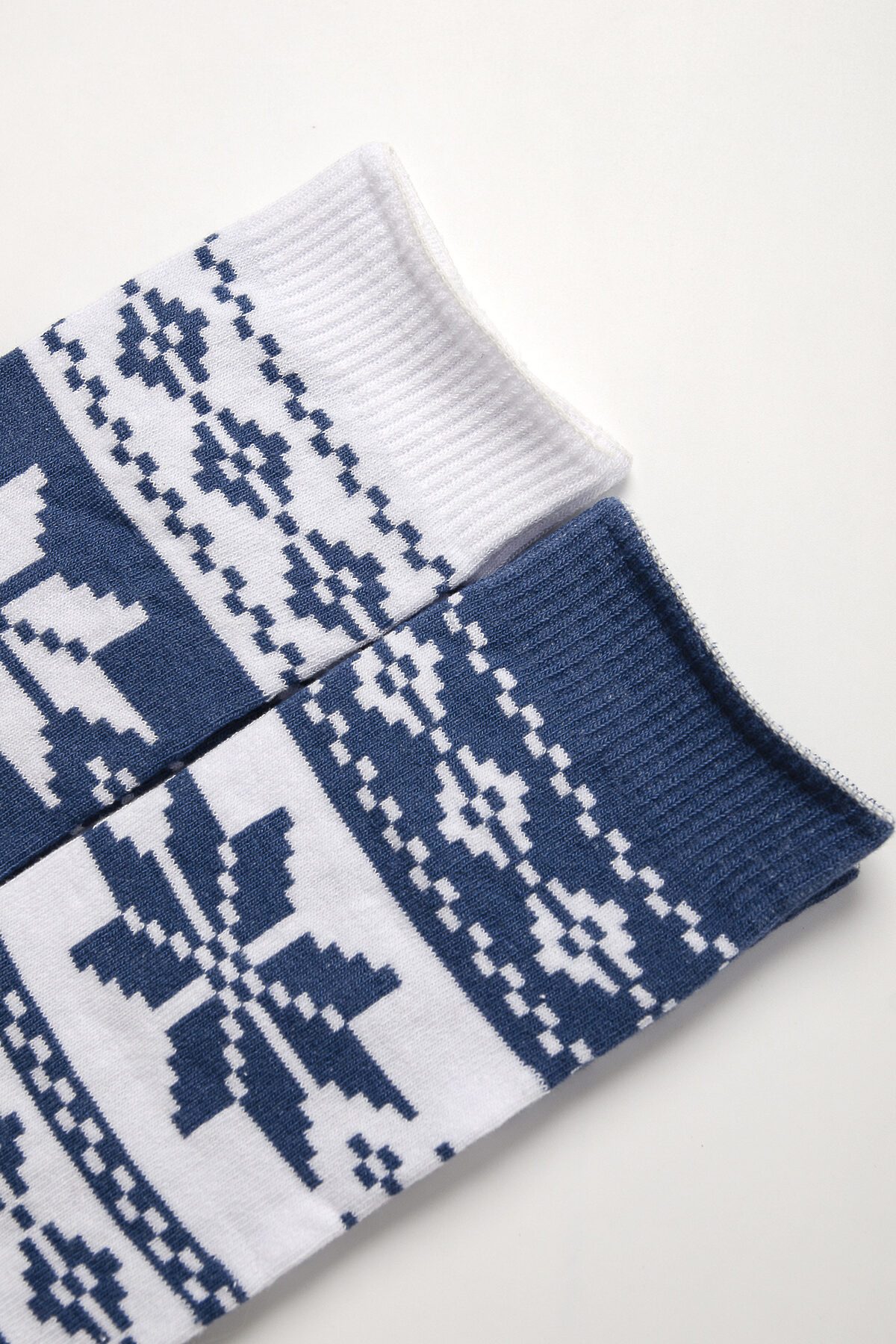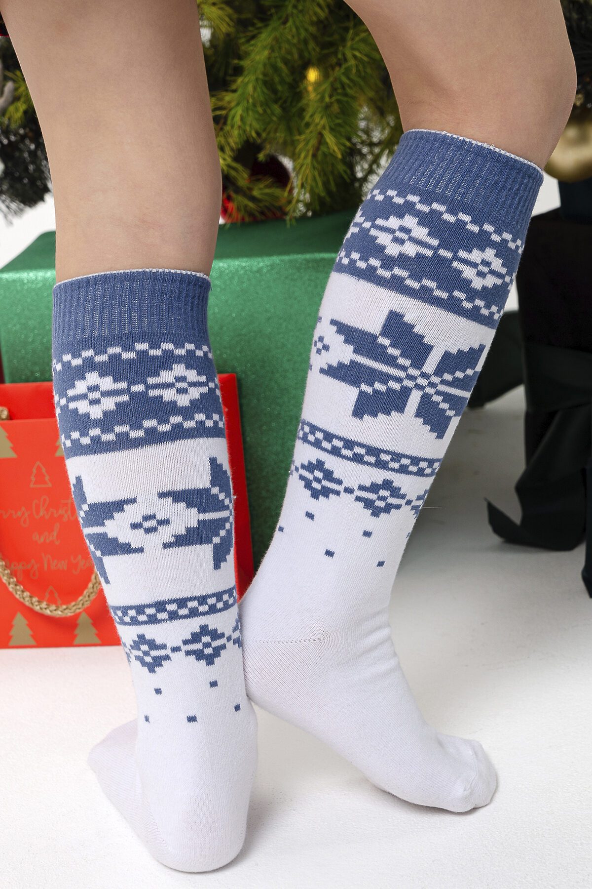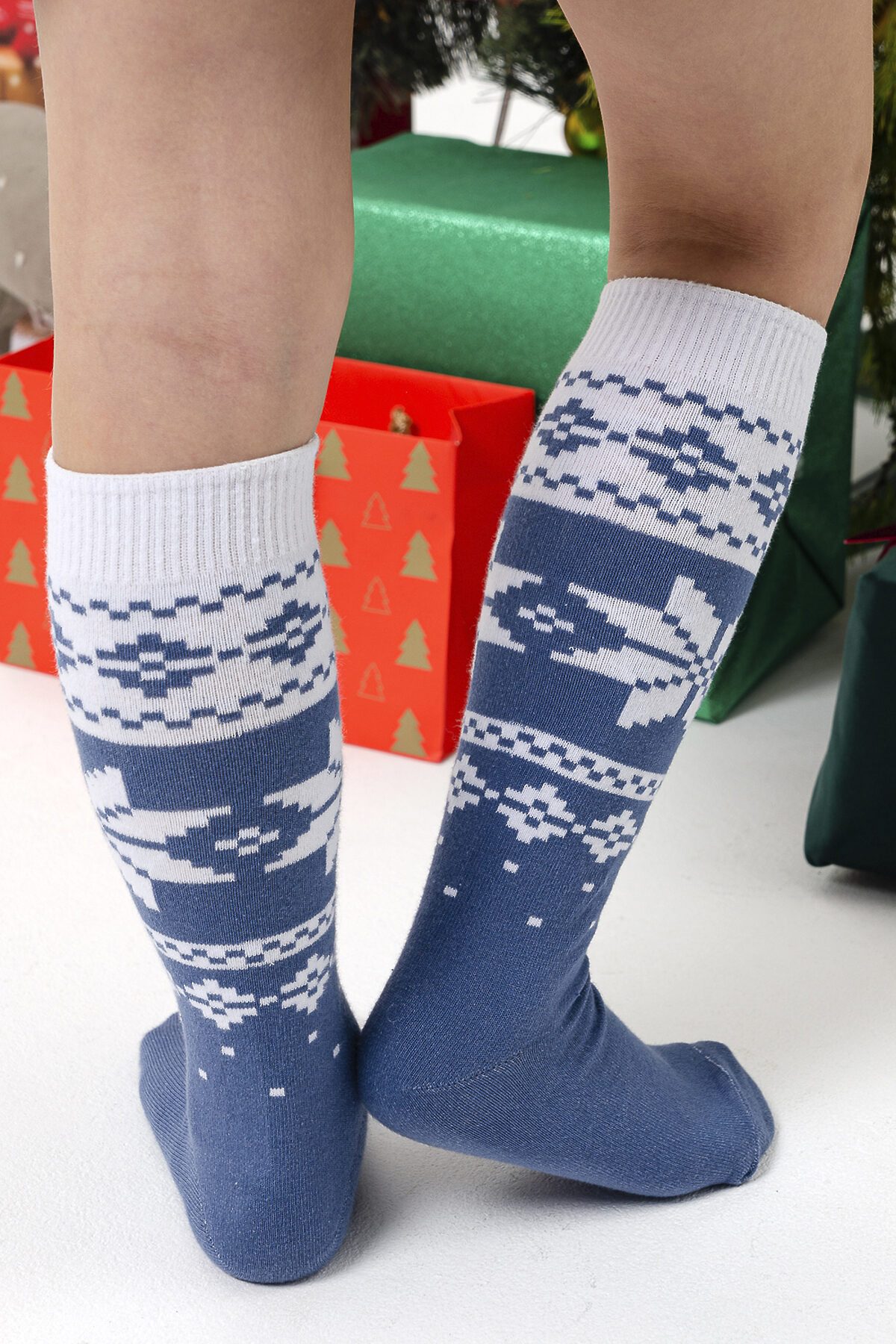 Очаровательные хлопковые гольфы отлично подойдут для встречи Нового года в семейном кругу или тематических фотосессий. Носки с новогодним рисунком это отличный сувенир друзьям, детям и коллегам. Благодаря удобной упаковке, можно подарить каждую пару отдельно. Новогодний принт на носках задает веселое настроение и притягивает взгляды окружающих. Высокое качество нитей сохраняет форму и цвет после стирки, а также препятствует образованию катышек. Такой новогодний подарок будет приятно получить и подарить! В набор входят 2 пары разных гольфов определенной расцветки на выбор - синей или серой.
