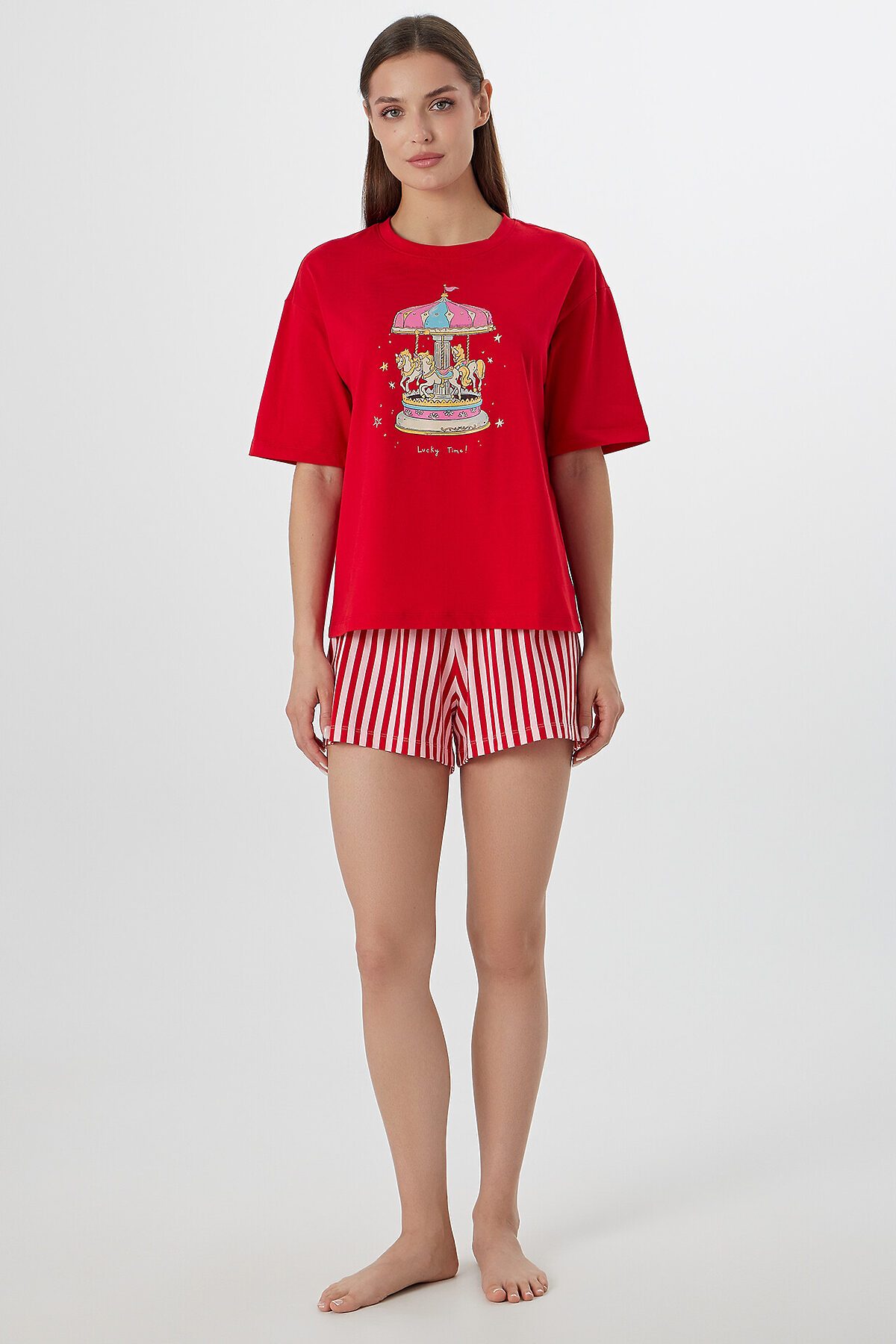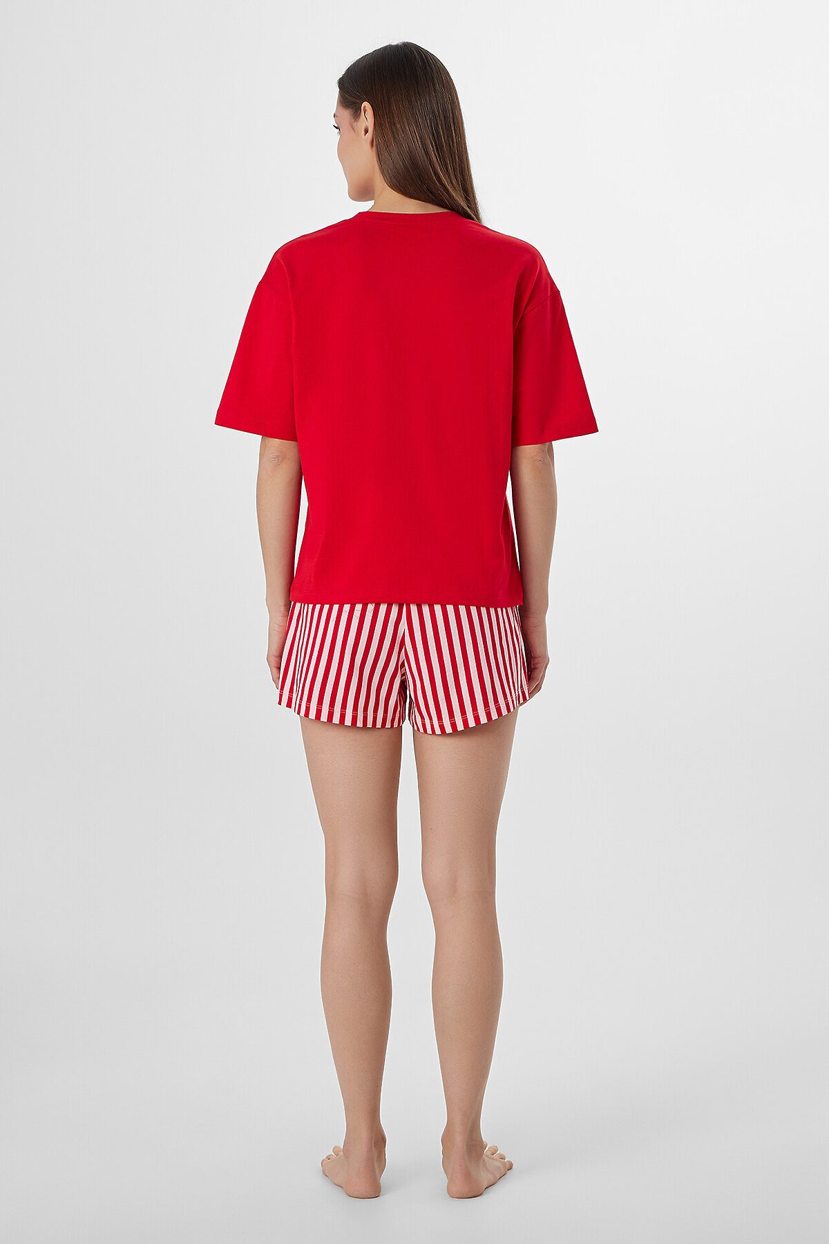 Женский домашний комплект — это гармоничное сочетание удобства и расслабленного стиля! Футболка свободного силуэта с круглой горловиной и слегка спущенной линией плеча создает уютный и непринужденный образ. Свободные короткие рукава и обработка нижних краев швом вподгибку придают аккуратность и обеспечивают комфорт. Шорты свободного кроя с эластичным поясом гарантируют удобную посадку и свободу движений. Нижний край шорт обработан швом вподгибку, что подчеркивает практичность и долговечность изделия. Пижама выполнена из мягкого и приятного материала, идеально подходящего для домашнего гардероба. Рекомендуем!