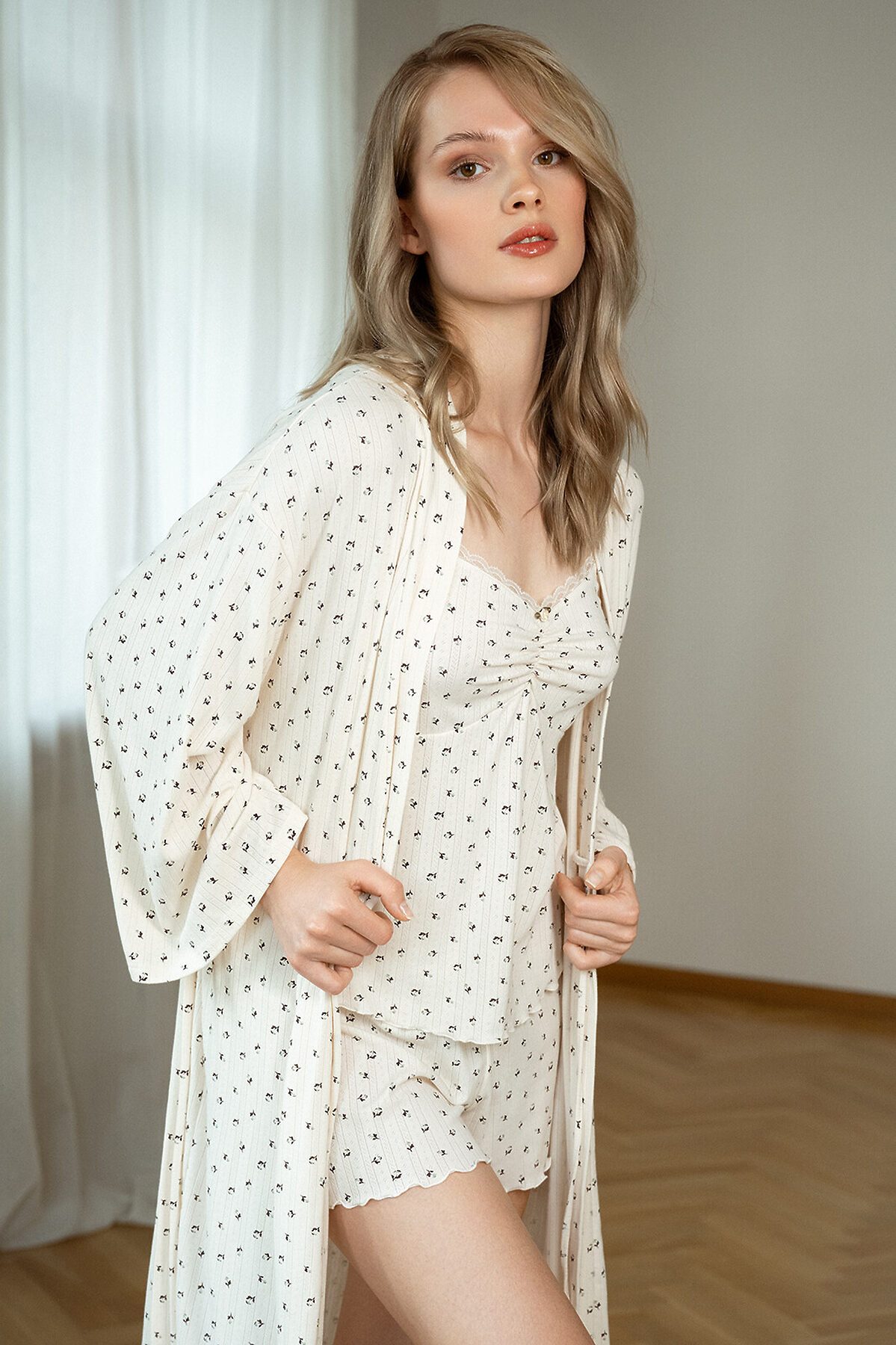 Халат выполнен в светлом базовом оттенке с рельефной текстурой. Украшен мелким нежным принтом с повторяющимся мотивом. Ткань мягкая и приятная на ощупь. Халат не сковывает движения, мягко облегает фигуру, подчёркивая ее естественные линии. Широкие рукава добавляют образу легкости. Пояс съёмный, продевается через петли, расположенные на талии халата.