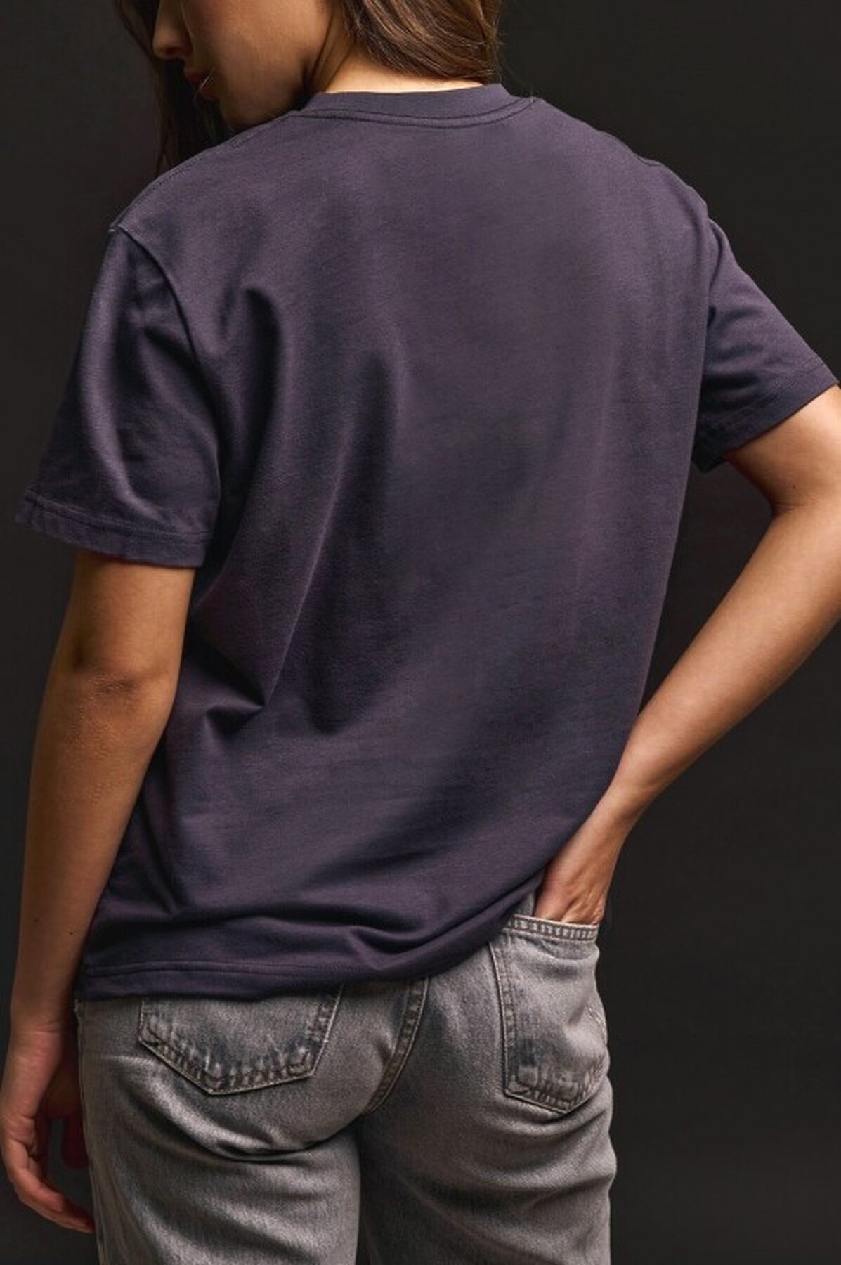 Boyfriend крой, укрепление по горловине спинки, круглый вырез. Горловина рибана. Отстрочка по горловине переда.