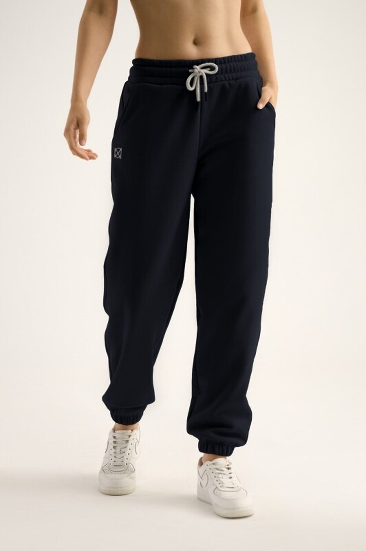 Джоггеры свободного кроя с боковыми карманами, собранные внизу. Широкий эластичный пояс со шнуром.