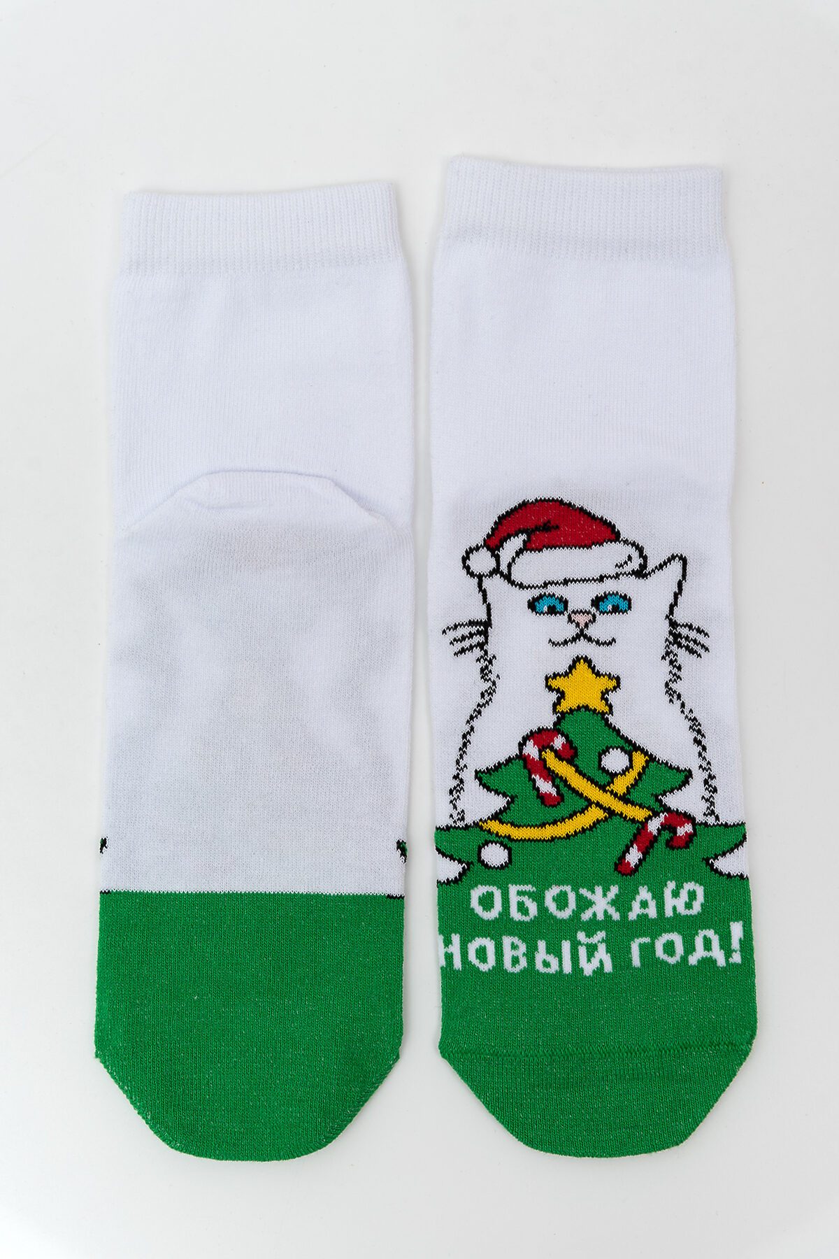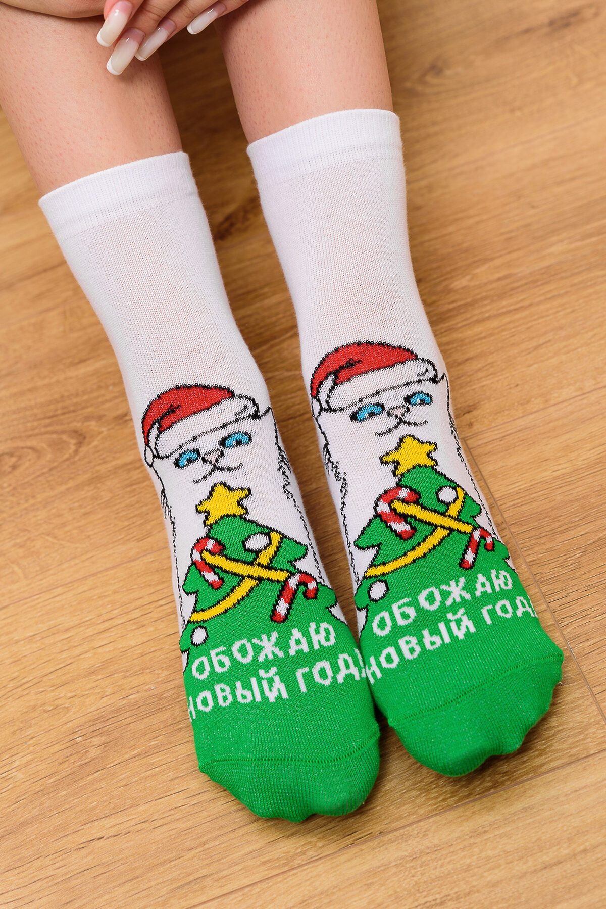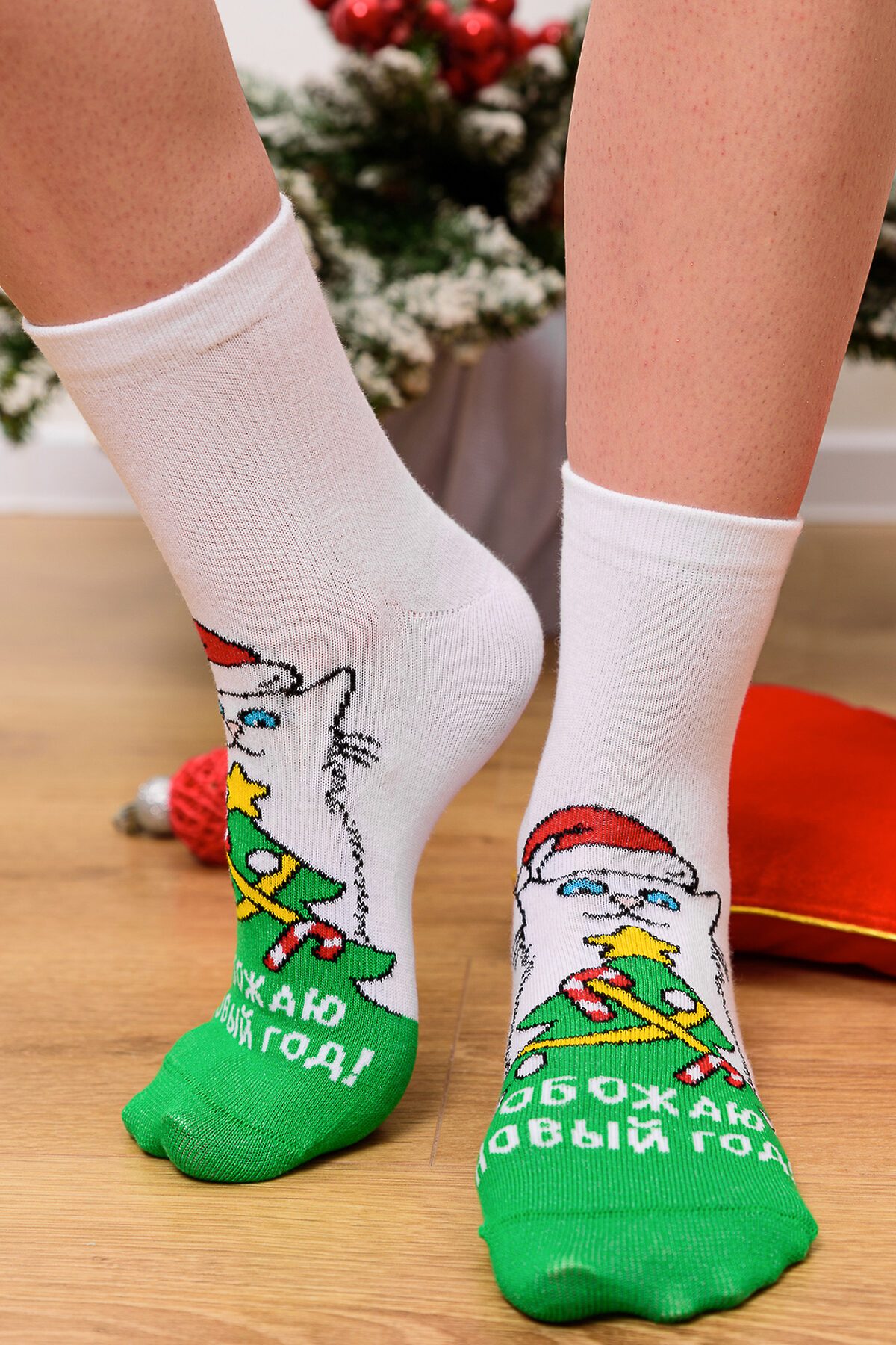 -Новогодние женские носки с изображением новогодней елки и кота. Отличный подарок на праздник!