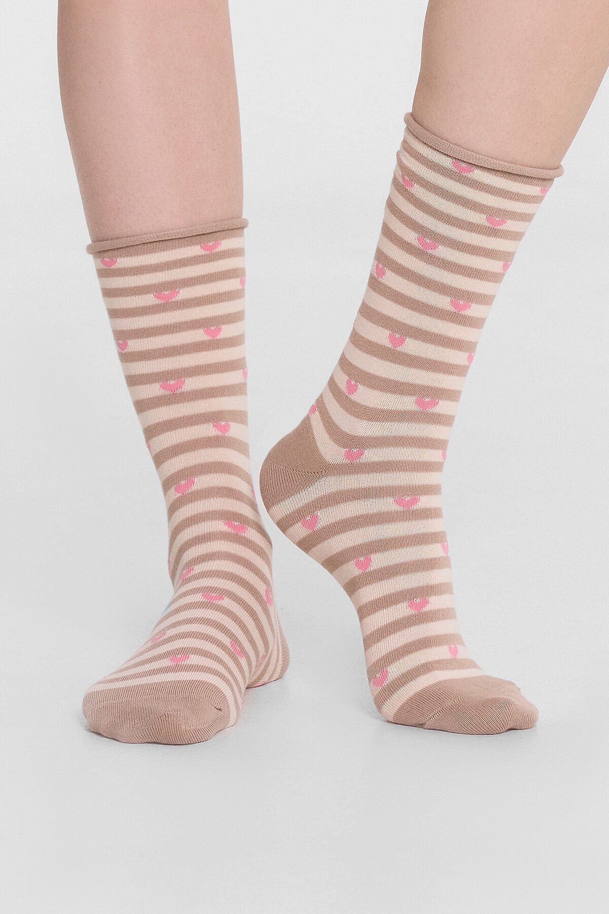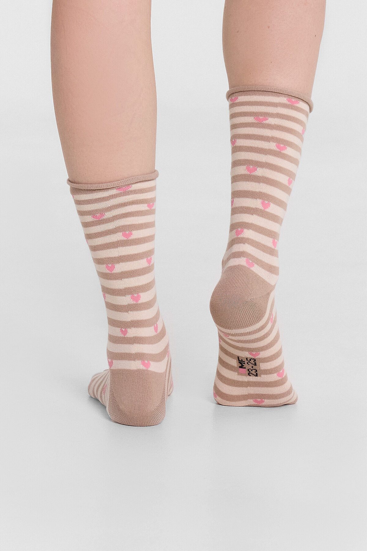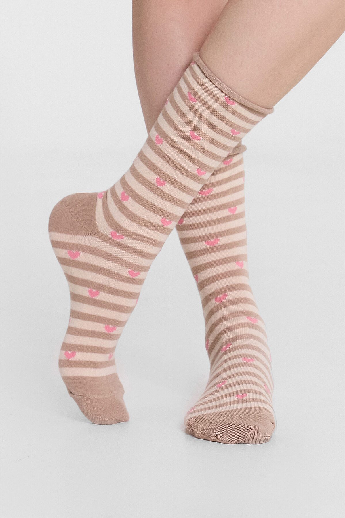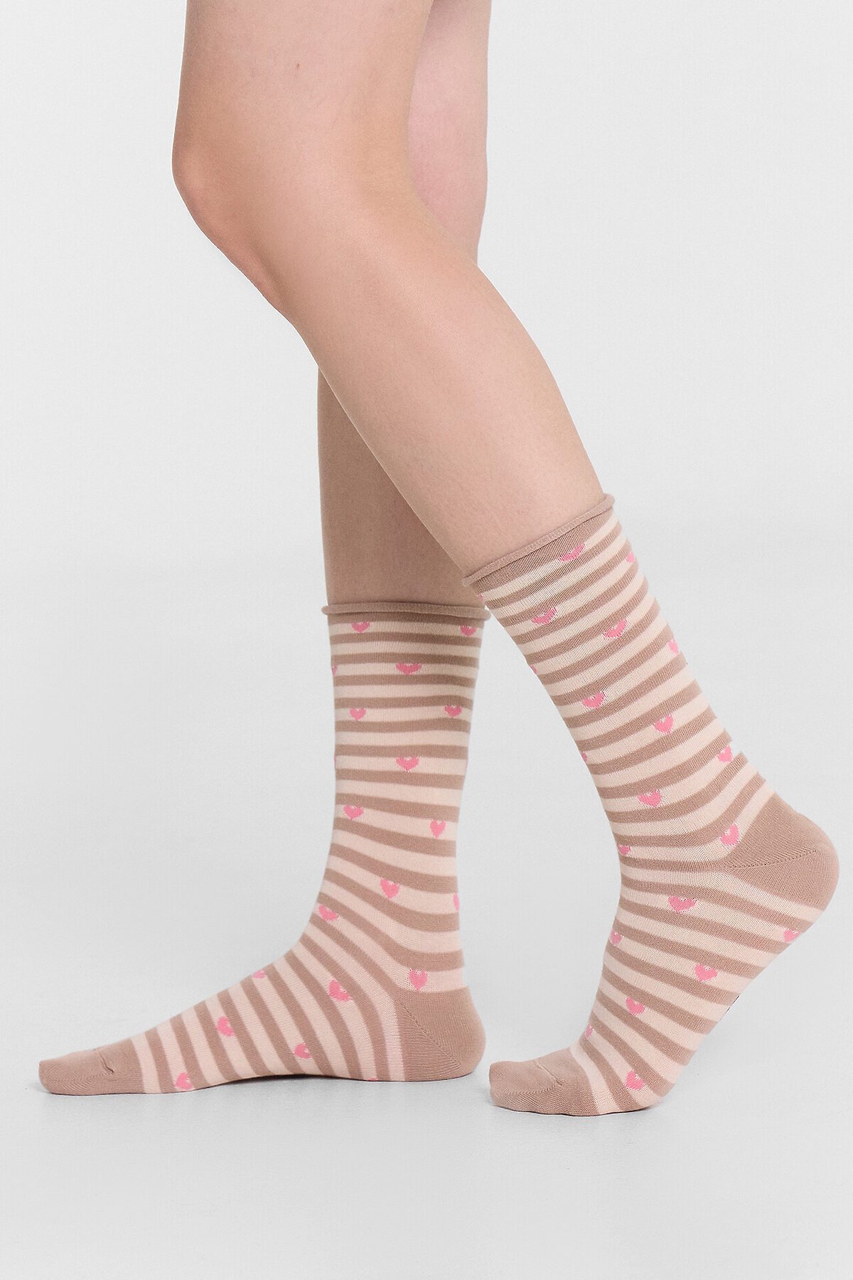Длинные женские носки без резинки с узором в виде сердечек - незаменимая вещь в гардеробе, самостоятельный стильный атрибут и возможность расставить акценты в любом образе. Они изготовлены из гребенного хлопка - пряжи высочайшего качества, тонкой, прочной и долговечной. Натуральные волокна отлично пропускают воздух, позволяя коже дышать, и впитывают влагу, поэтому такие носочки дарят ощущение комфорта в течение всего дня. Благодаря небольшому количеству эластана в составе, они хорошо облегают стопу и сохраняют форму даже после множества стирок. Пятка и мысок усилены для защиты от протирания.