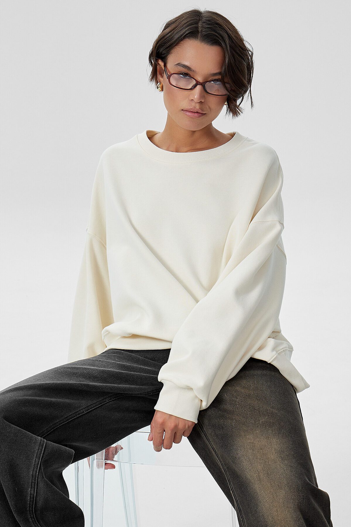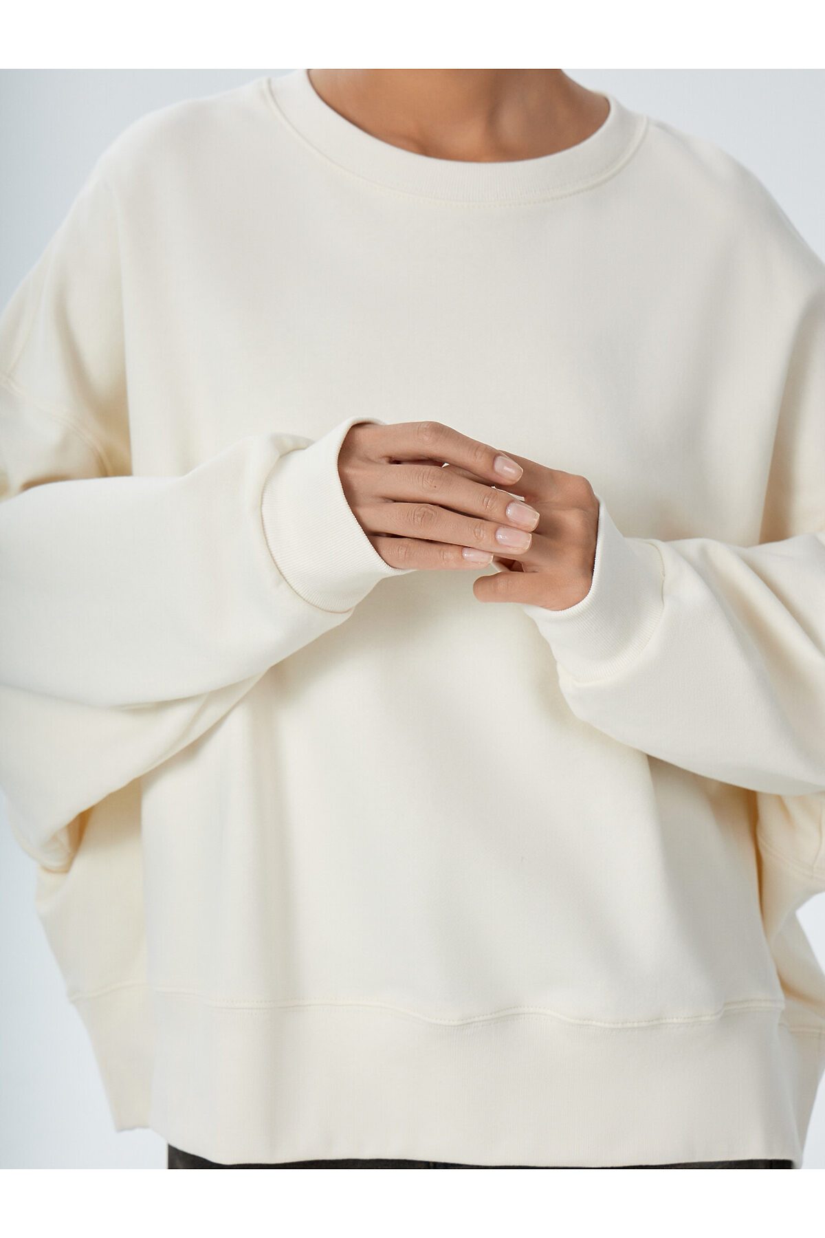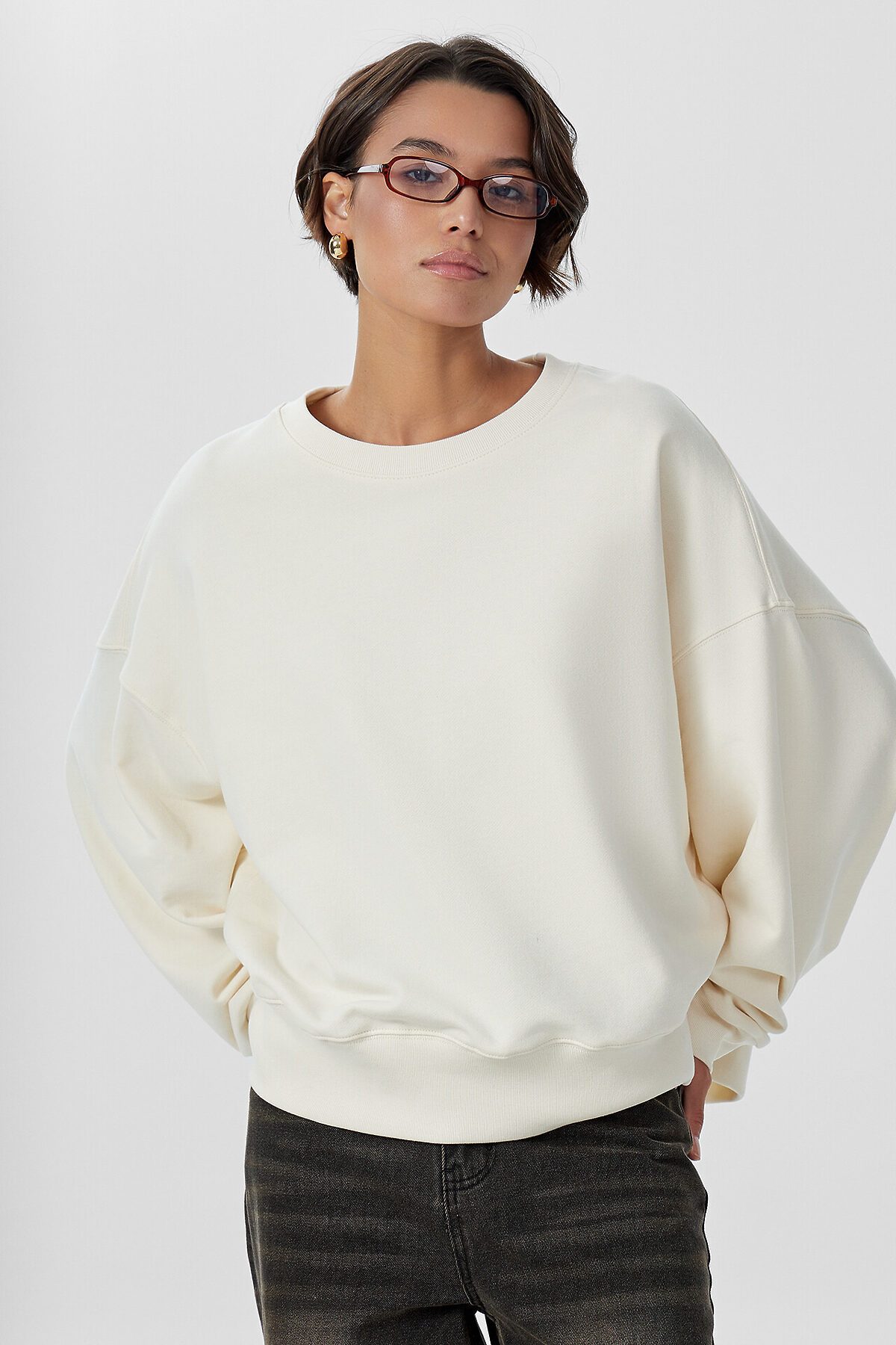 Джемпер женский оверсайз силуэта из трикотажного полотна футер. Горловина круглой формы, обтачка горловины из рибаны. По горловине проложены отделочные строчки. Плечо спущено, пройма углублена. Рукав, втачной, обьемный, длинный. По низу рукава отрезная манжета из рибаны. По плечевому шву и пройме проложены отделочные строчки. Джемпер с отрезным бочком, по швам проложены отделочные строчки. Пояс отрезной из рибаны.