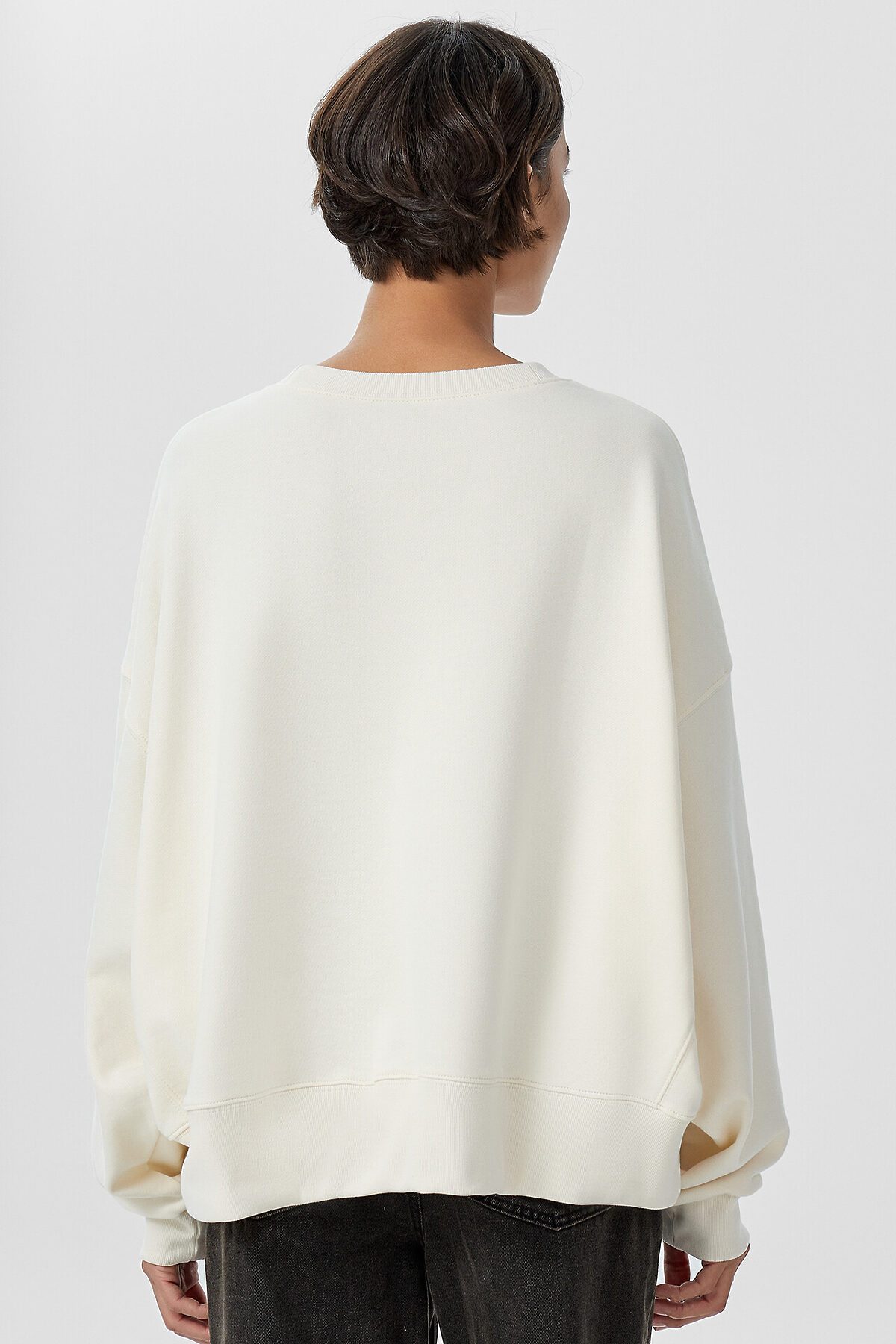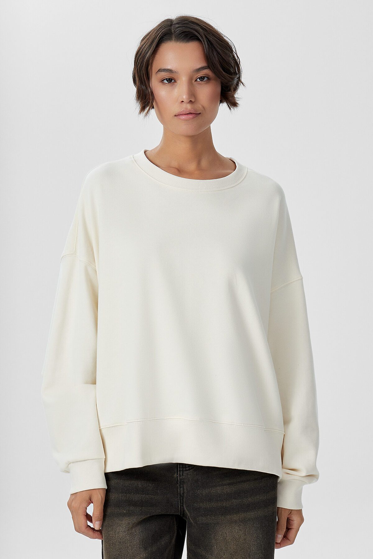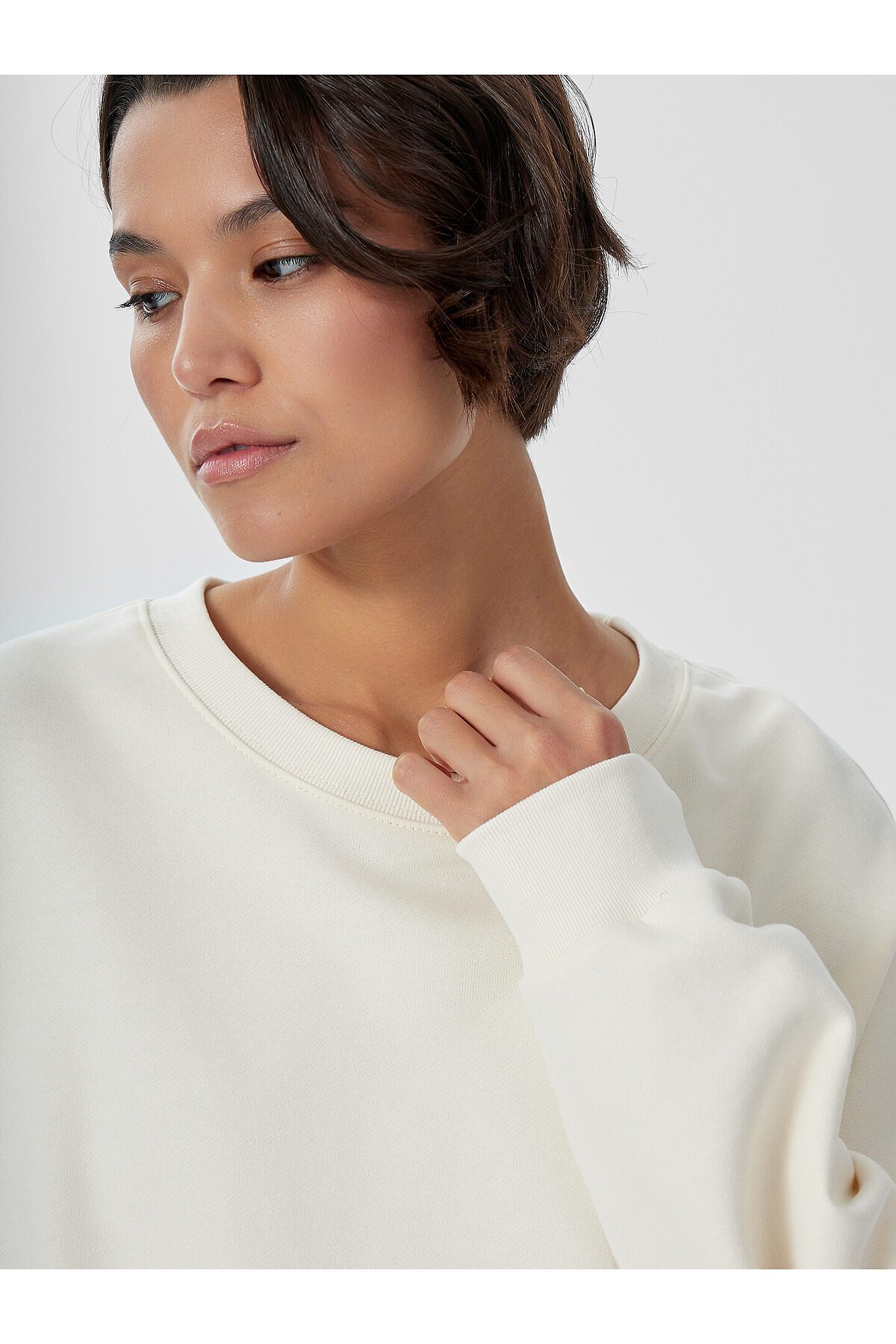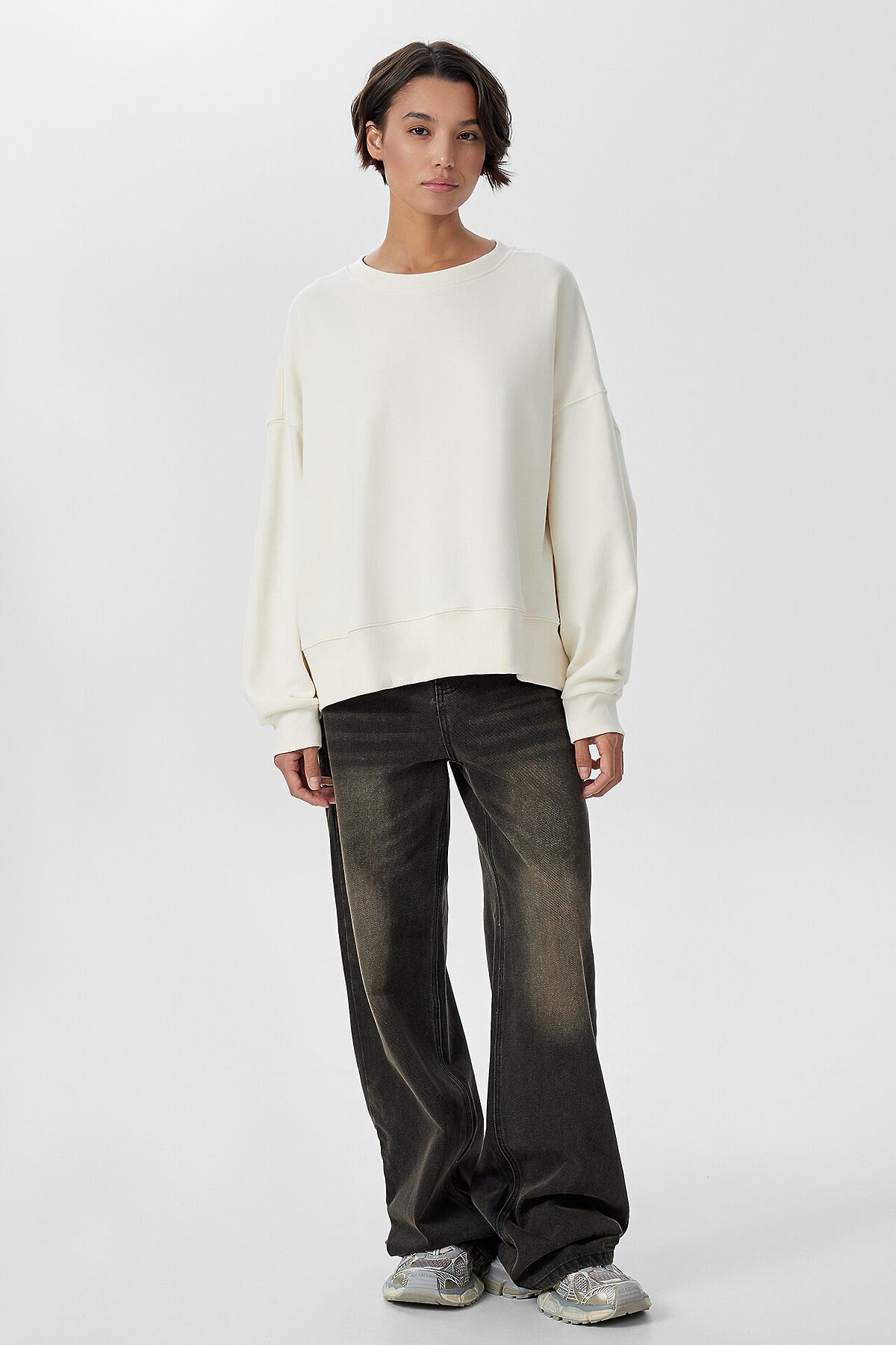 Джемпер женский оверсайз силуэта из трикотажного полотна футер. Горловина круглой формы, обтачка горловины из рибаны. По горловине проложены отделочные строчки. Плечо спущено, пройма углублена. Рукав, втачной, обьемный, длинный. По низу рукава отрезная манжета из рибаны. По плечевому шву и пройме проложены отделочные строчки. Джемпер с отрезным бочком, по швам проложены отделочные строчки. Пояс отрезной из рибаны.