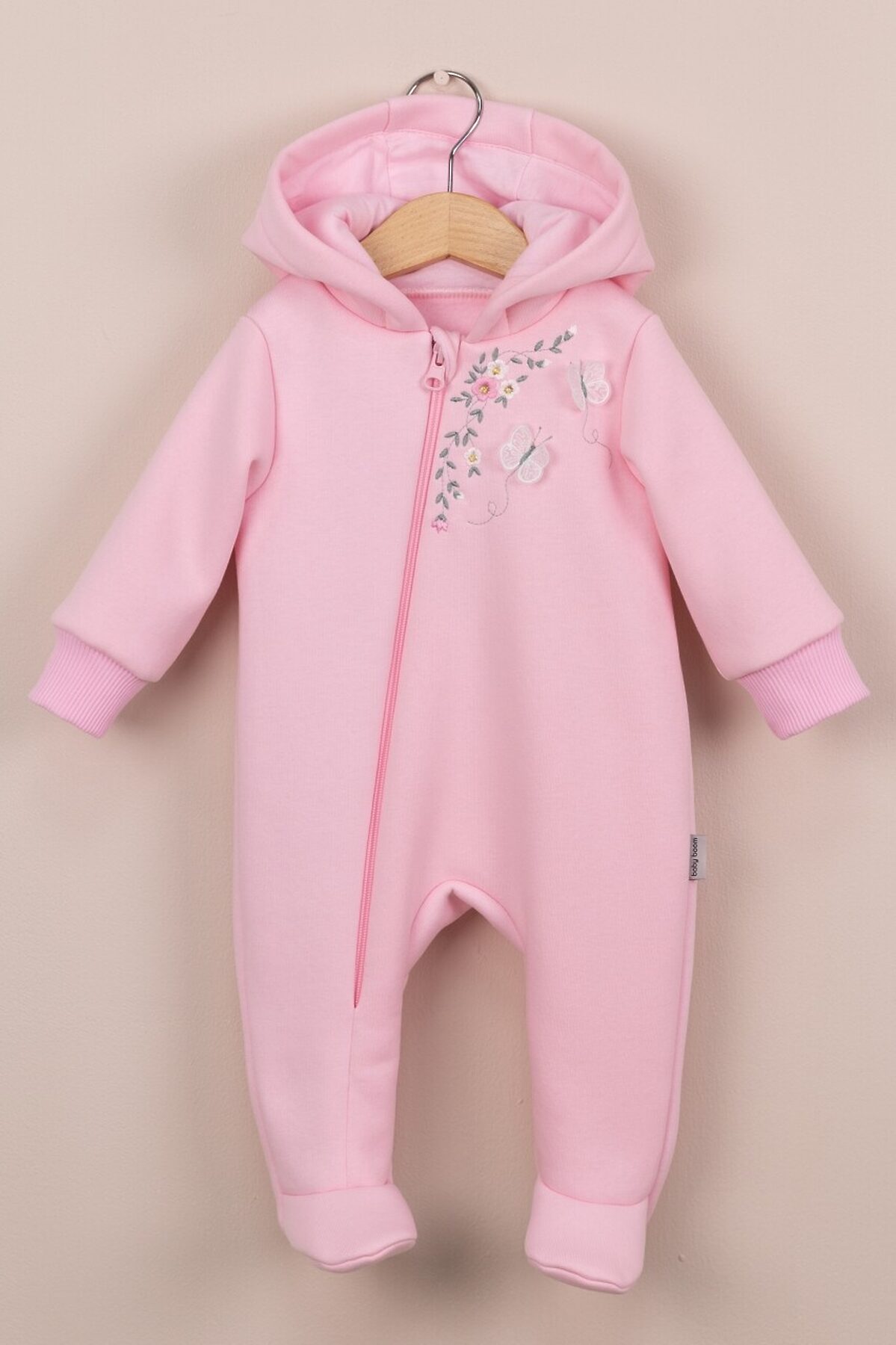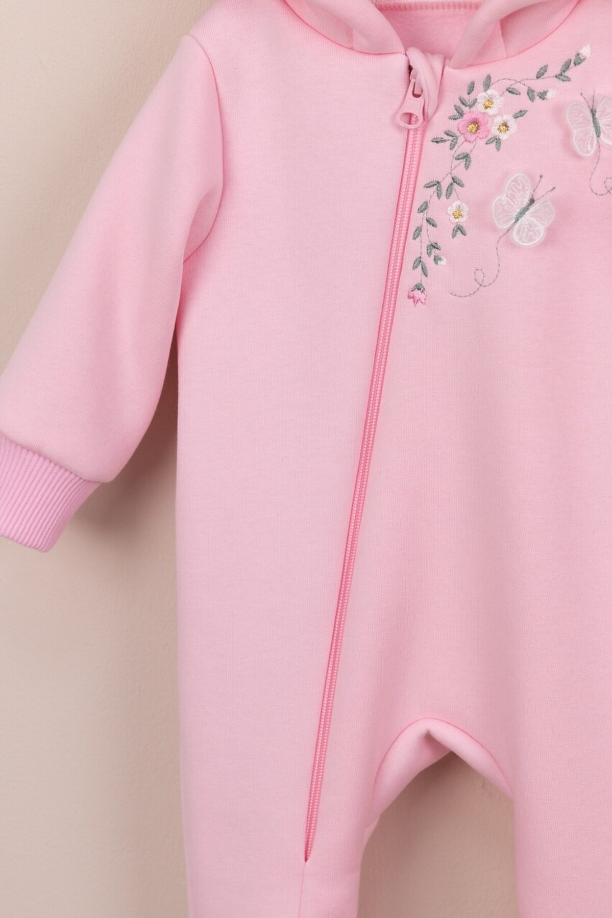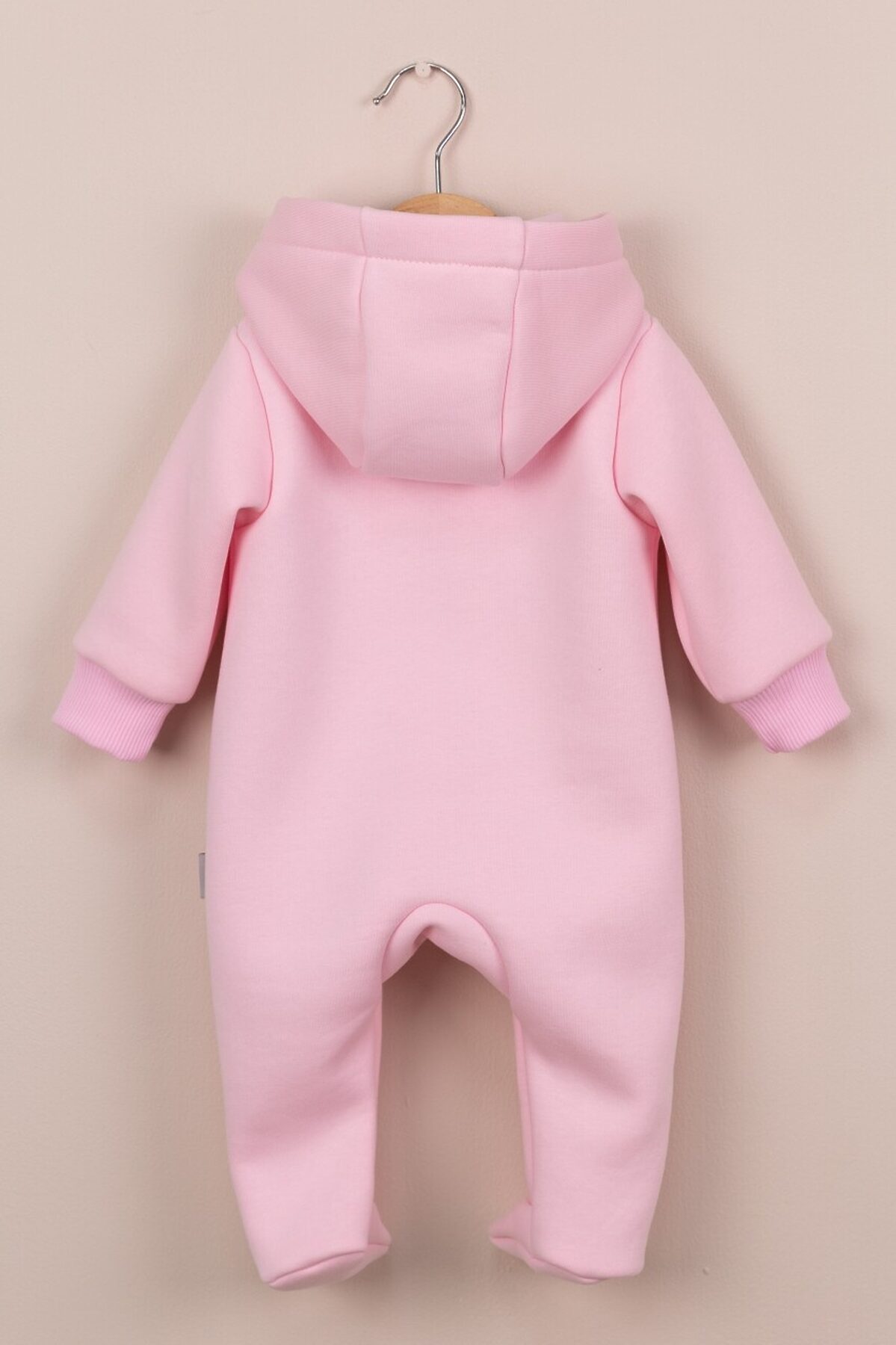 Комбинезон с вышивкой по переду, с капюшоном и косой молнией. Выполнен из футера 3-нитки с начёсом (80 % хлопок, 20 % полиэстер).