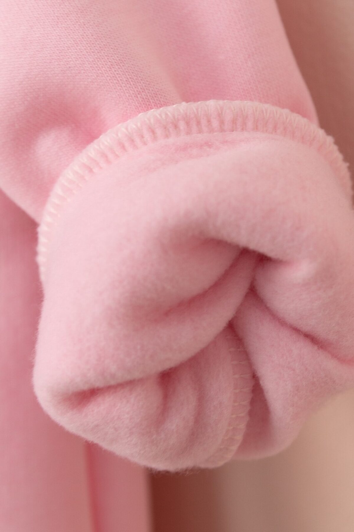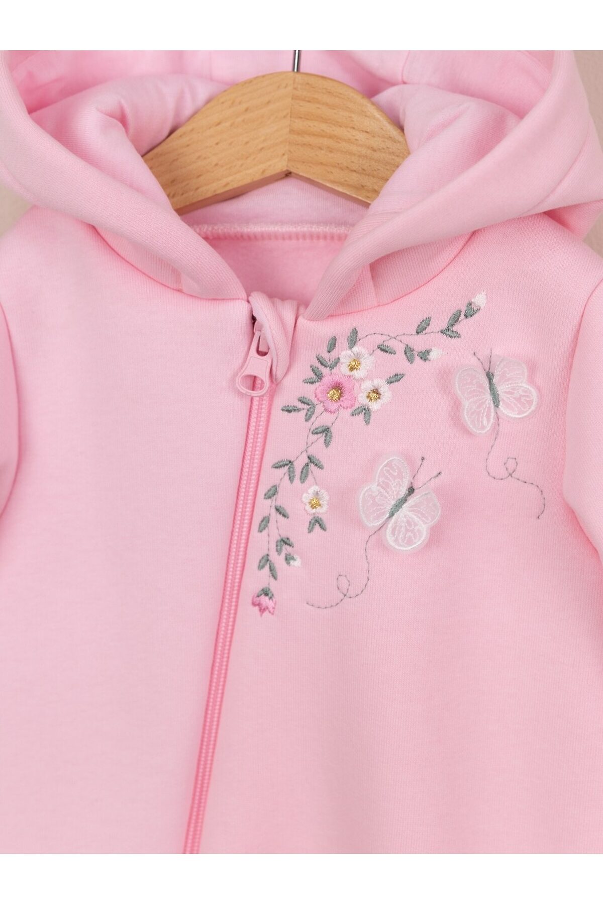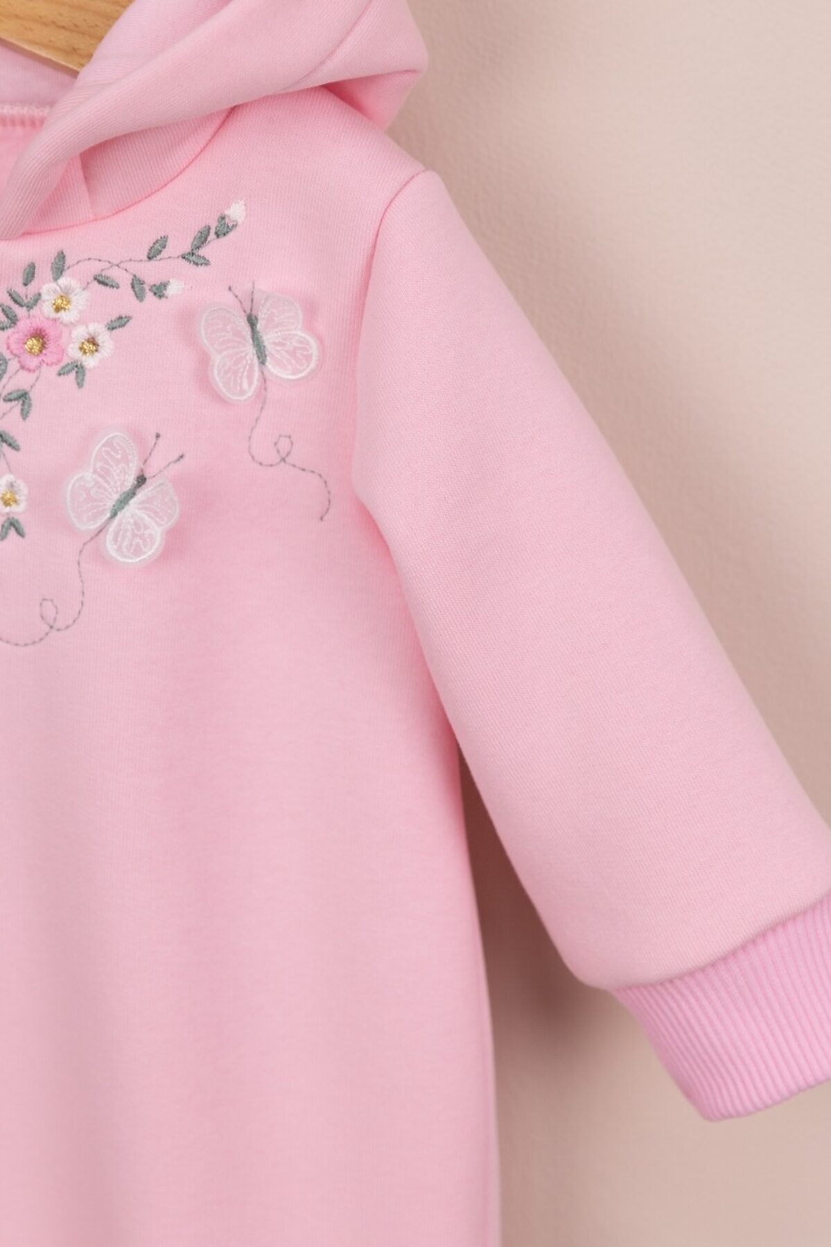 Комбинезон с вышивкой по переду, с капюшоном и косой молнией. Выполнен из футера 3-нитки с начёсом (80 % хлопок, 20 % полиэстер).