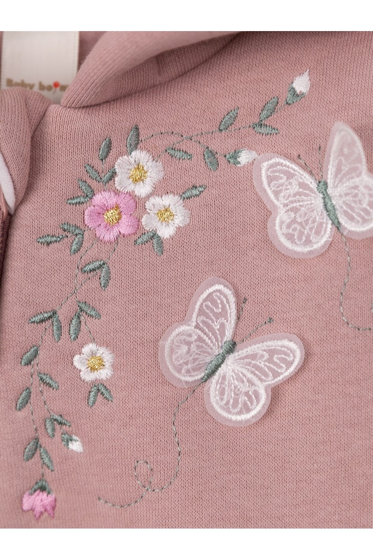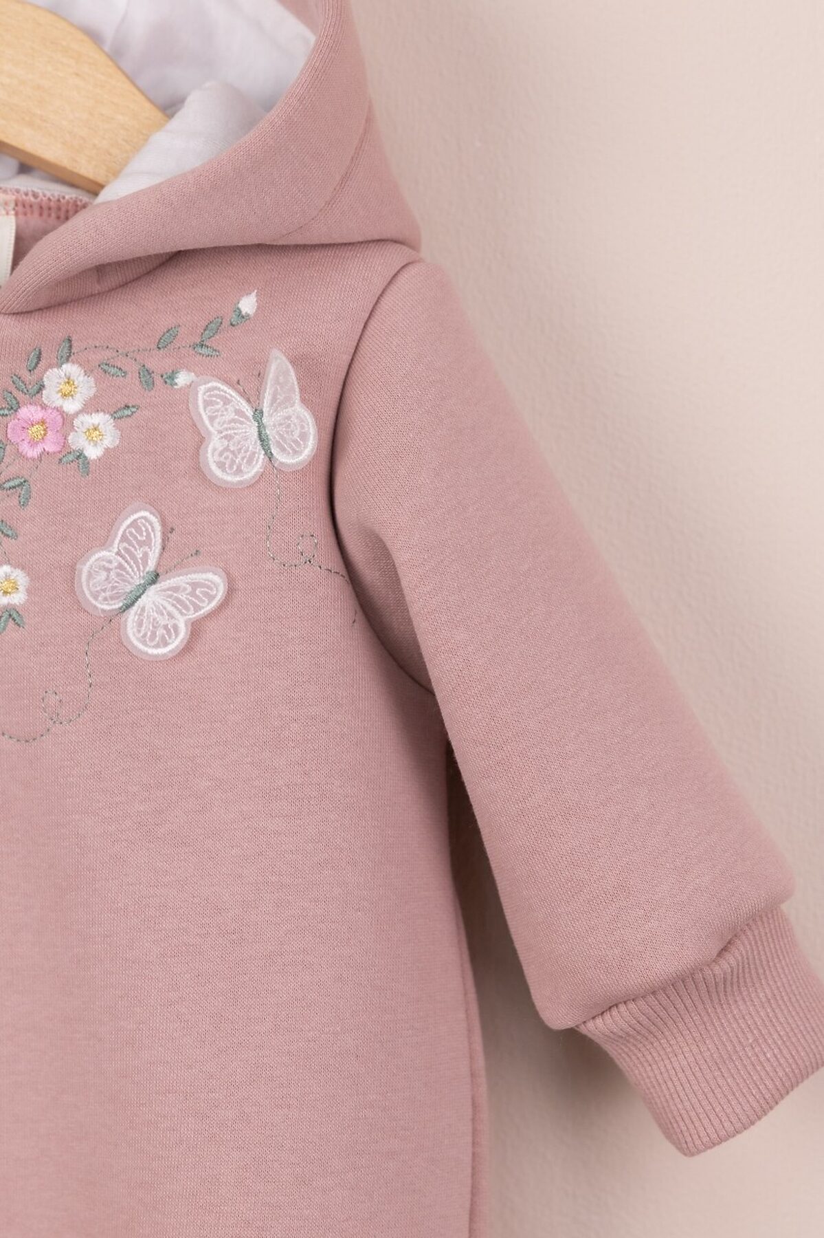Комбинезон с вышивкой по переду, с капюшоном и косой молнией. Выполнен из футера 3-нитки с начёсом (80 % хлопок, 20 % полиэстер).