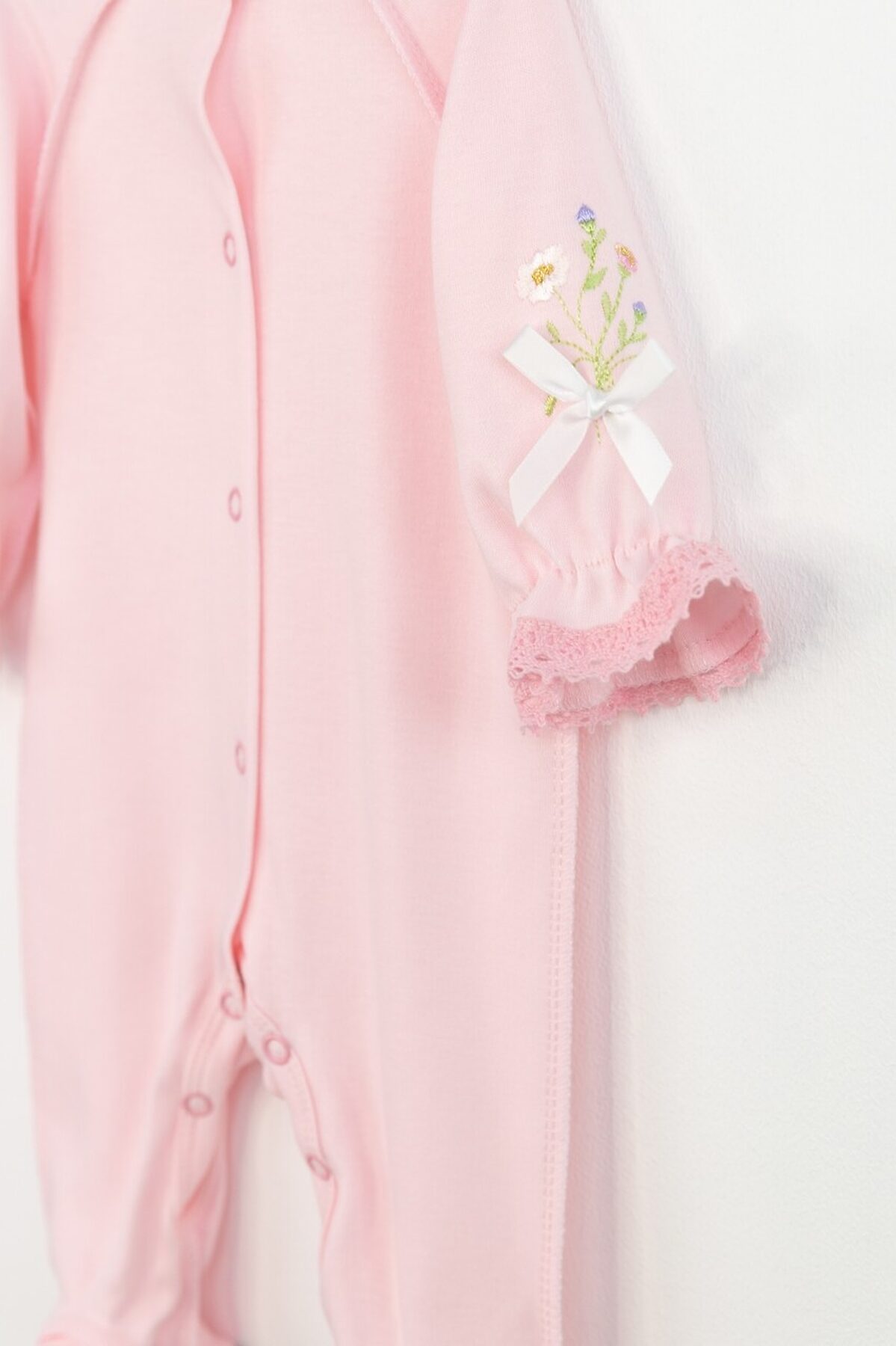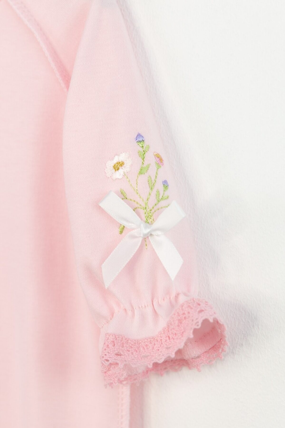 Элегантный комплект для малышки, состоит из комбинезона с центральной застежкой на кнопках и чепчика. По низу рукавов и переду чепчика настрочено кружево. Рукава украшены вышивкой - букетик цветов с бантиком. Комплект выполнен швами наружу из интерлока (100% хлопок).