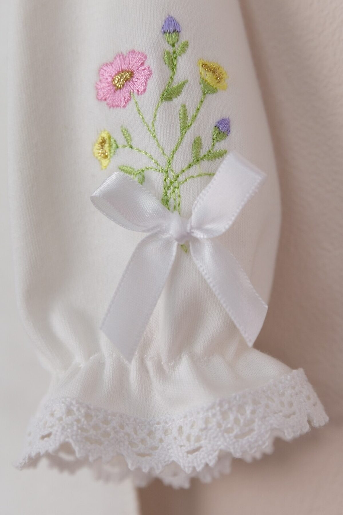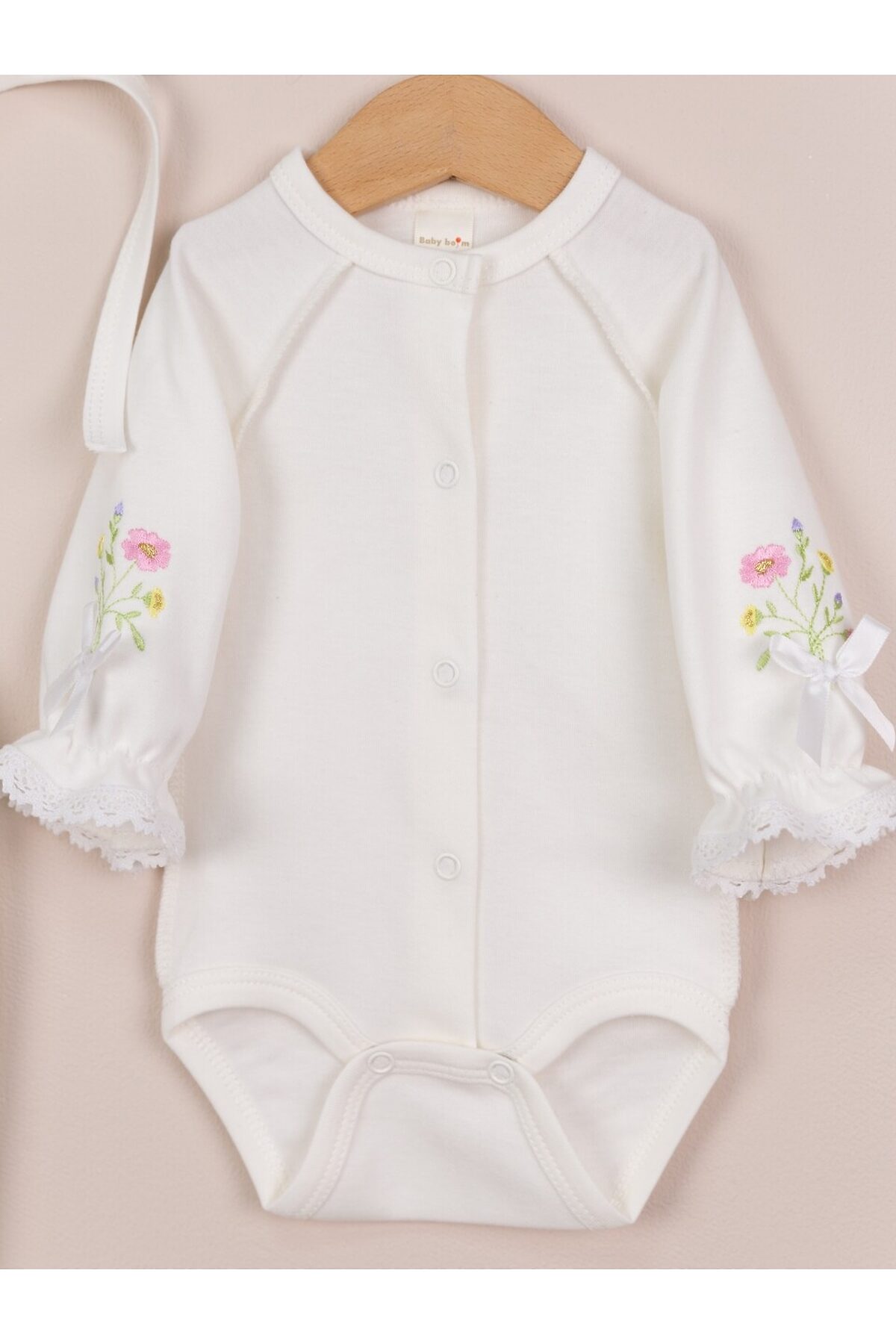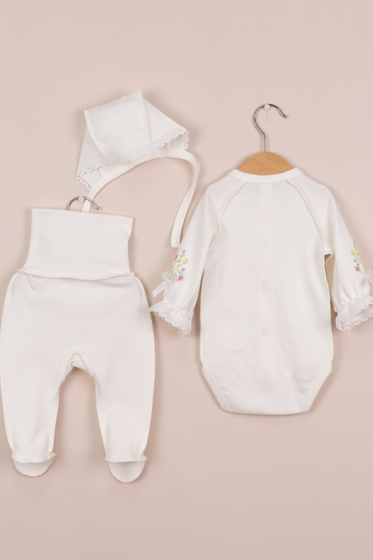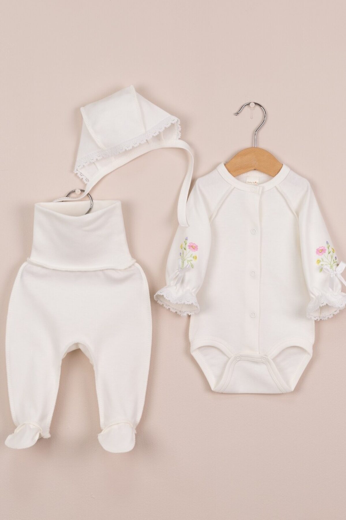 Элегантный комплект для малышки, состоит из боди с центральной застежкой на кнопках, ползунков и чепчика. По низу рукавов и переду чепчика настрочено кружево. Рукава украшены вышивкой - букетик цветов с бантиком. Комплект выполнен швами наружу из интерлока, 100% хлопок.