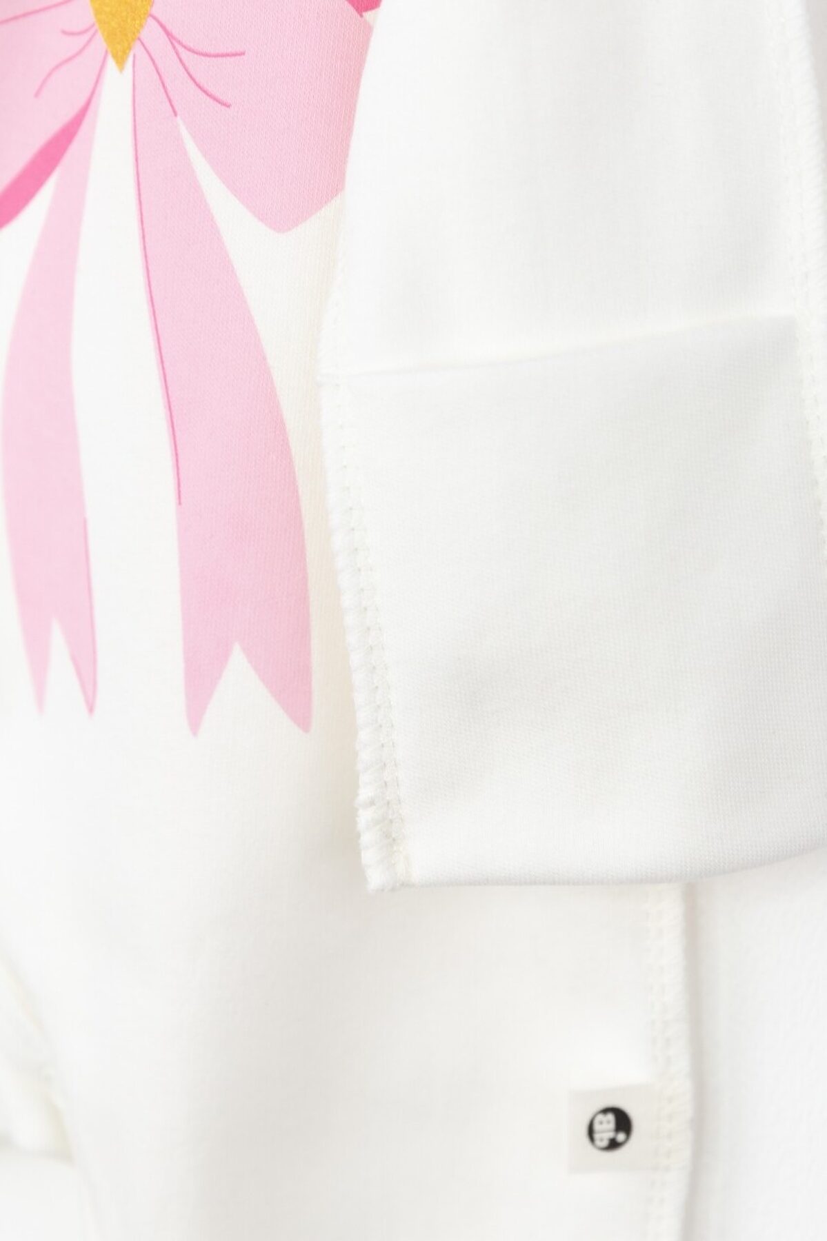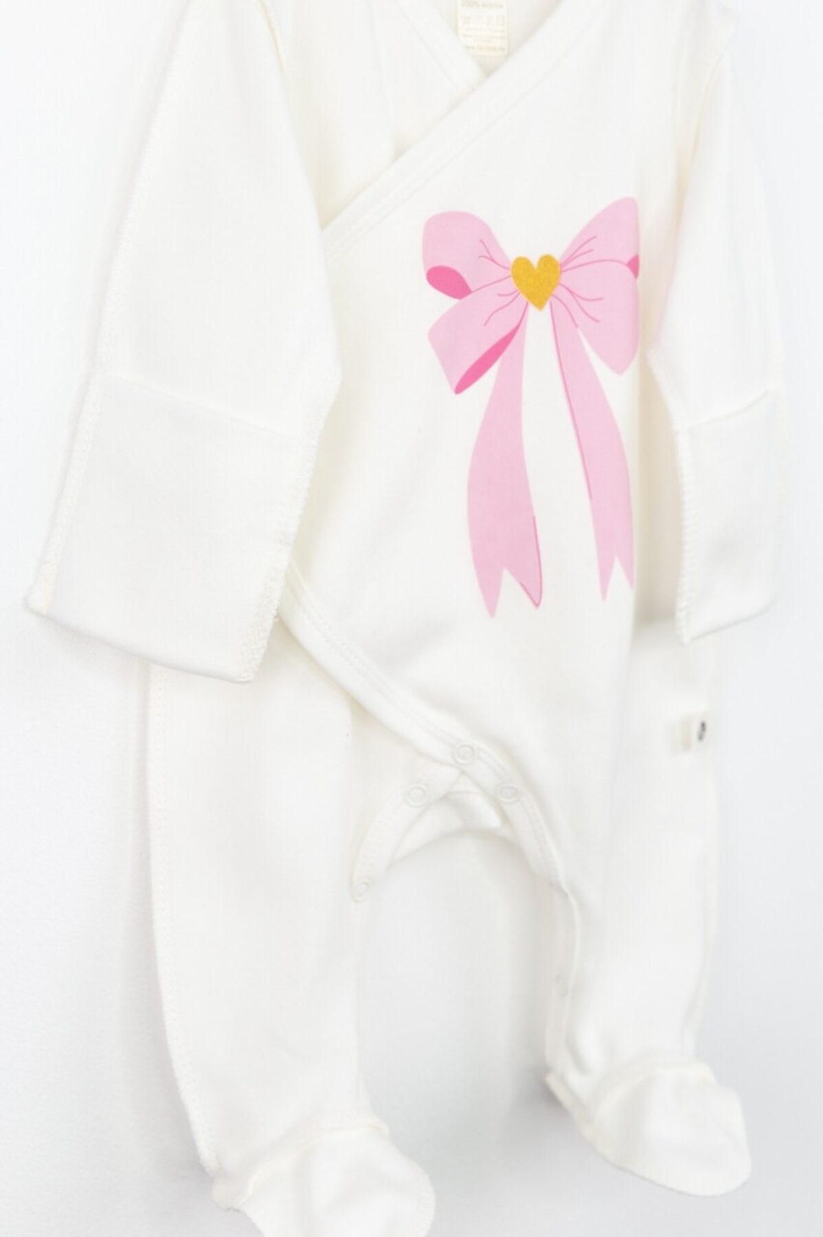 Комбинезон с запахом и антицарапками по низу рукавов, с печатью по переду. Выполнен из интерлока (100% хлопок).