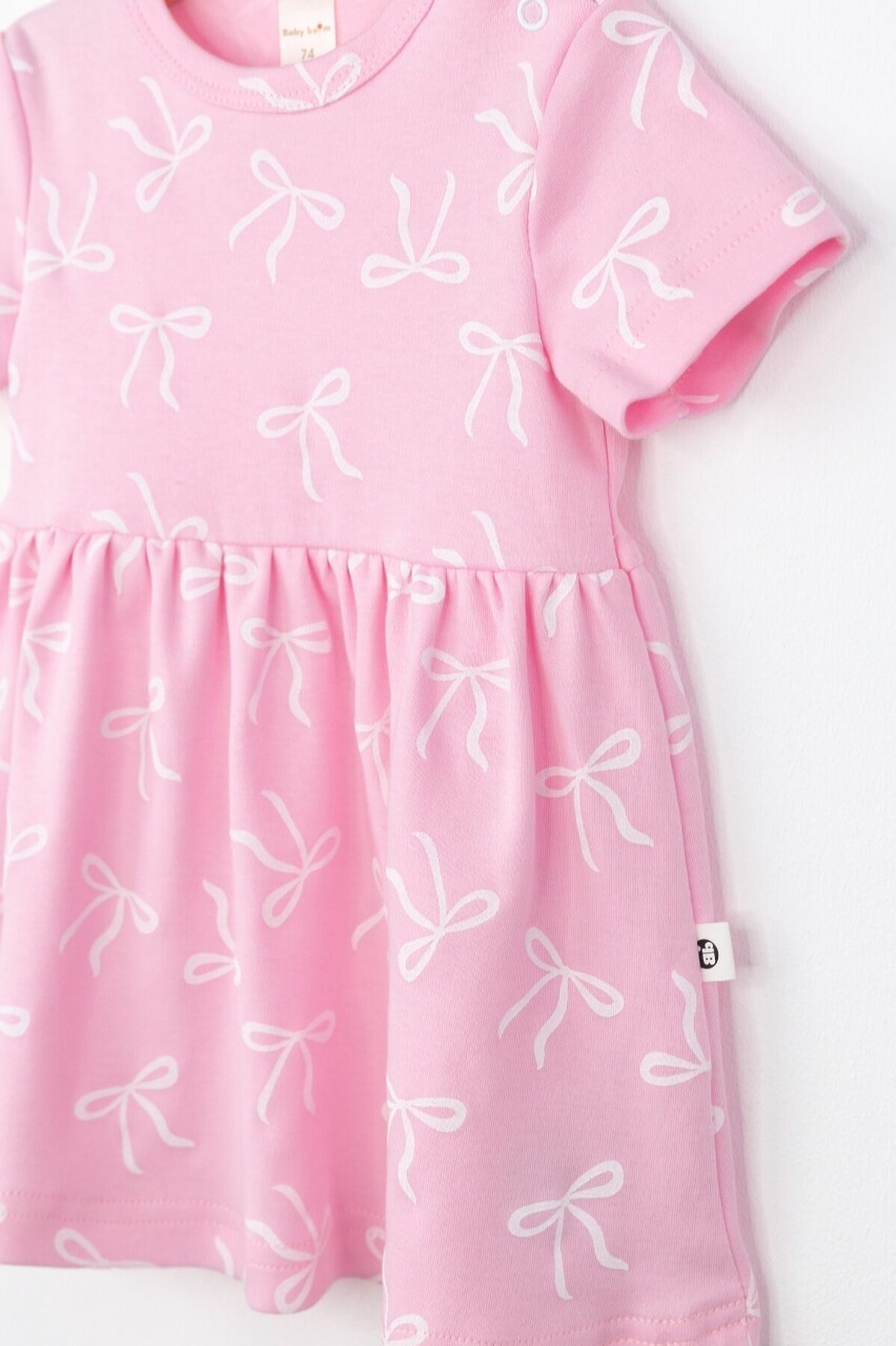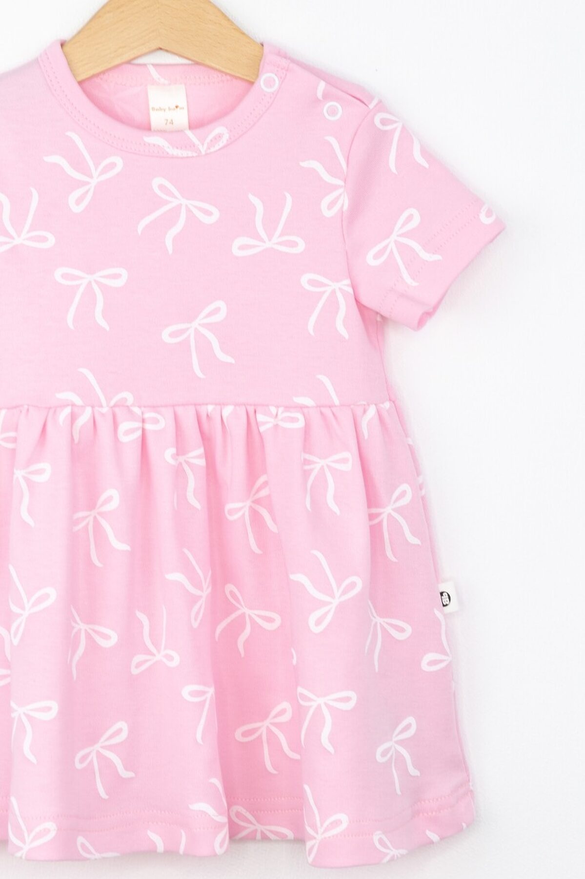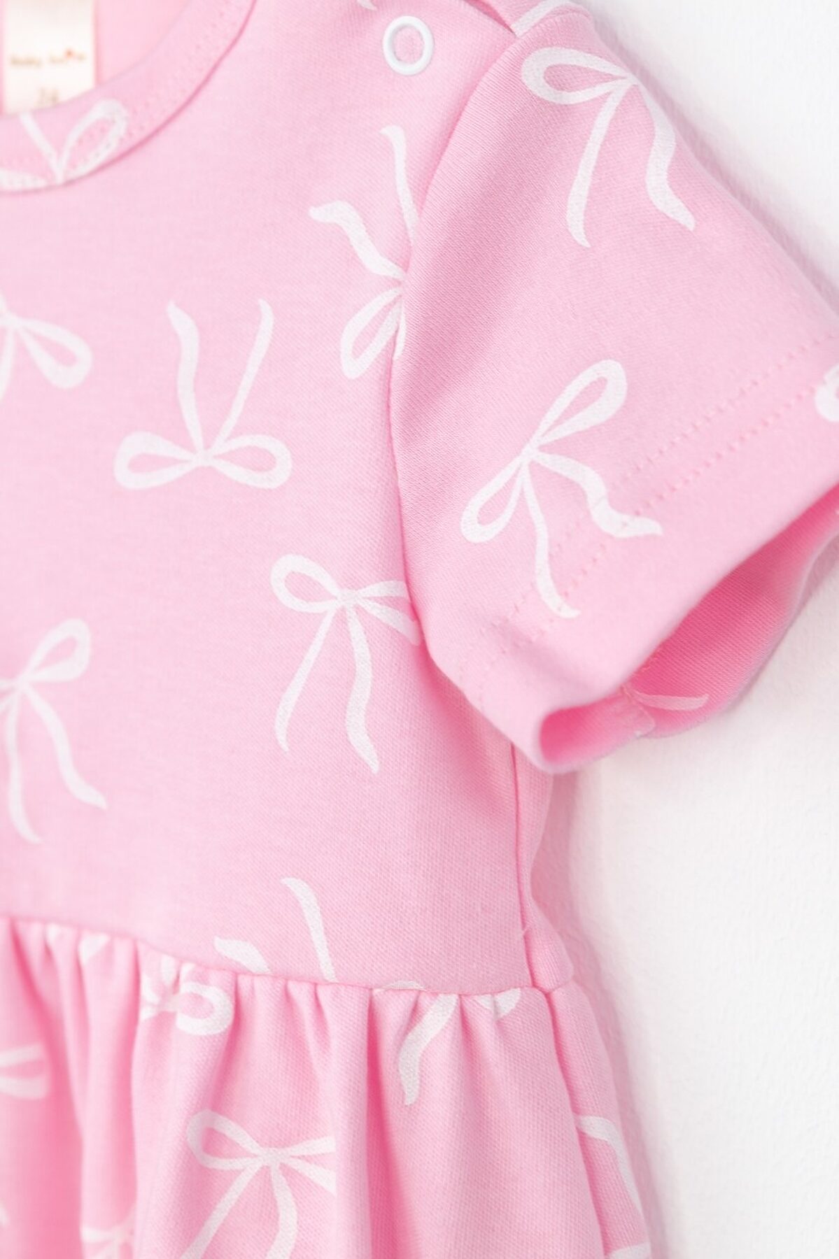 Платье с коротким рукавом, отрезное по линии талии, юбка присборена. Застежка на кнопках по плечу. Выполнено из набивного интерлока (100% хлопок).