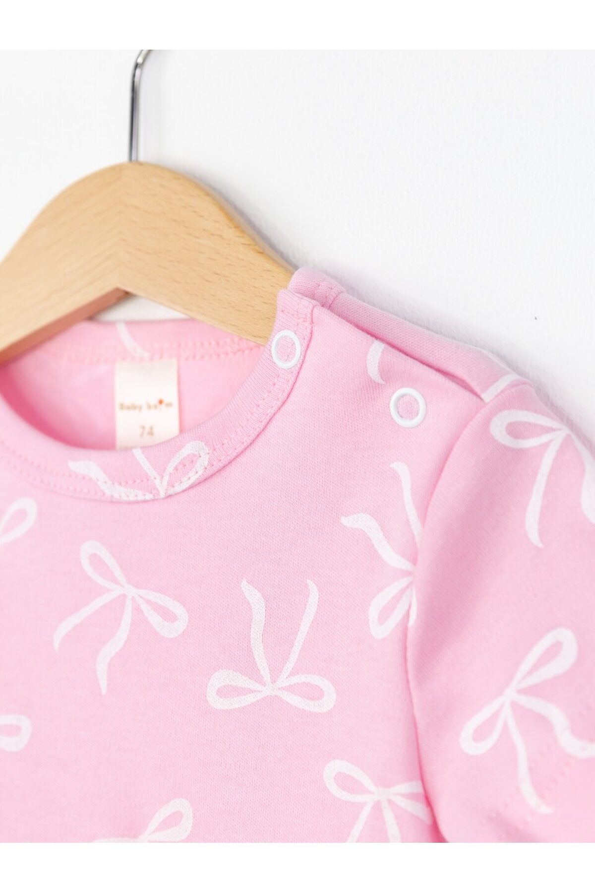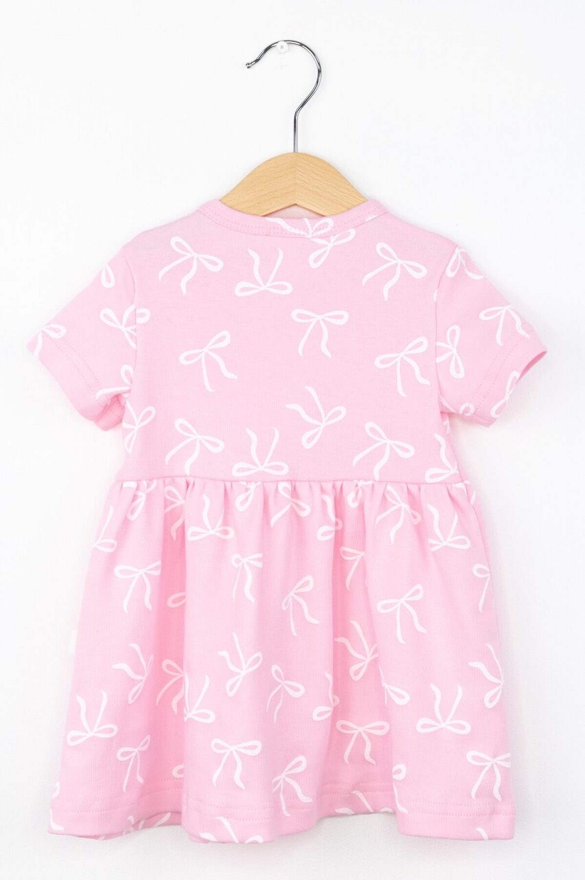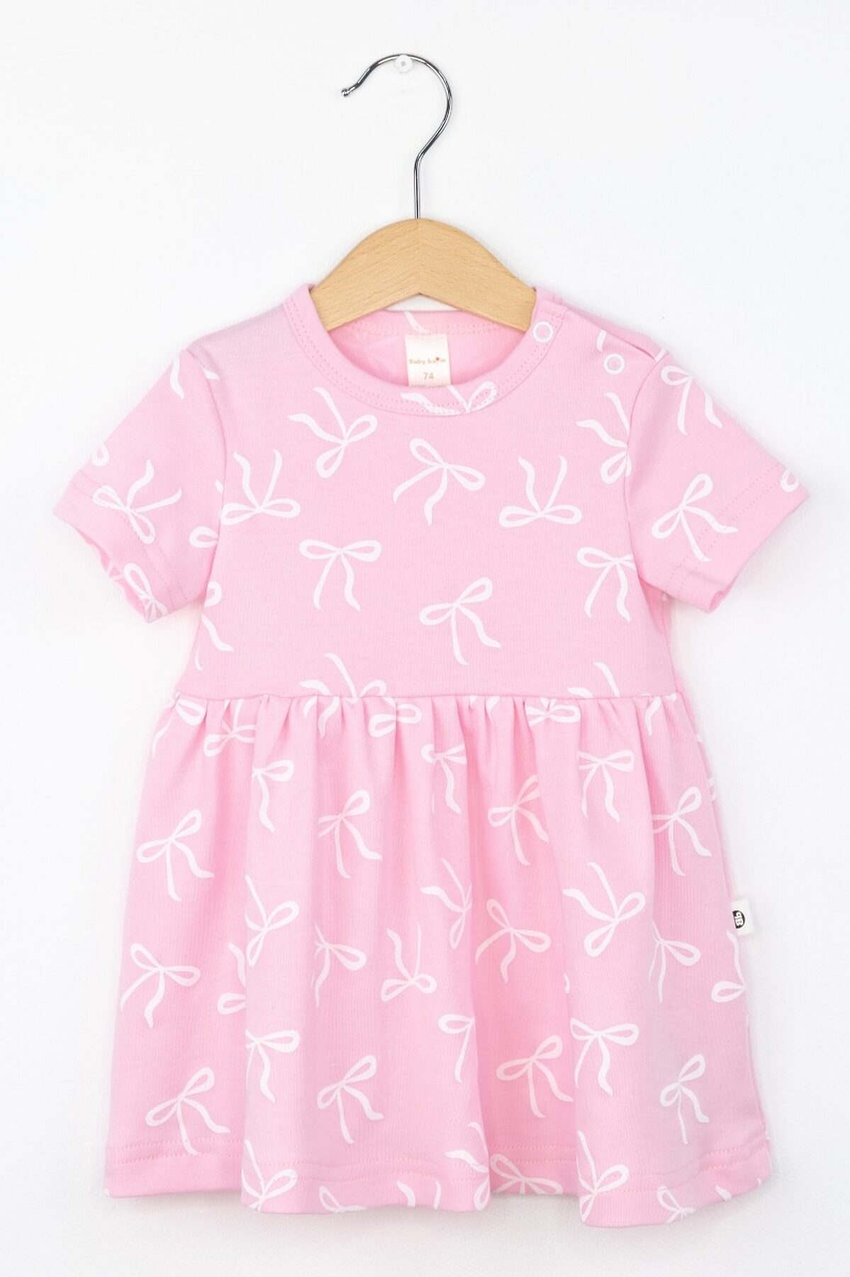 Платье с коротким рукавом, отрезное по линии талии, юбка присборена. Застежка на кнопках по плечу. Выполнено из набивного интерлока (100% хлопок).