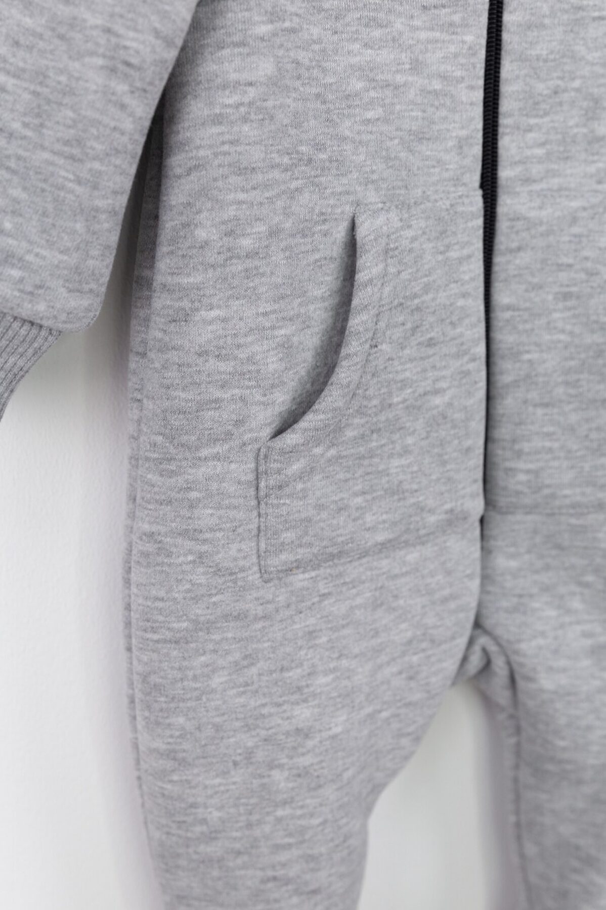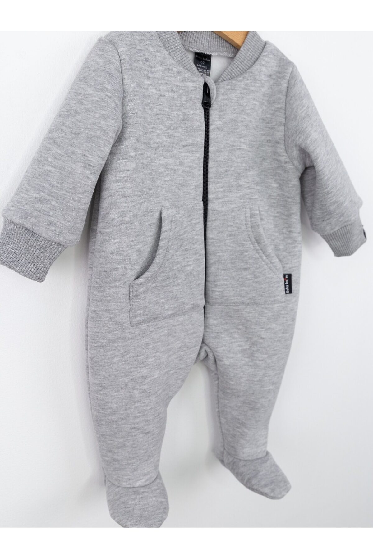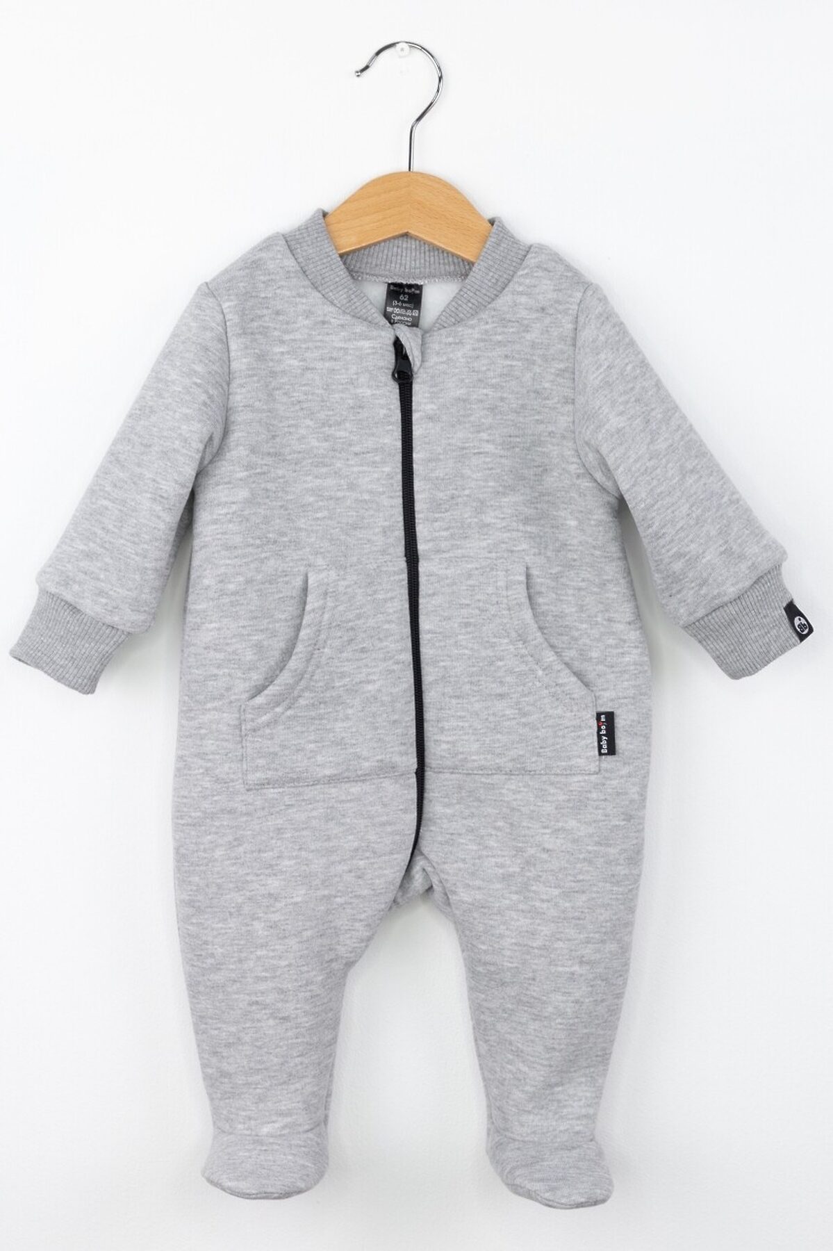 Теплый комбинезон на молнии, с карманом-кенгуру. Выполнен из футера 3-нитки с начесом (80% хлопок, 20% полиэстер), манжеты и воротник их кашкорсе, 95% хлопок, 5% эластан. Размеры 62 и 68 с закрытой стопой, 74-80 на манжете.