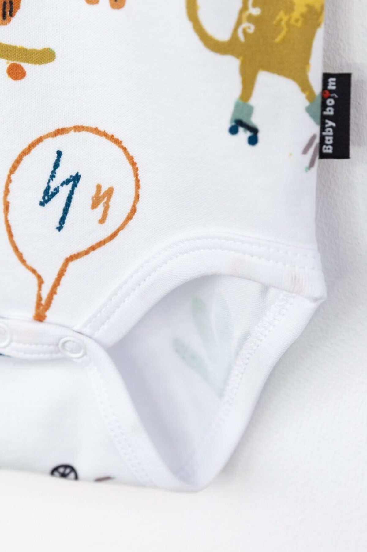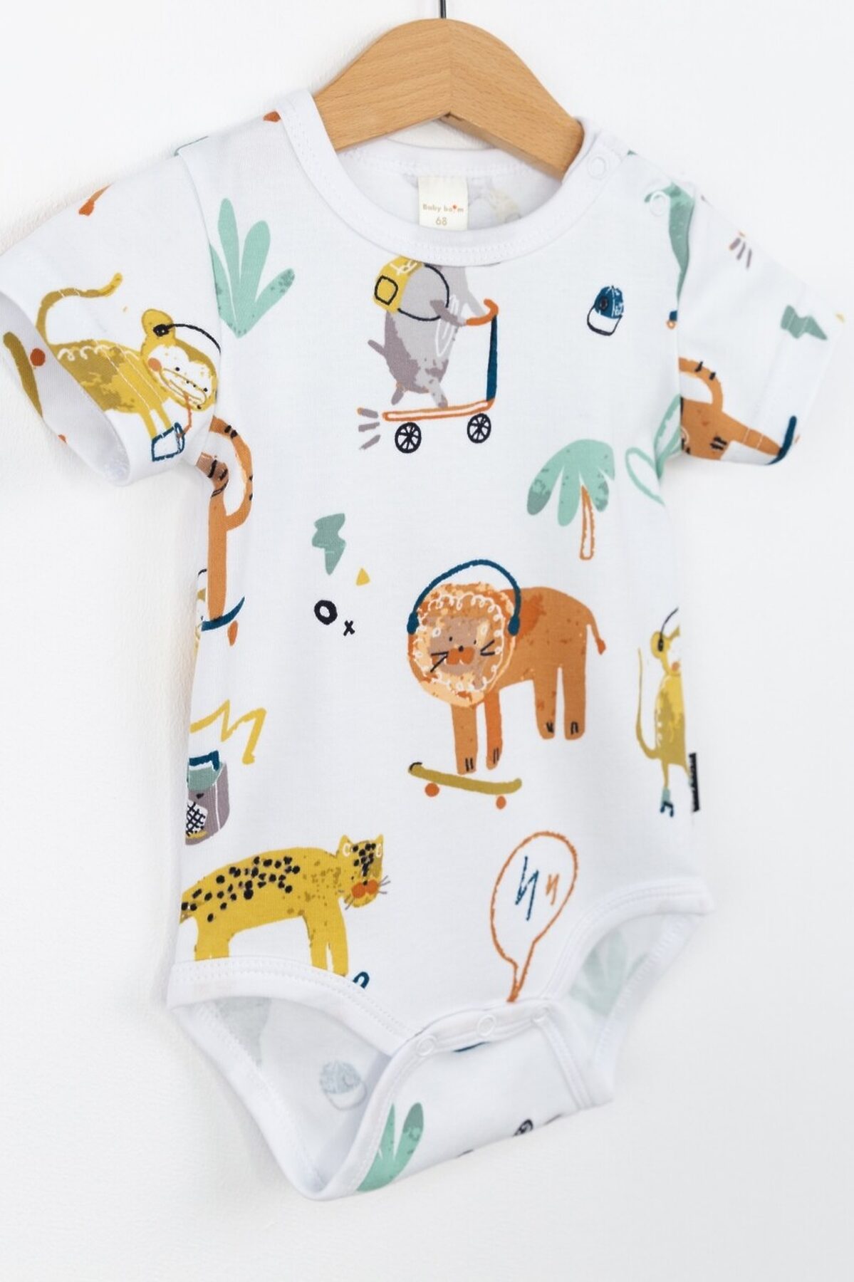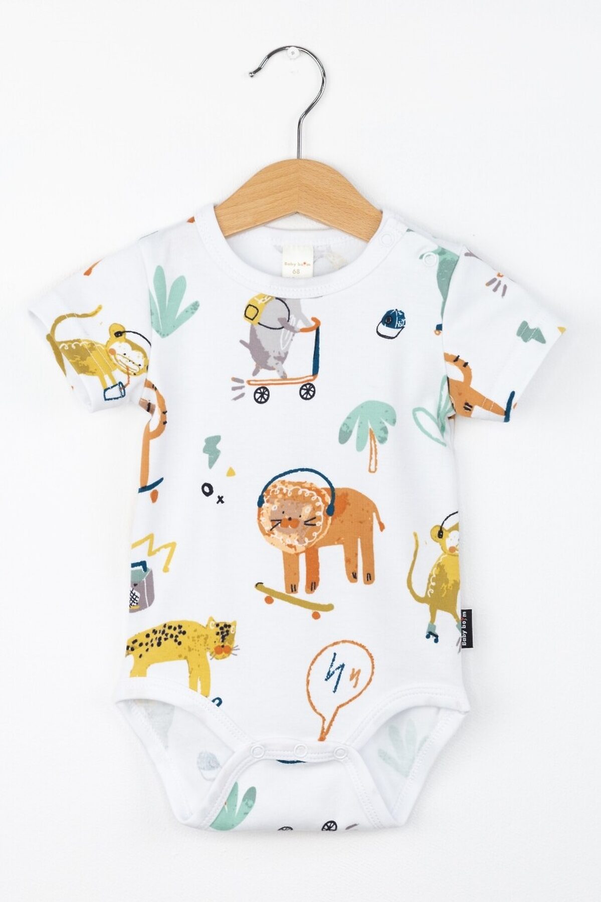 Боди с коротким рукквом из принтованного интерлока (100% хлопок). Застежка на плече и по низу изделия, горловина обработана контрастной бейкой.