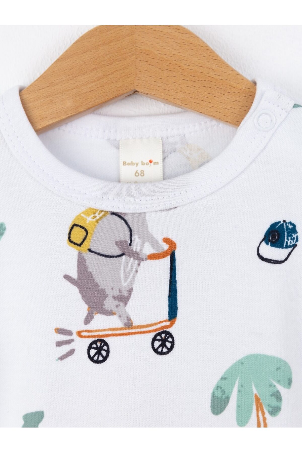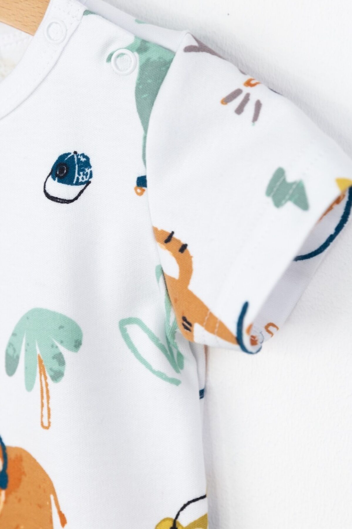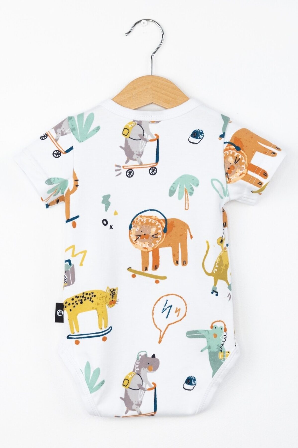 Боди с коротким рукквом из принтованного интерлока (100% хлопок). Застежка на плече и по низу изделия, горловина обработана контрастной бейкой.