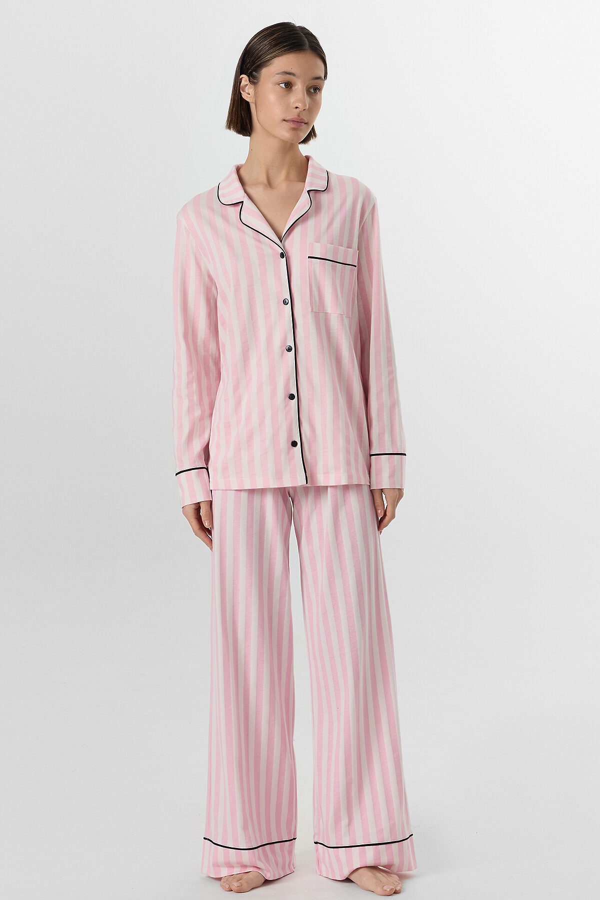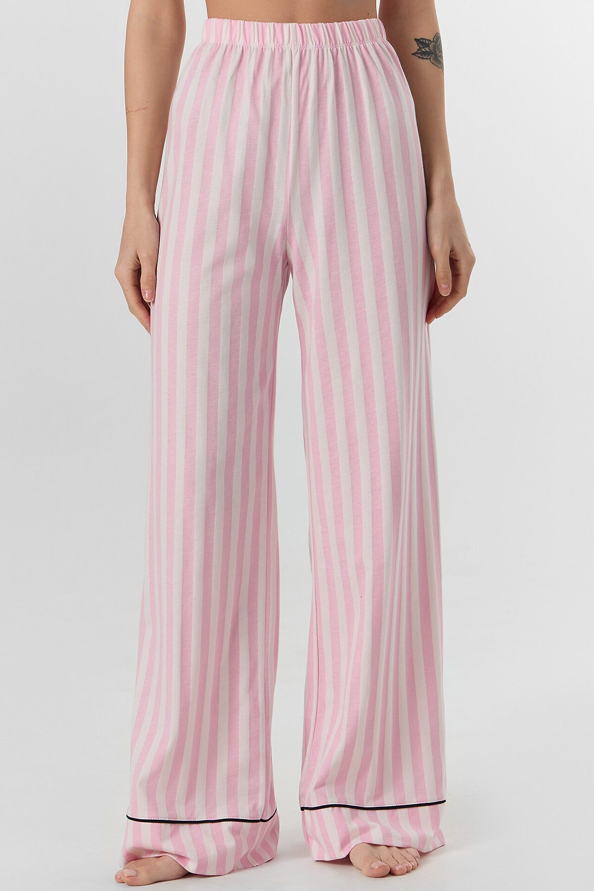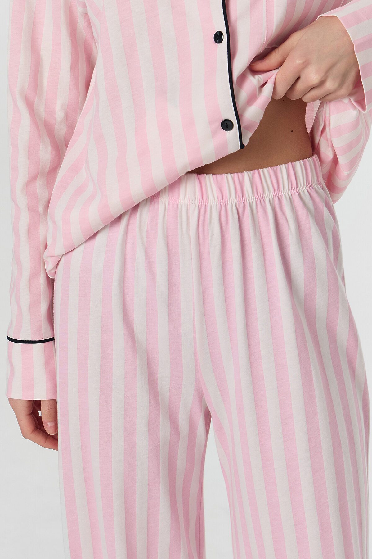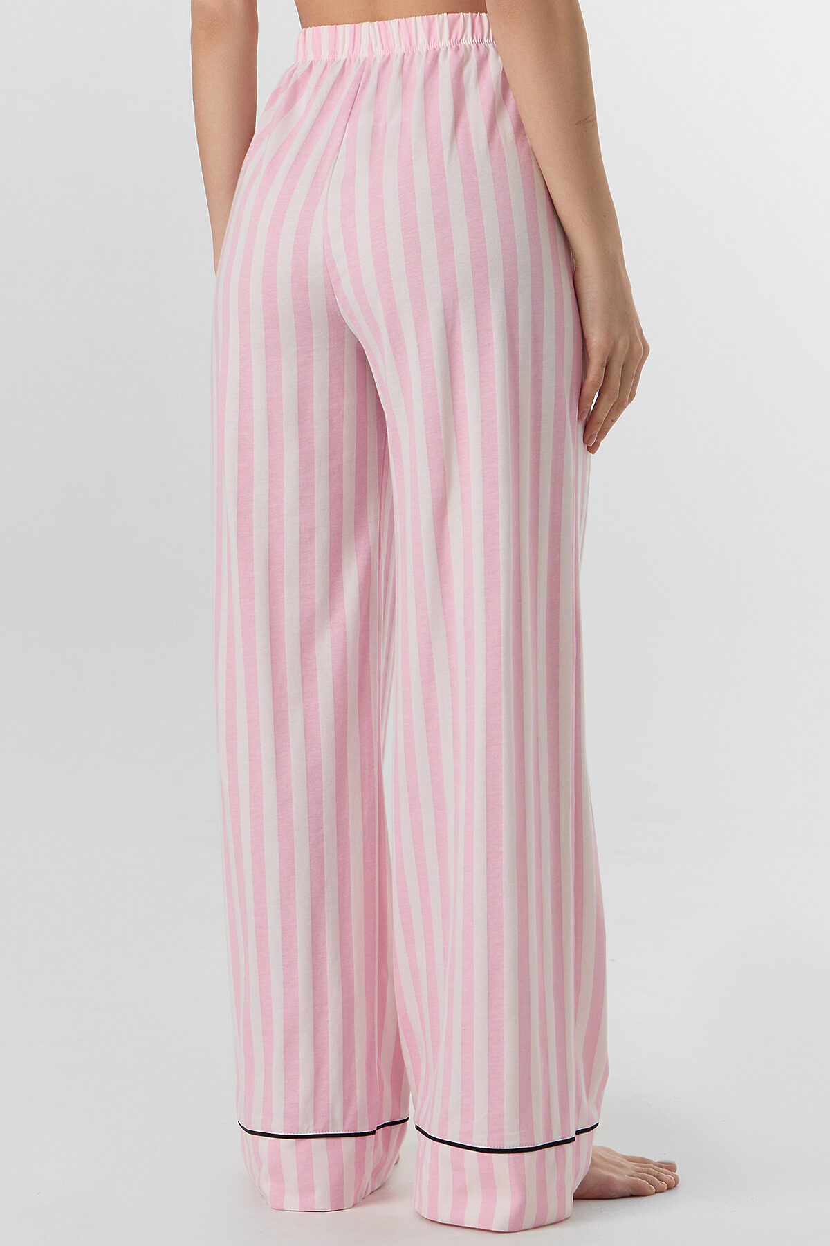 Брюки прямого свободного кроя с средней посадкой на талии создают максимальный комфорт. Широкий пояс со скрытой мягкой резинкой бережно облегает фигуру, не создавая давления, а элегантные отрезные манжеты по низу с контрастными кантами гармонично завершают образ. Пижама обладает исключительной мягкостью, не вызывает раздражения кожи, сохраняет форму после многократных стирок.