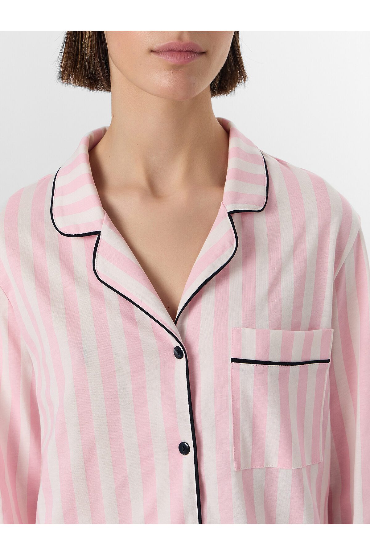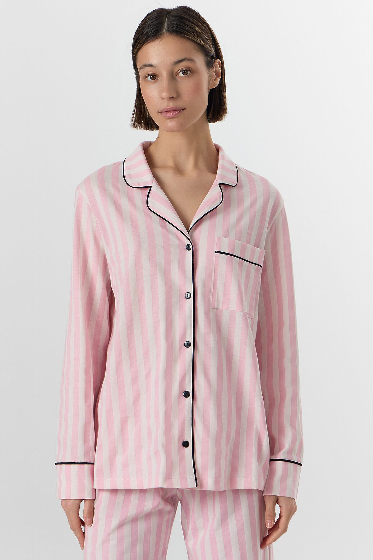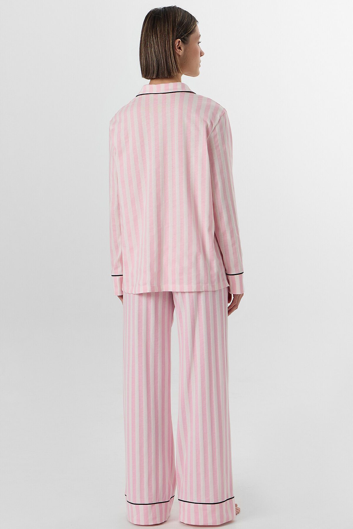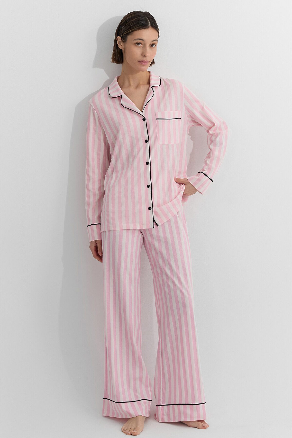 Брюки прямого свободного кроя с средней посадкой на талии создают максимальный комфорт. Широкий пояс со скрытой мягкой резинкой бережно облегает фигуру, не создавая давления, а элегантные отрезные манжеты по низу с контрастными кантами гармонично завершают образ. Пижама обладает исключительной мягкостью, не вызывает раздражения кожи, сохраняет форму после многократных стирок.